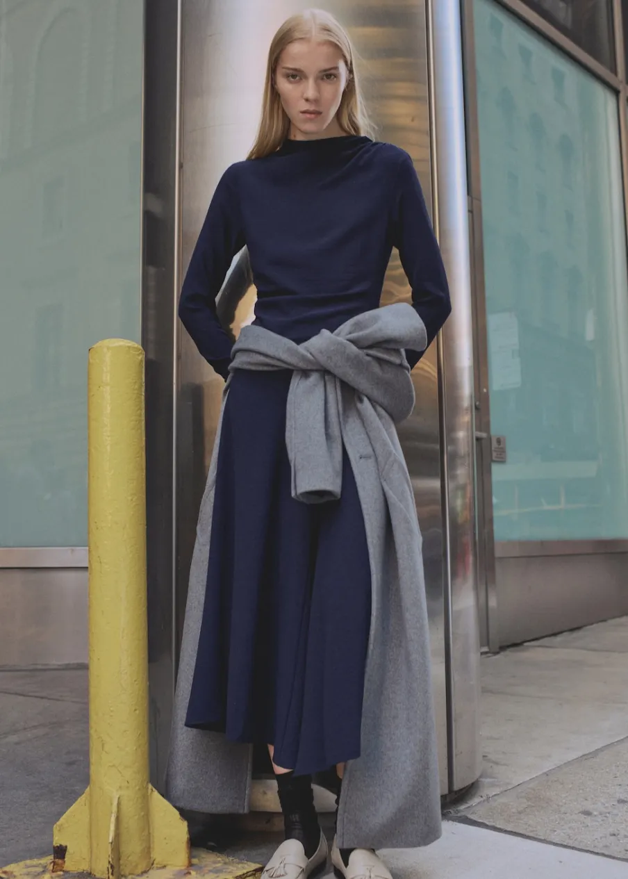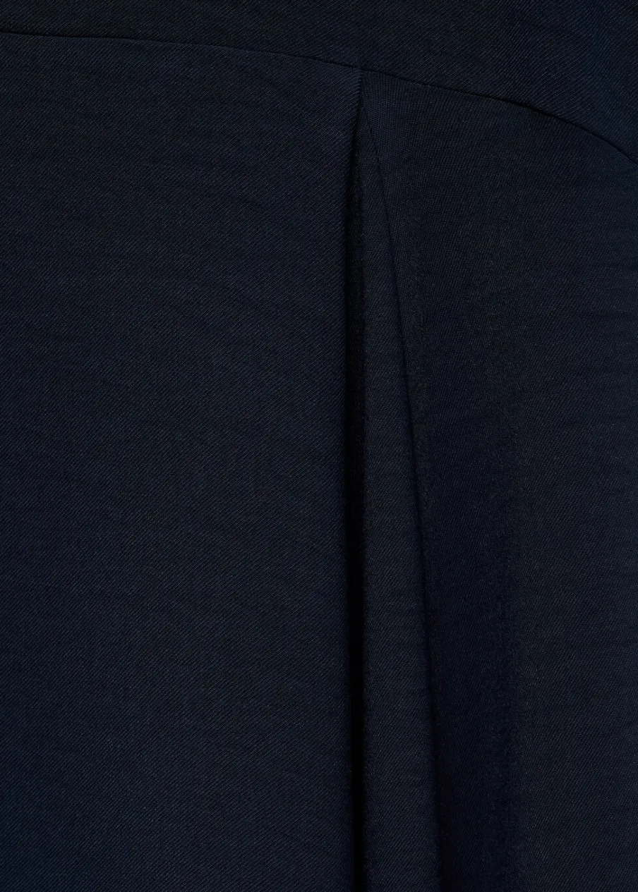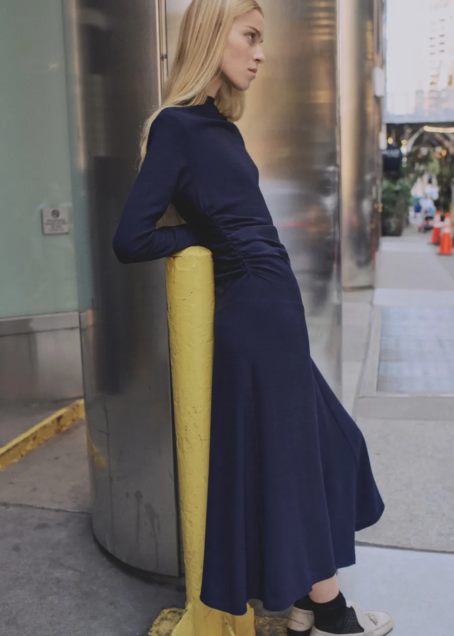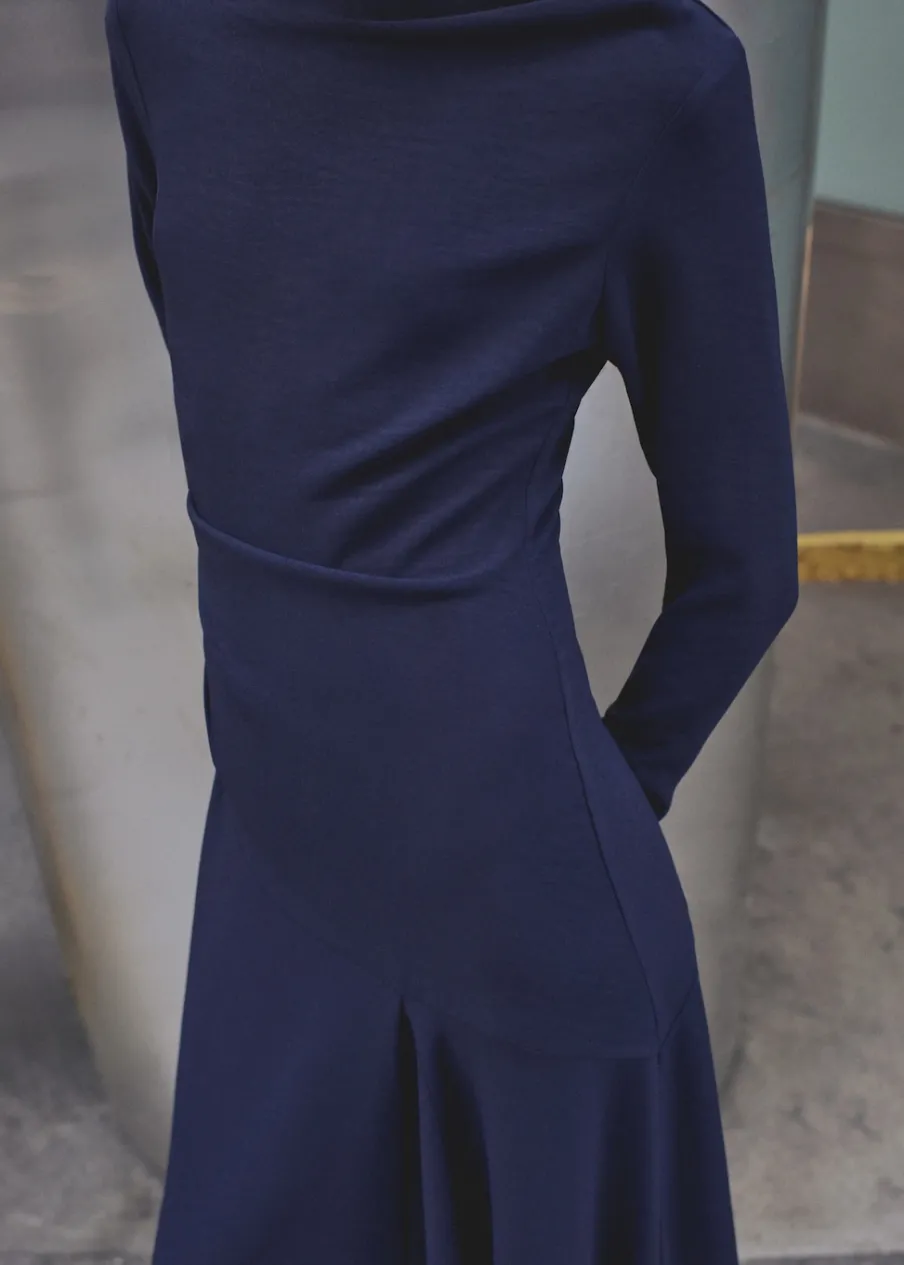 OpisCienka tkanina. Model evasé. Krój do kolan. Asymetryczny krój. Dekolt w kształcie łódki. Długi rękaw. Marszc…
