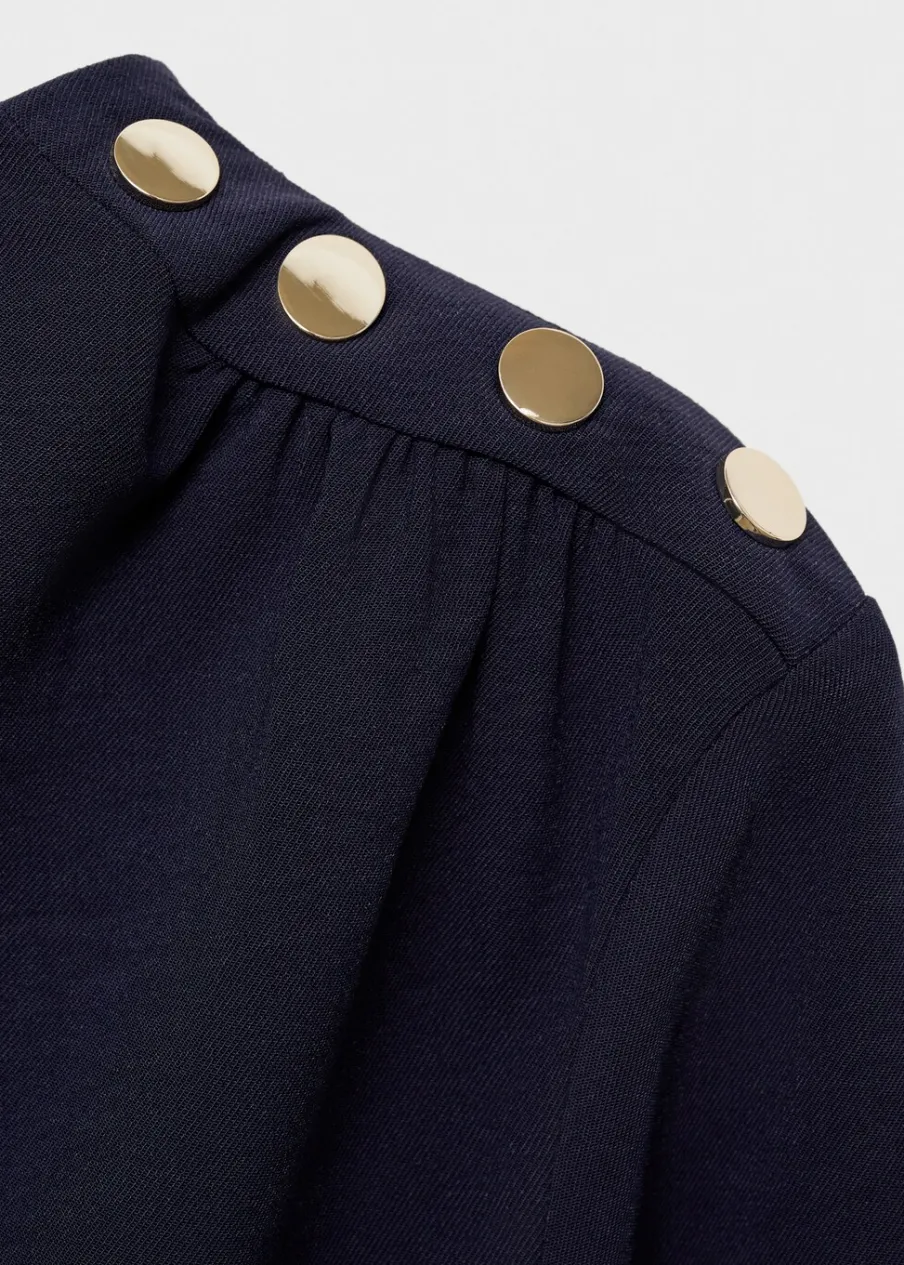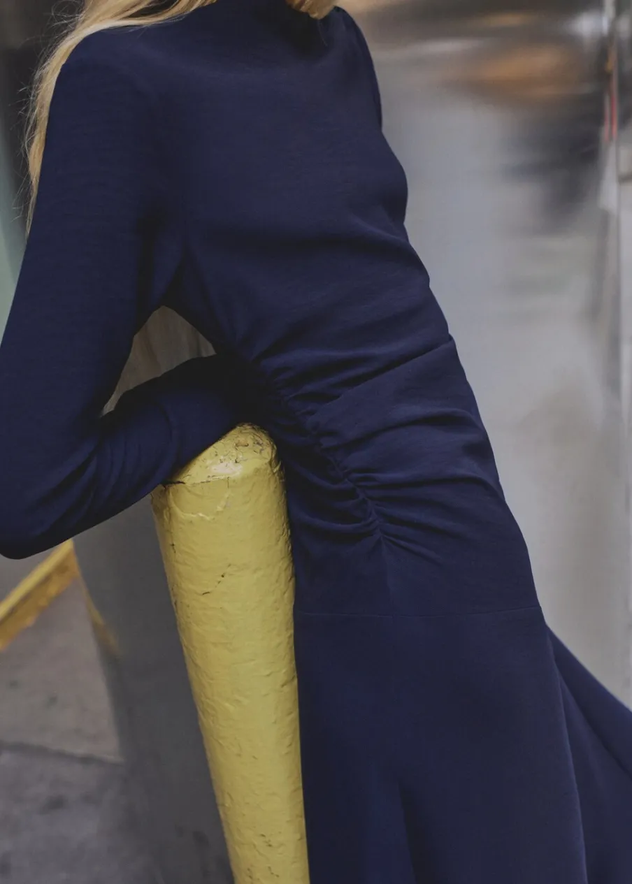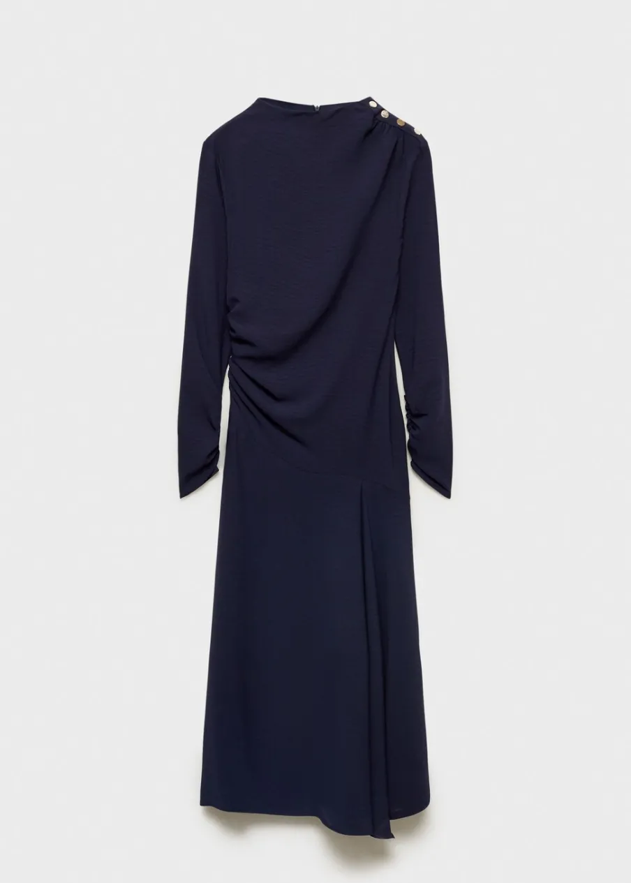 Cienka tkanina. Model evasé. Krój do kolan. Asymetryczny krój. Dekolt w kształcie łódki. Długi rękaw. Marszczona talia. Asymetryczny dół. Zapięcie z tyłu na suwak. Ozdobne guziki na ramieniu. Bez podszewki.