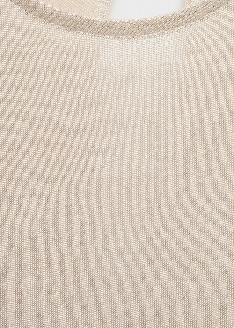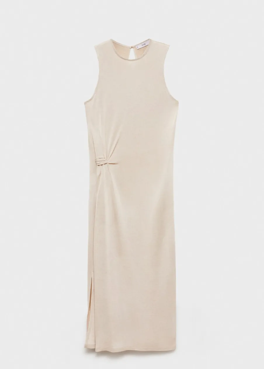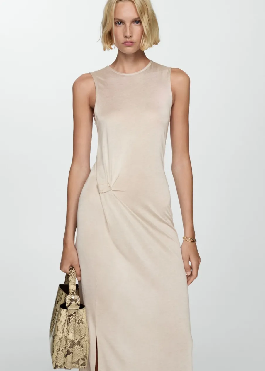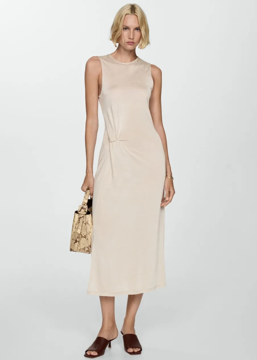 Tkanina z cienkiej dzianiny. Lejąca tkanina. Krój do kolan. Okrągły dekolt. Bez rękawów. Ozdobny węzeł. Zapięcie na guzik z tyłu. Model wcięty.