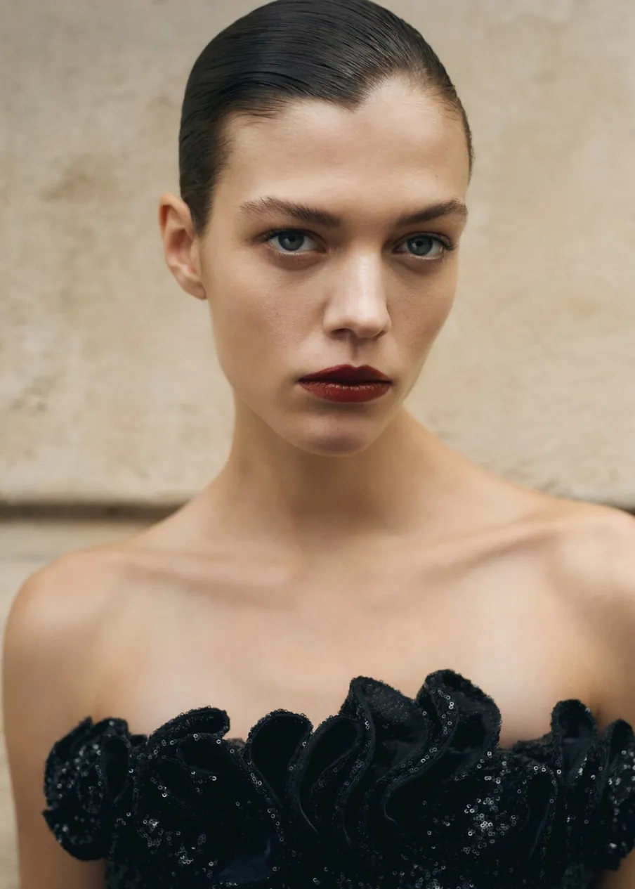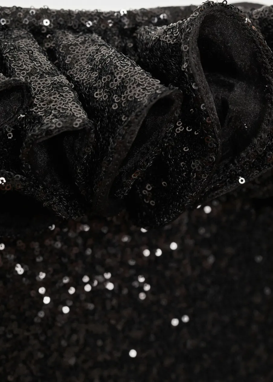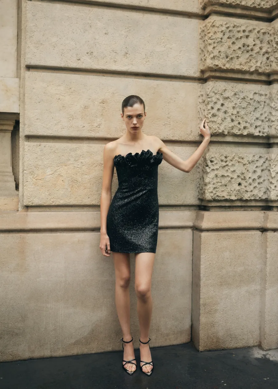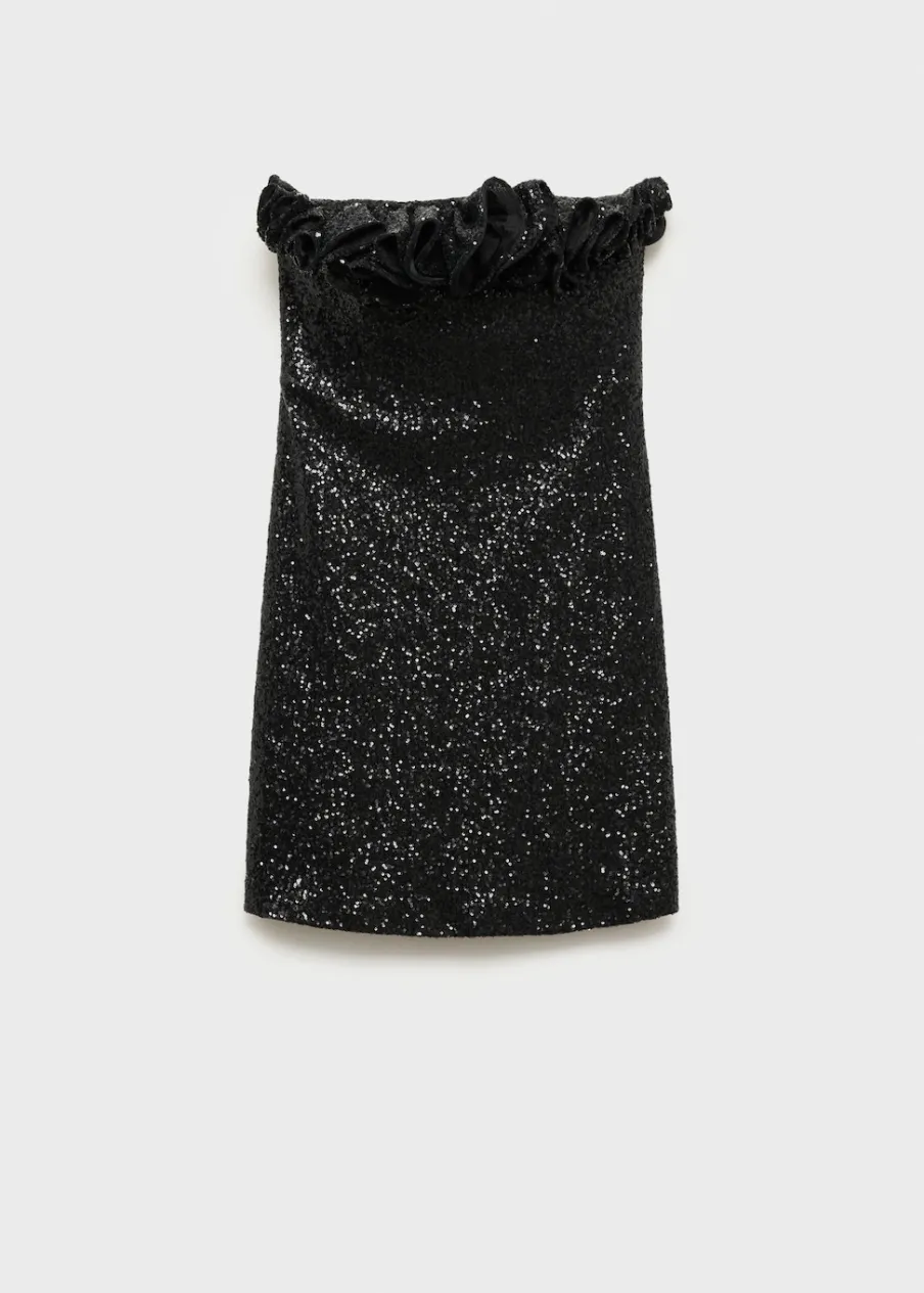 Średnia wielkość. Ten model z ozdobionym falbankami dekoltem bez ramiączek sprawi, że wyróżnisz się wyrafinowaną kreacją w wyjątkowe wieczory. Krótki fason i cekinowa tkanina gwarantują, że będziesz olśniewać przy każdym ruchu. Tkanina z cekinami. Model wcięty. Krótki krój. Duża falbana. Bez zapięcia. Wyprodukowano w Portugalii. Kolekcja wizytowa. Artykuły z kolekcji CAPSULE można wymienić lub zwrócić w ciągu 14 dni od daty wysyłki. Zapięcie z tyłu. Slim-fit. Bez rękawów. Tylko podszewka. Dekolt bez ramiączek.