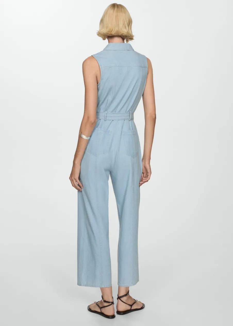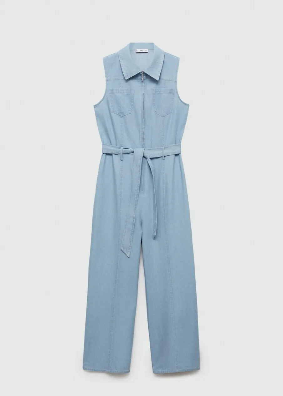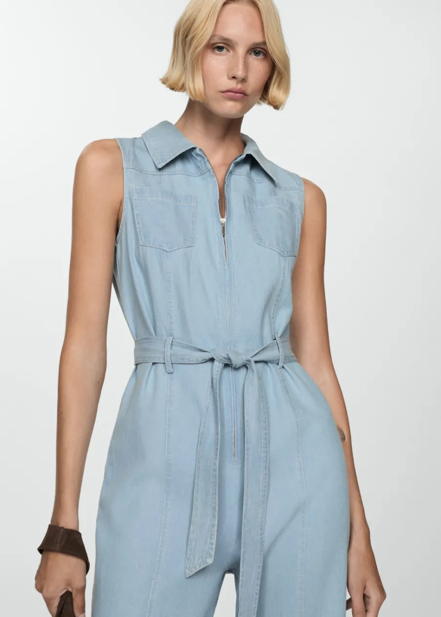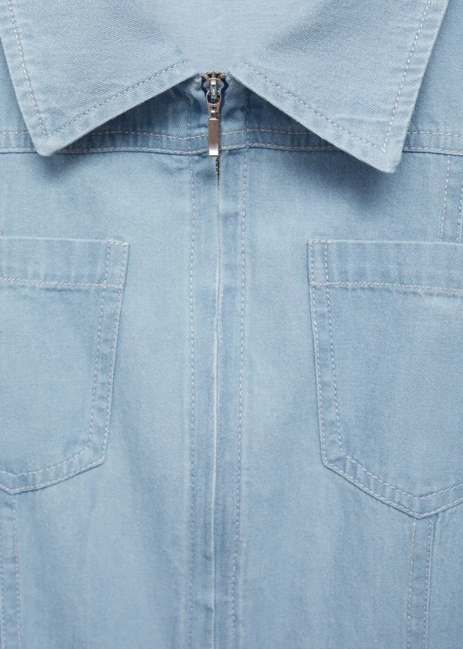 Tkanina bawełniana w dżinsowym stylu. Model prosty. Model długi. Koszulowy kołnierz. Bez rękawów. Dwie kieszenie naszyte na piersi. Szlufki. Zapięcie na zamek z przodu. Regulowany pasek.