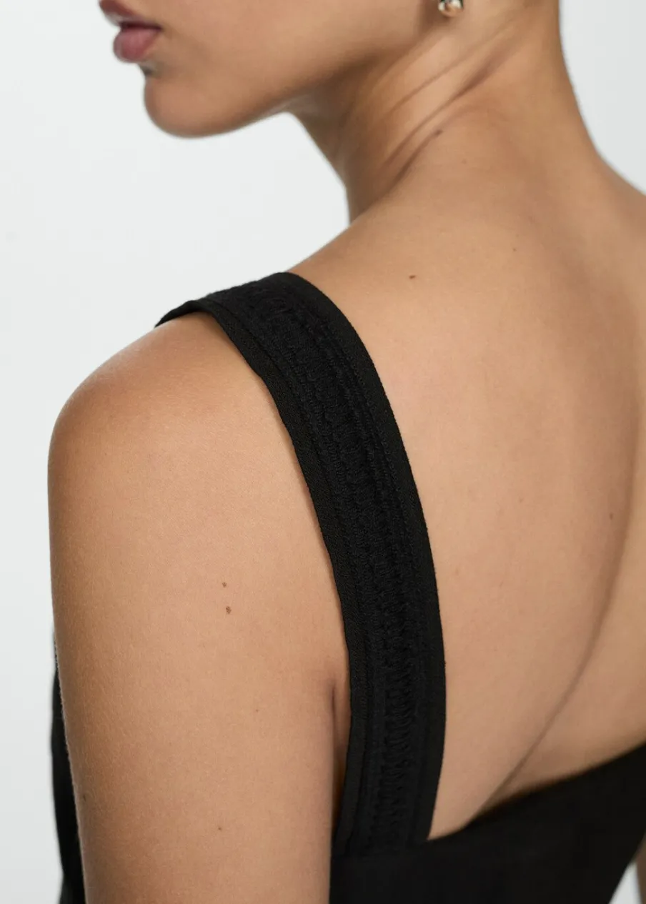 Lejąca tkanina. Model prosty. Model długi. Kwadratowy dekolt. Bez rękawów. Cienkie ramiączka. Kryte zapięcie na suwak z boku.