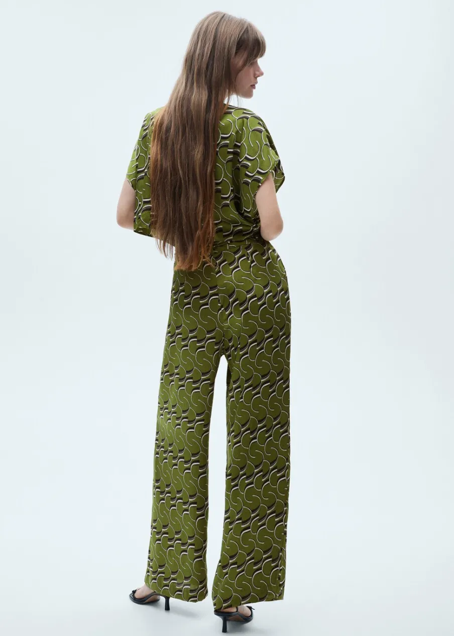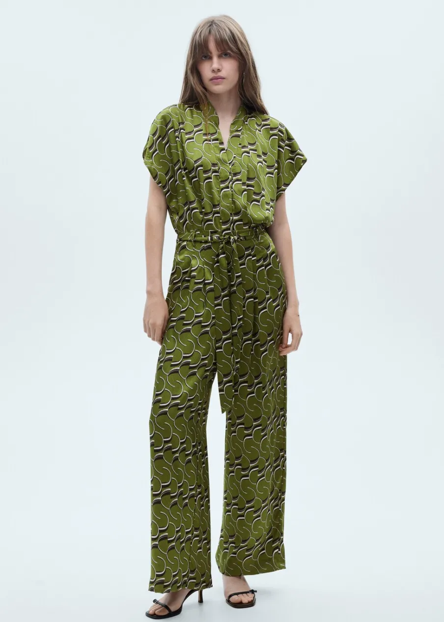 Lejąca tkanina. Satynowa tkanina. Model długi. Model prosty. Nadruk. Kołnierzyk koszulowy w szpic. Krótki rękaw. Szlufki. Zapięcie w formie paska w talii. Modelka ma 178 cm wzrostu i nosi rozmiar S/36.