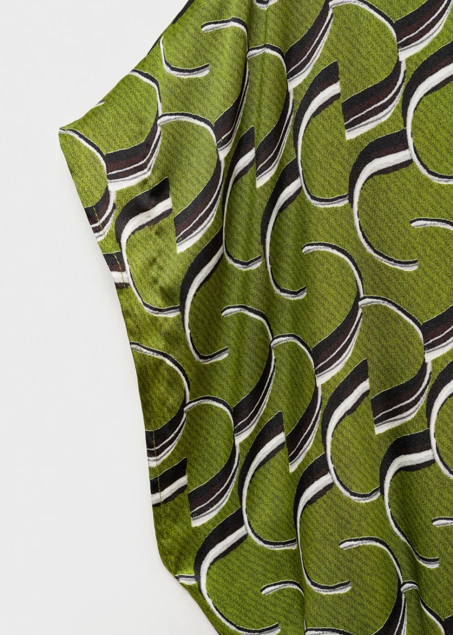 OpisLejąca tkanina. Satynowa tkanina. Model długi. Model prosty. Nadruk. Kołnierzyk koszulowy w szpic. Krótki rękaw…
