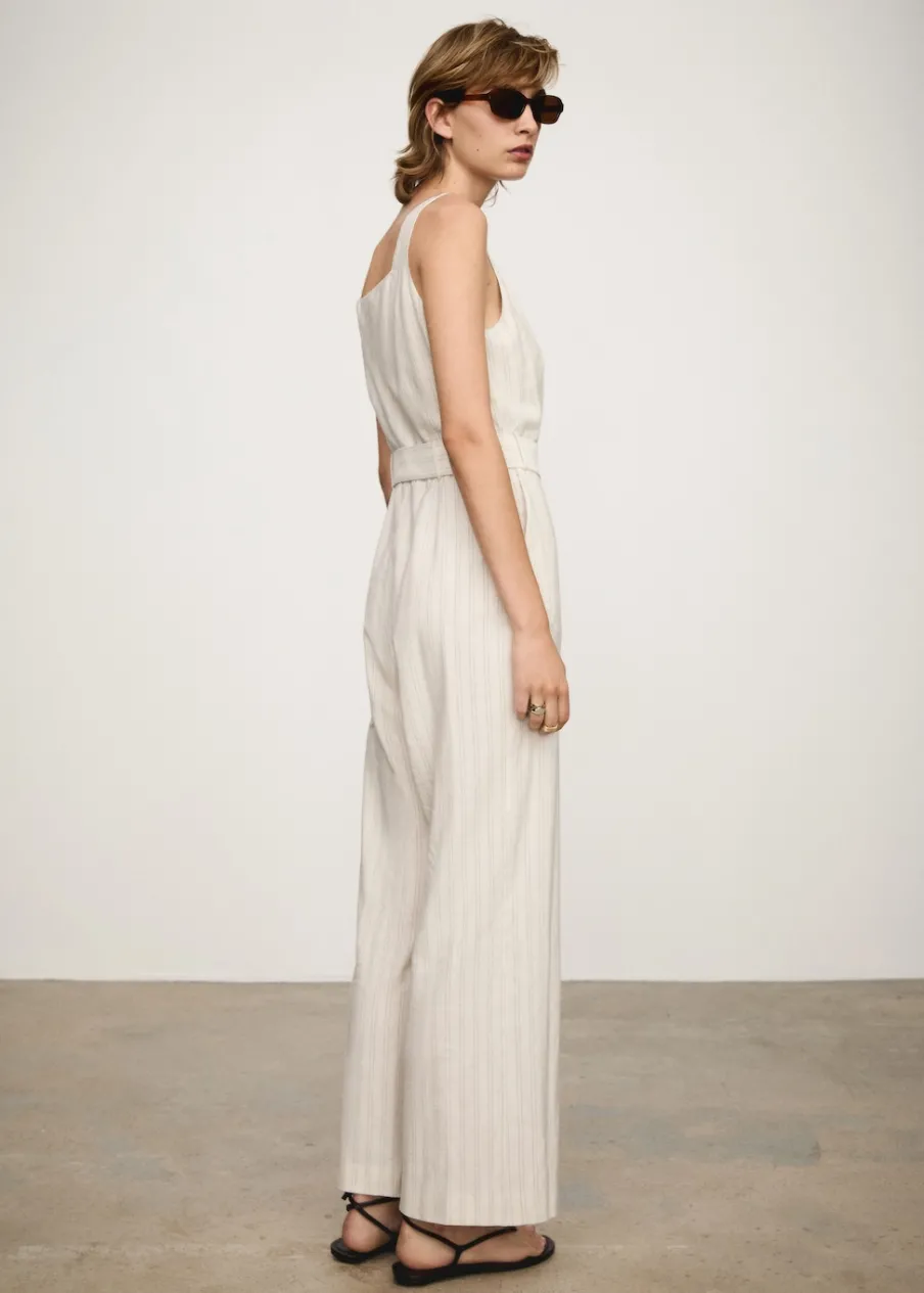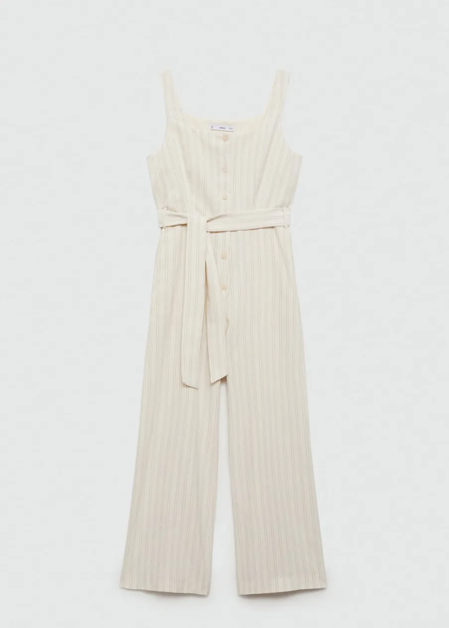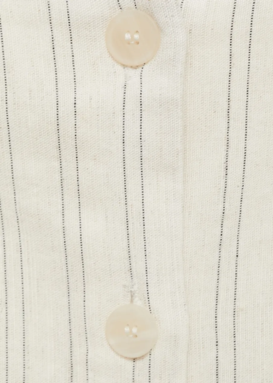 Tkanina mieszanka bawełny i lnu. Model długi. Model prosty. Okrągły dekolt. Szerokie ramiączka. Szlufki. Regulowane wiązanie w talii. Wzór w paski. Zapięcie na guziki z przodu.