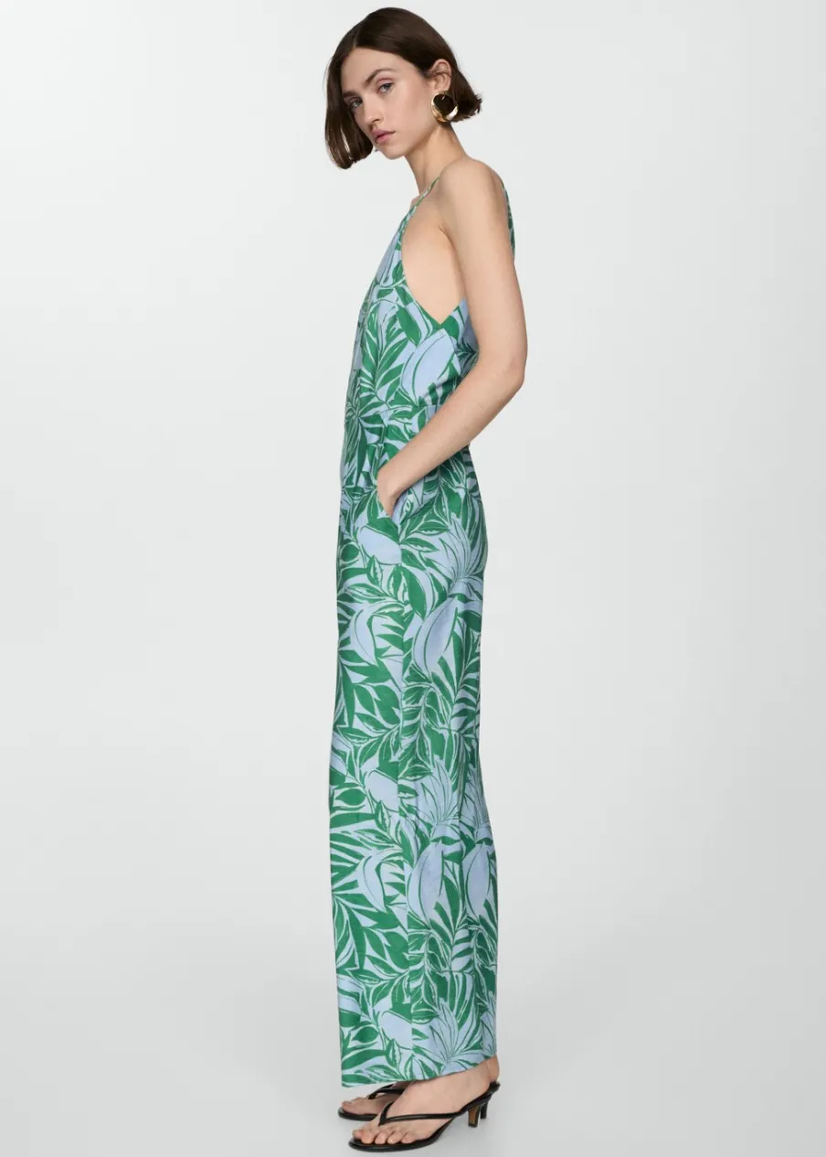 Lejąca tkanina. Model długi. Model prosty. Kwiatowy wzór. Okrągły dekolt. Bez rękawów. Cienkie ramiączka. Dwie kieszenie boczne. Zapięcie na guzik z tyłu. Zapięcie z tyłu na kryty suwak.