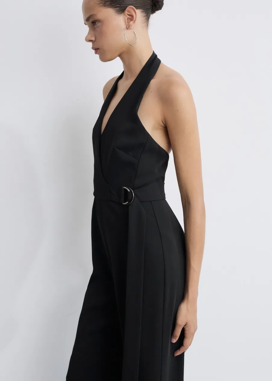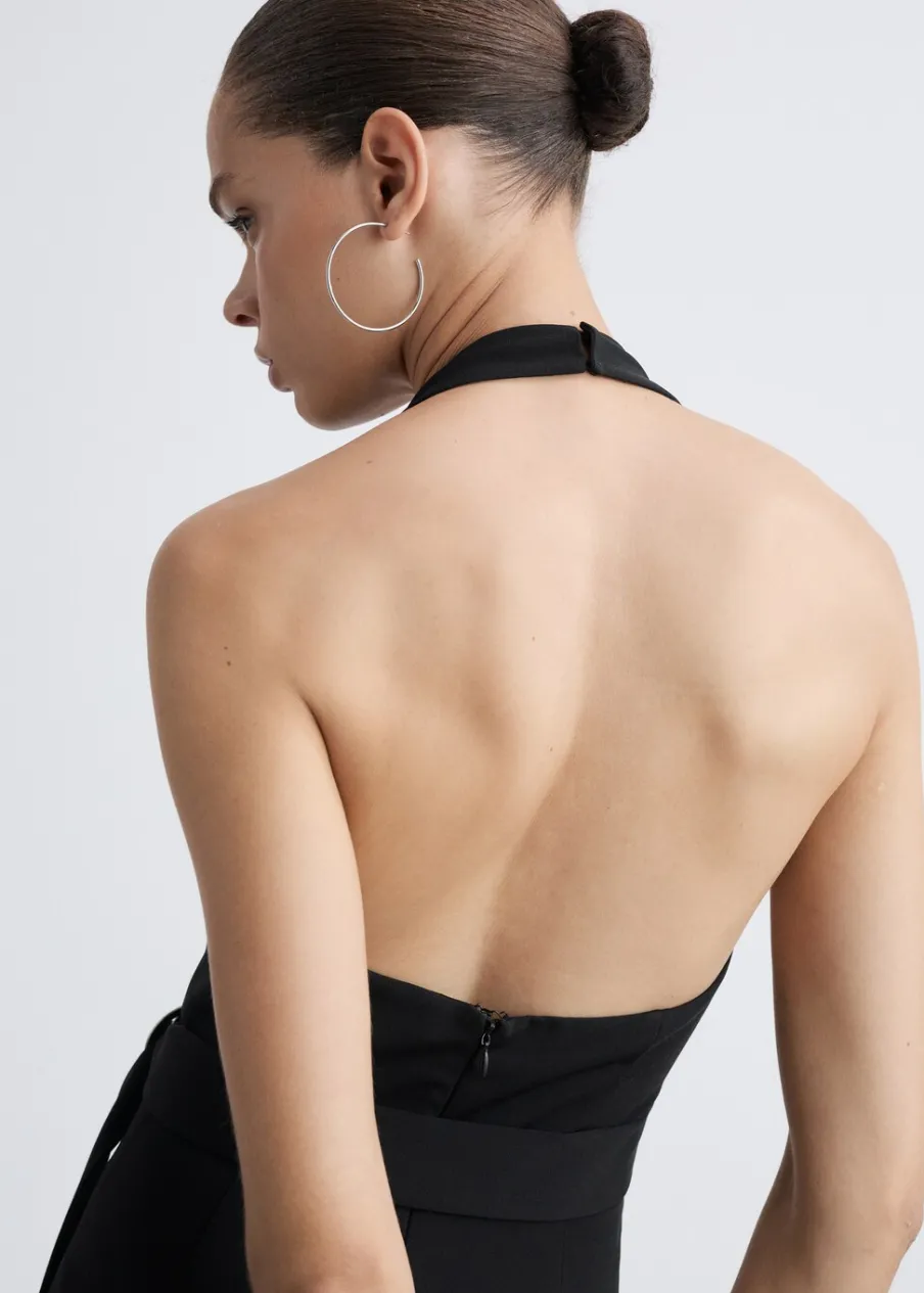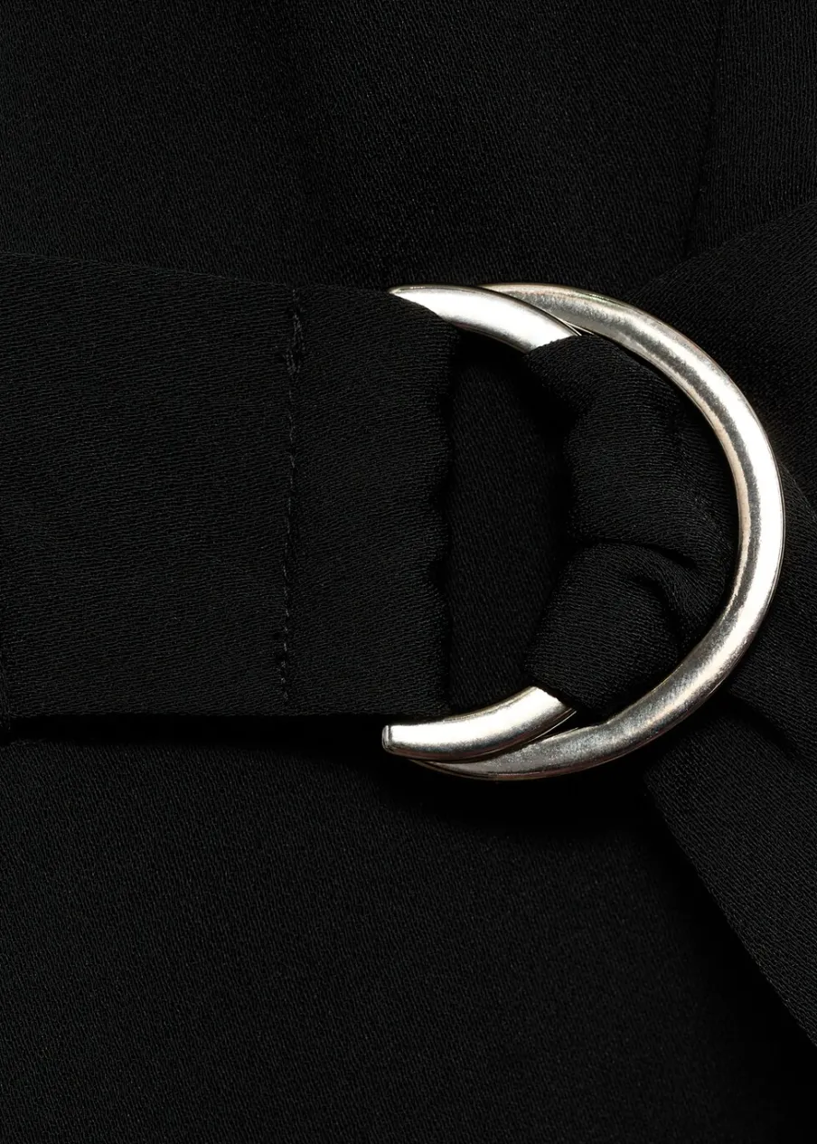 Lejąca tkanina. Model długi. Model zakładany. Dekolt w stylu halter. Szerokie ramiączka. Bez rękawów. Zapięcie z tyłu na guziki. Regulowany pasek. Zapięcie na klamrę. Metalowy element. Wyłącznie online. Model wcięty.