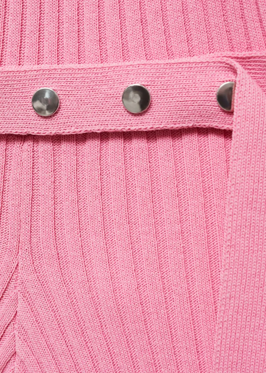 Tkanina z cienkiej dzianiny. Krótki krój. Dekolt V. Bez rękawów. Cienkie ramiączka. Bez zapięcia. Dekoracyjny pasek. Ozdobne guziki. Model wcięty.