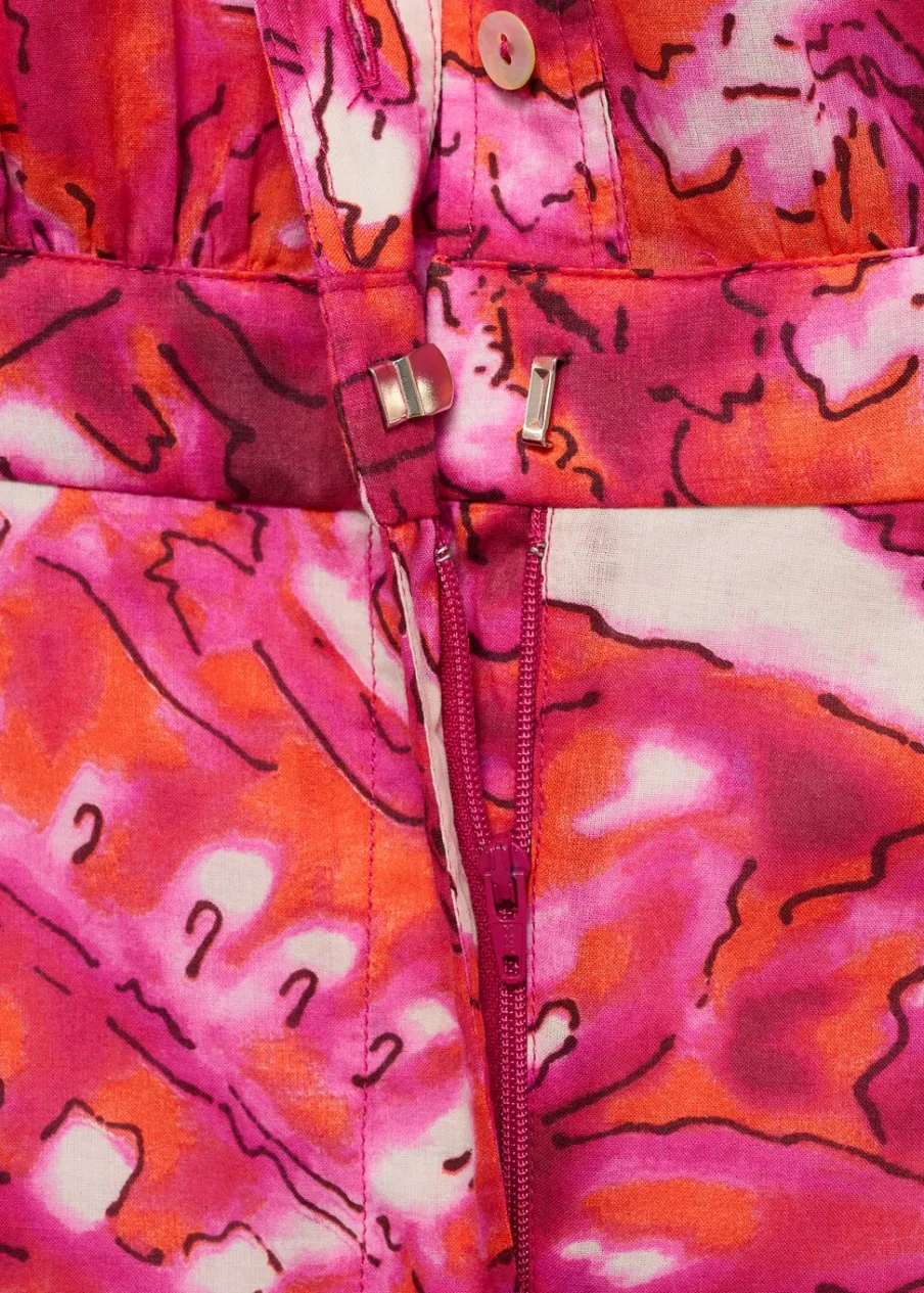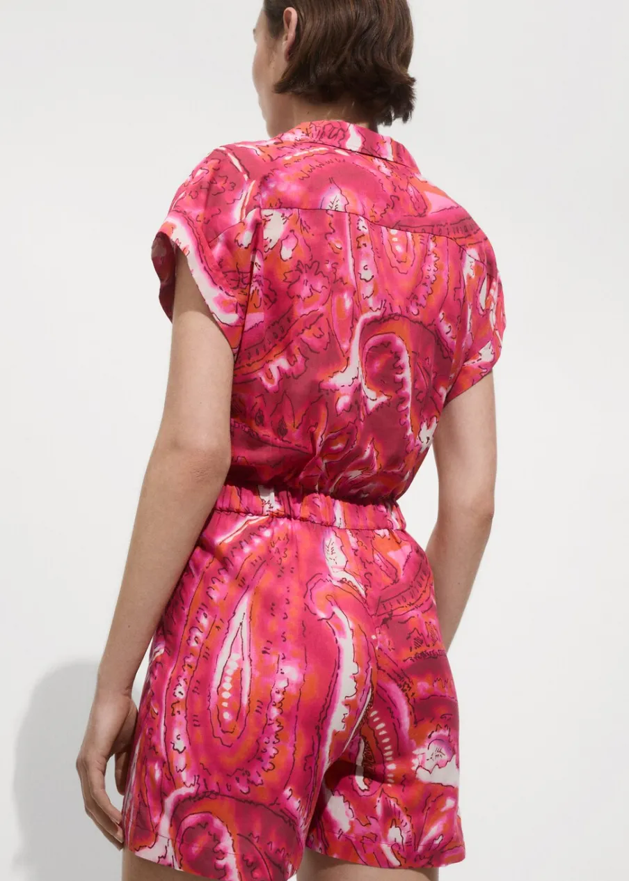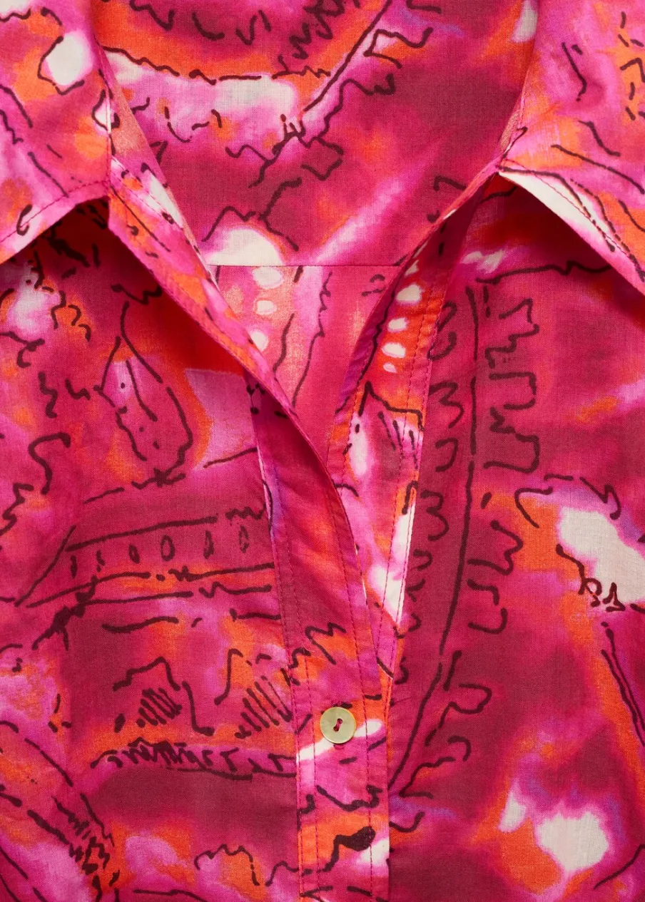 Krótki krój. Model prosty. Koszulowy kołnierz. Krótki rękaw. Kryte zapięcie na guzik, haftkę i suwak. Tkanina z 100% bawełny. Nadruk. Zapięcie na guziki z przodu.