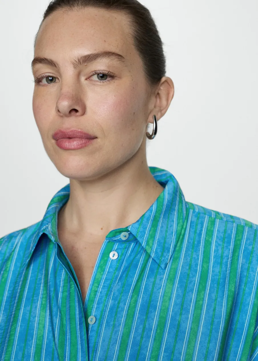 OpisLejąca tkanina. Model długi. Model prosty. Wzór w pasy. Koszulowy kołnierz. Krótki rękaw. Zapięcie na regulow…