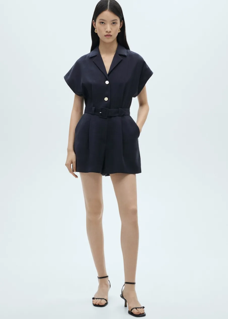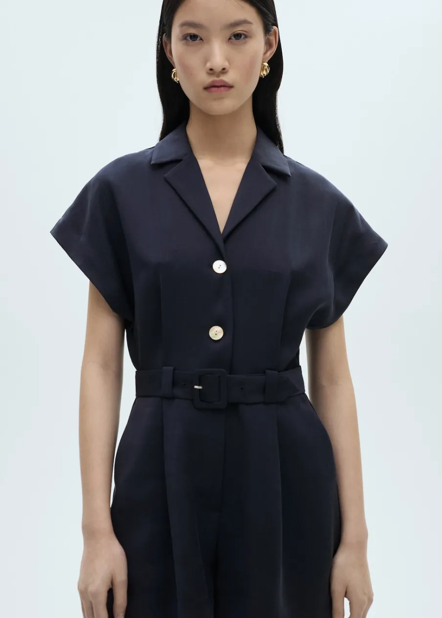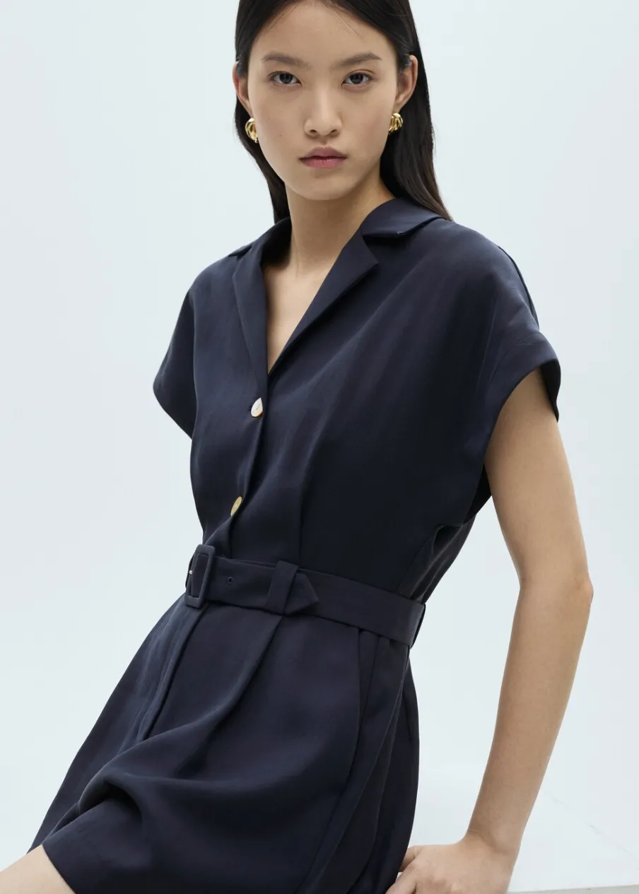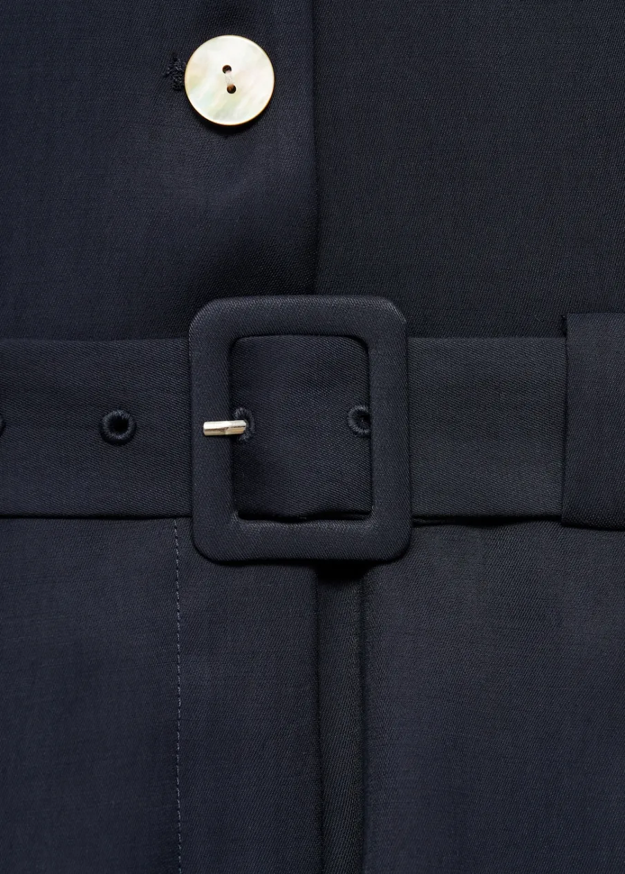 Lejąca tkanina. Model prosty. Krótki krój. Dekolt w szpic z kołnierzykiem. Krótki rękaw. Zapięcie z przodu na guziki. Pasek odpinany w pasie.