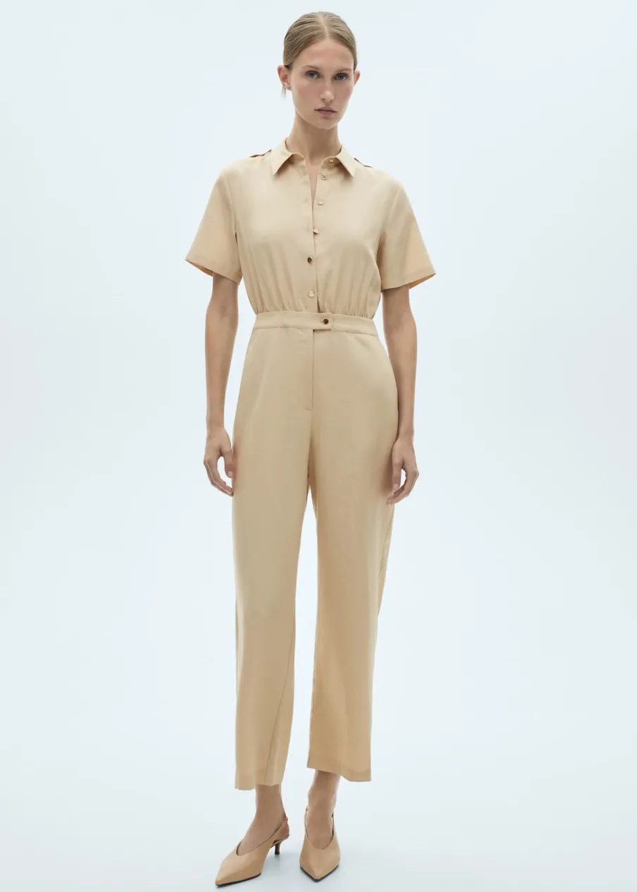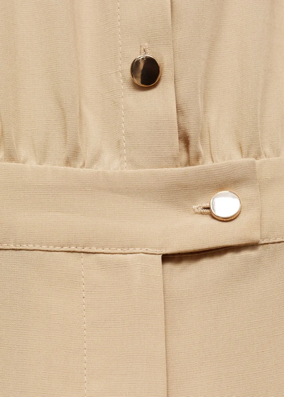 Tkanina mieszana z lyocellem. Lejąca tkanina. Model długi. Zapięcie z przodu na guziki. Metalowe guziki. Zapięcie na suwak i guzik. Model prosty. Modelka ma 177 cm wzrostu i nosi rozmiar S/36. Koszulowy kołnierz. Krótki rękaw.