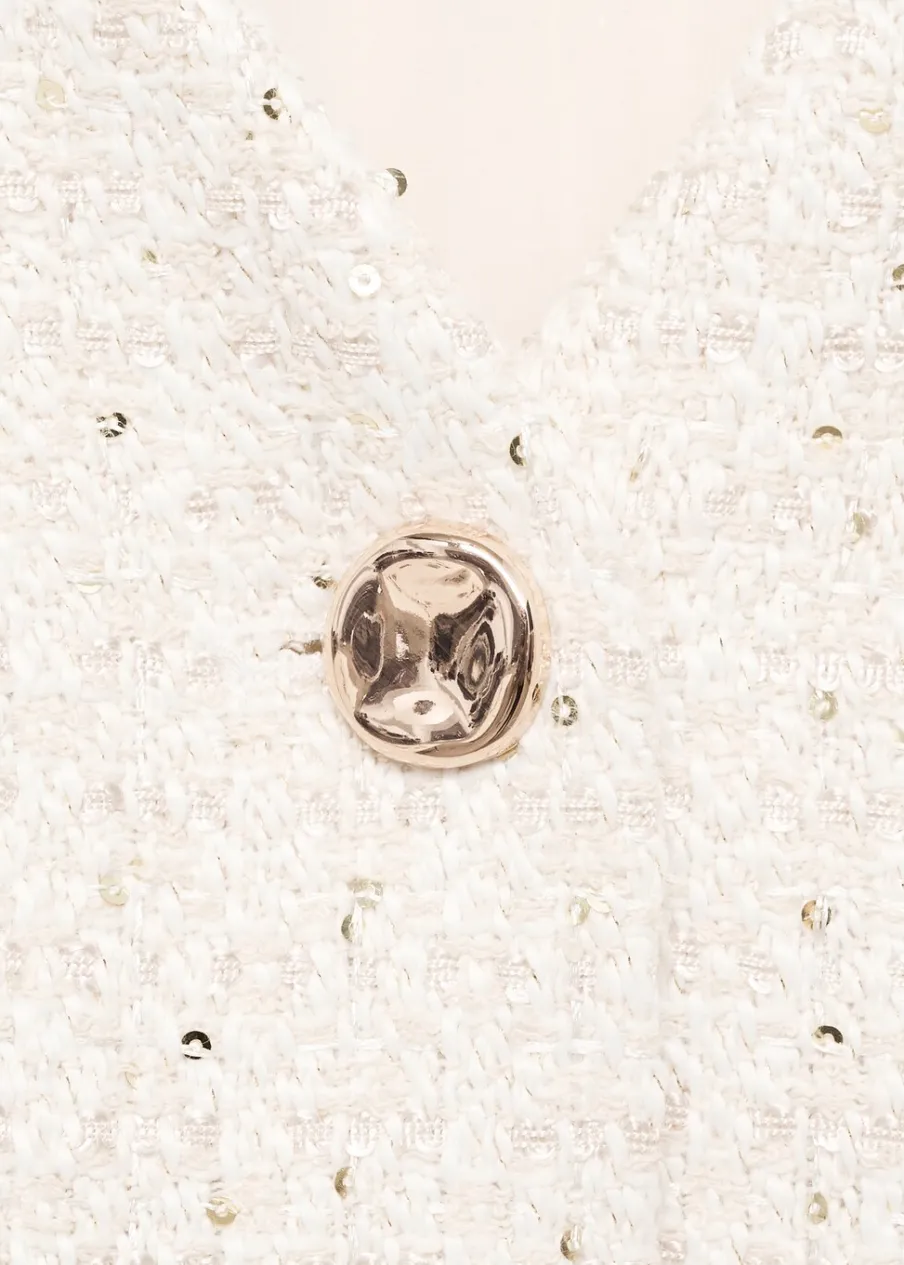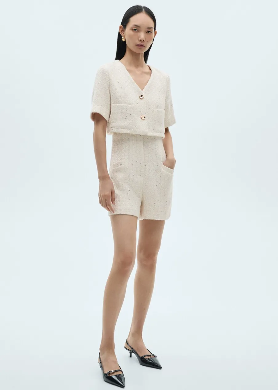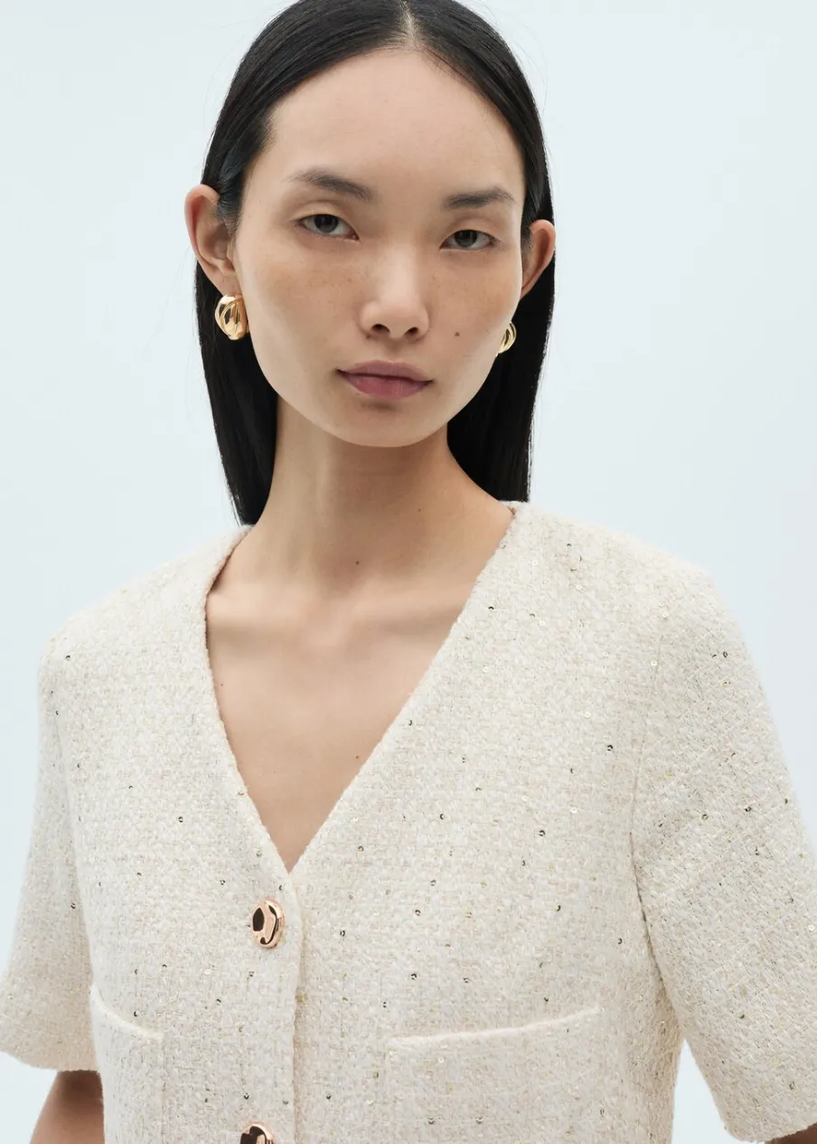 Tkanina tweedowa. Model prosty. Krótki krój. Dekolt V. Krótki rękaw. Dwie wpuszczene kieszenie z przodu. Dwie kieszenie naszyte na piersi. Zapięcie z przodu na guziki. Wewnętrzna podszewka.