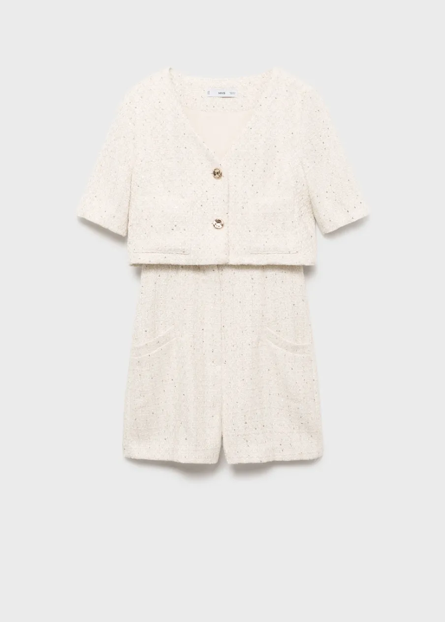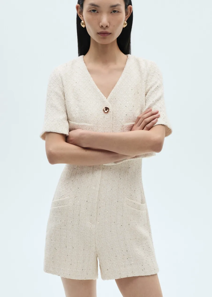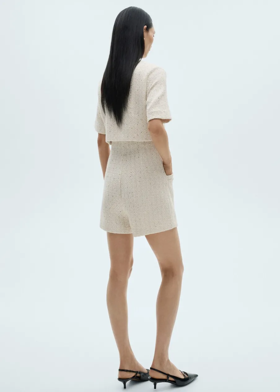 Tkanina tweedowa. Model prosty. Krótki krój. Dekolt V. Krótki rękaw. Dwie wpuszczene kieszenie z przodu. Dwie kieszenie naszyte na piersi. Zapięcie z przodu na guziki. Wewnętrzna podszewka.