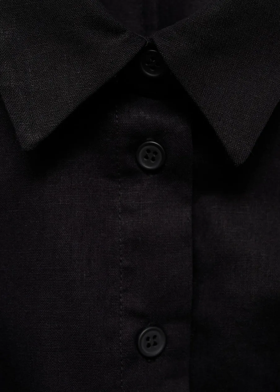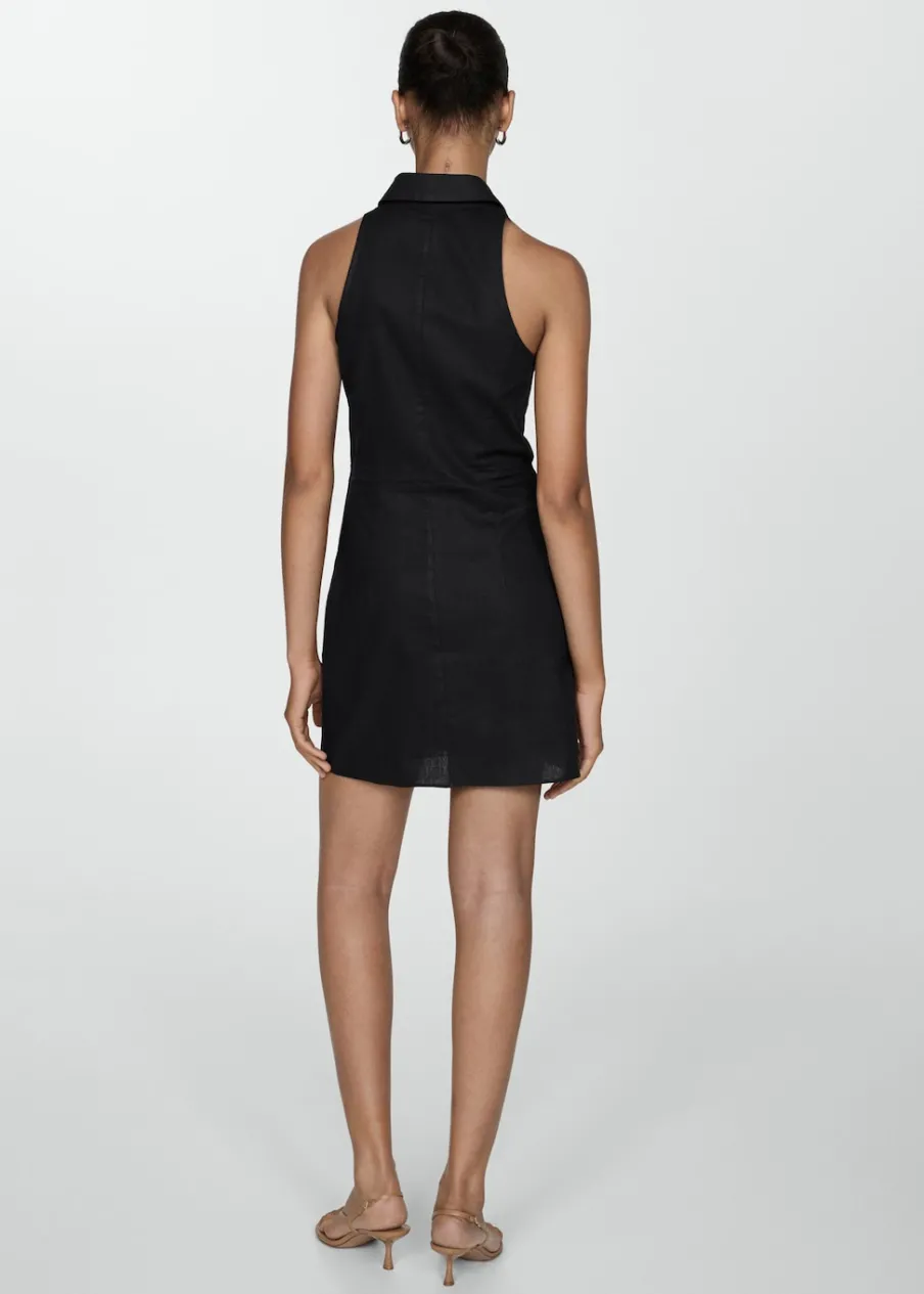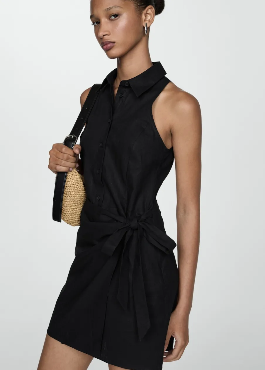Tkanina mieszana z ramii i bawełny. Krótki krój. Model prosty. Model zakładany. Koszulowy kołnierz. Bez rękawów. Zapięcie na węzełek. Zapięcie na guziki z przodu. Wzór w paski.