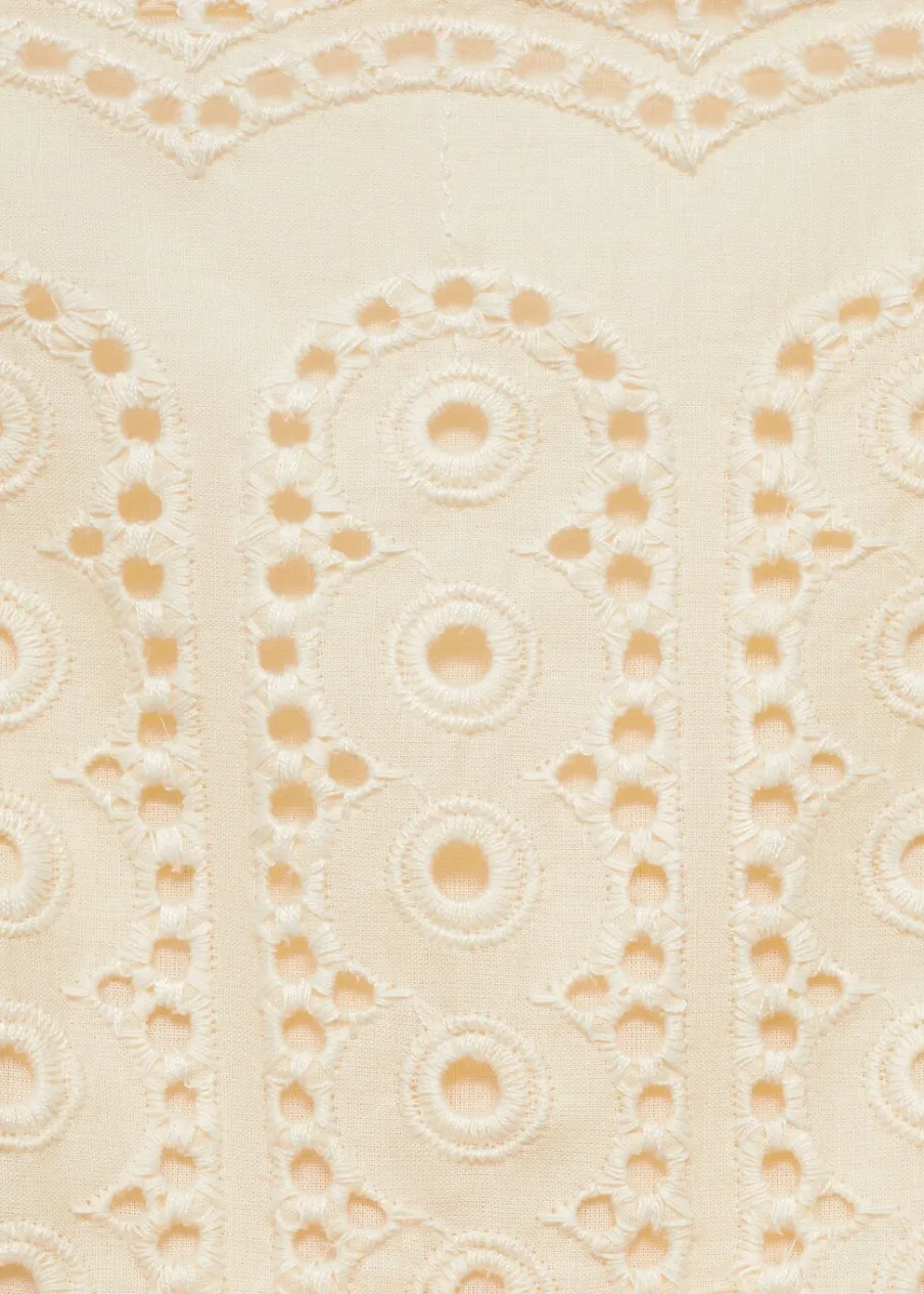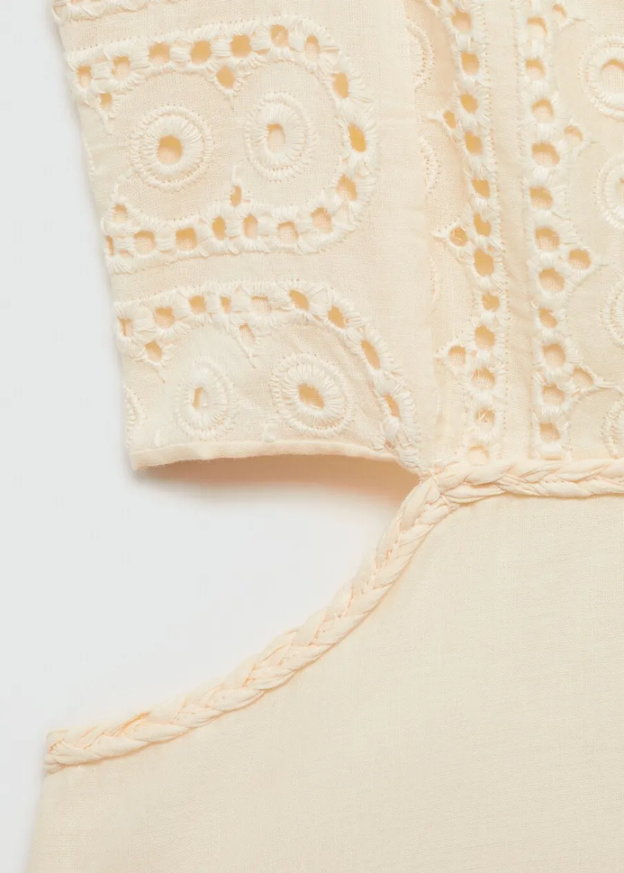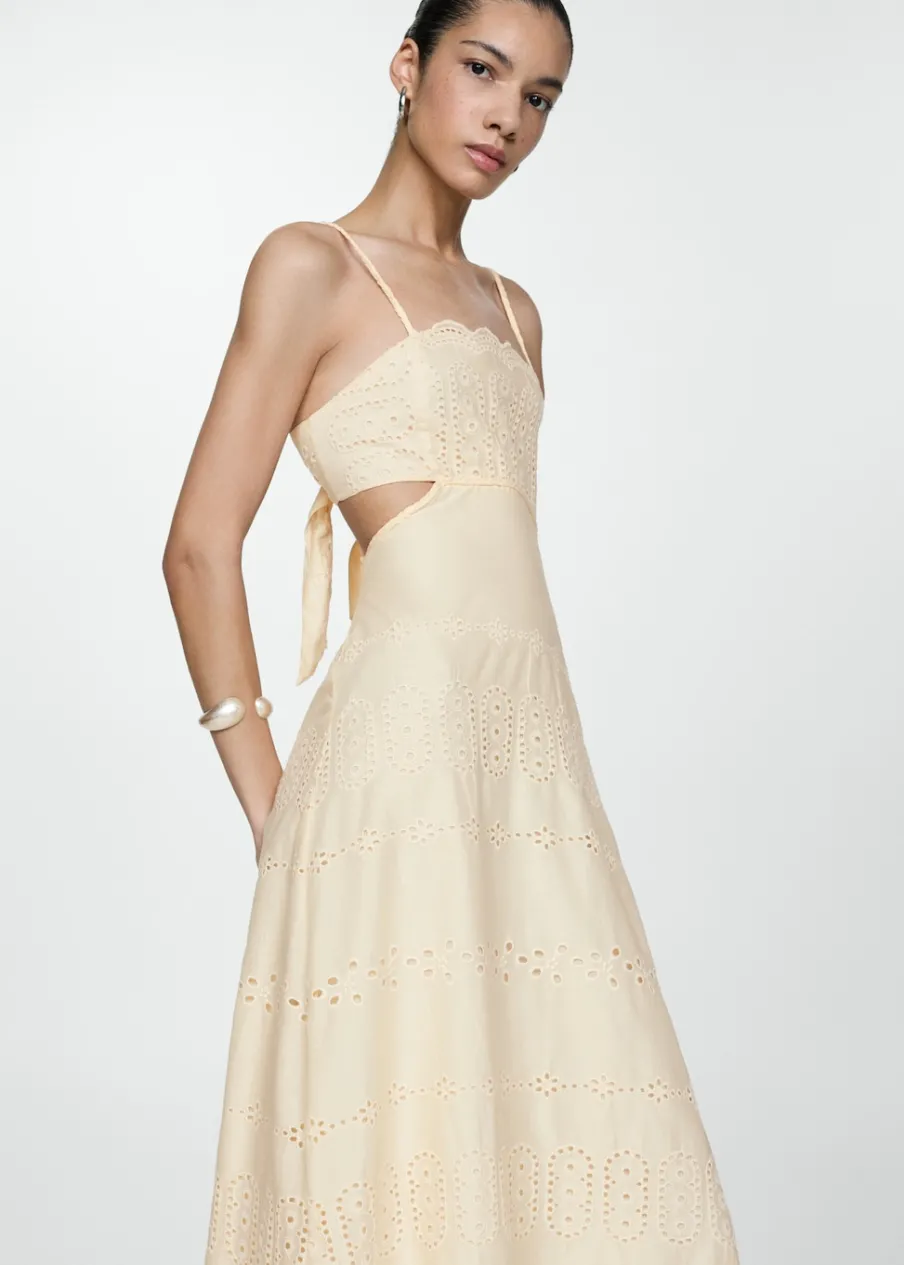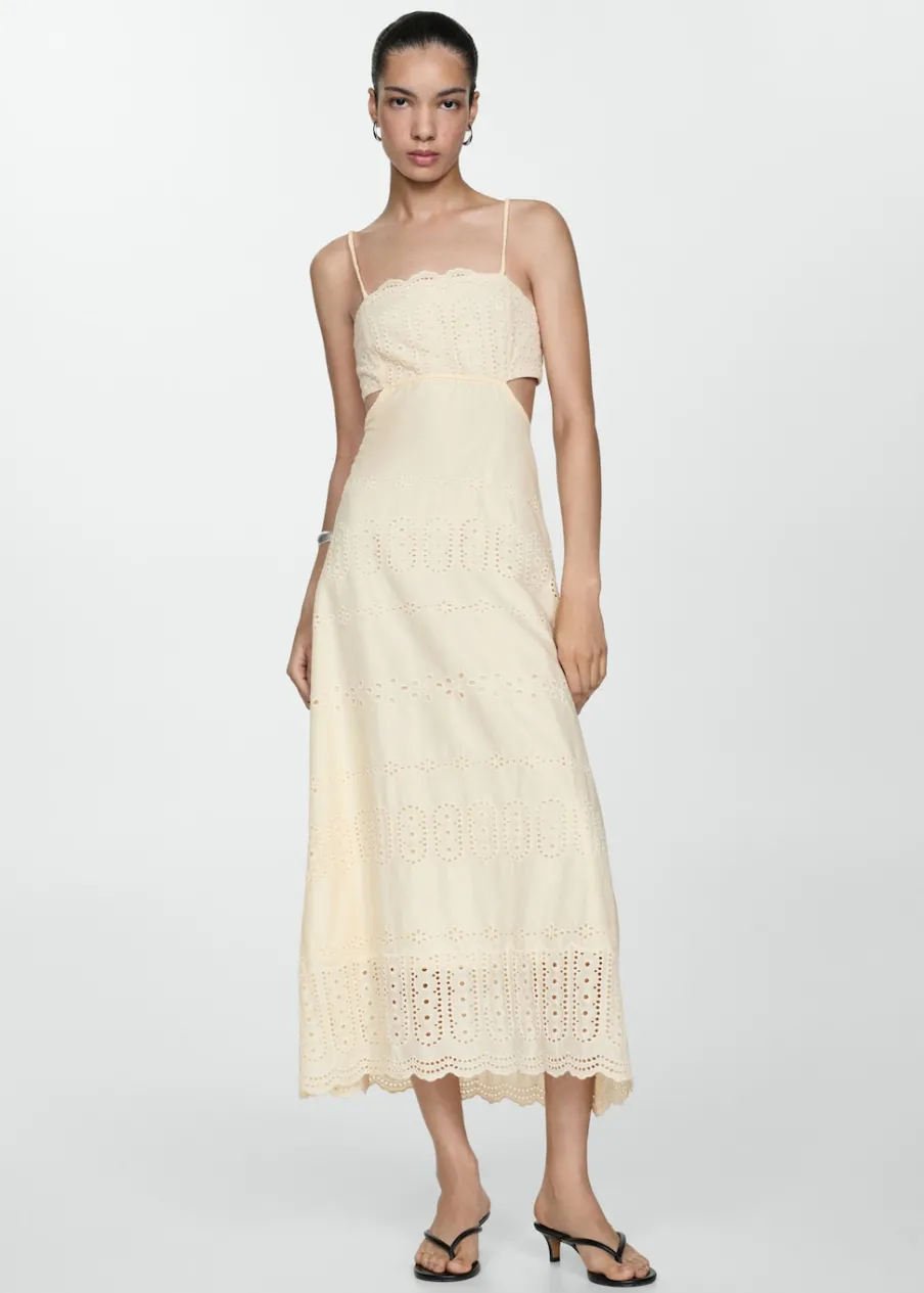 Haftowana tkanina. Model evasé. Krój do kolan. Wycięcie. Kwadratowy dekolt. Bez rękawów. Cienkie ramiączka. Boczne zapięcie na suwak. Wewnętrzna podszewka. Rozcięcia po bokach. Tkanina z 100% bawełny.
