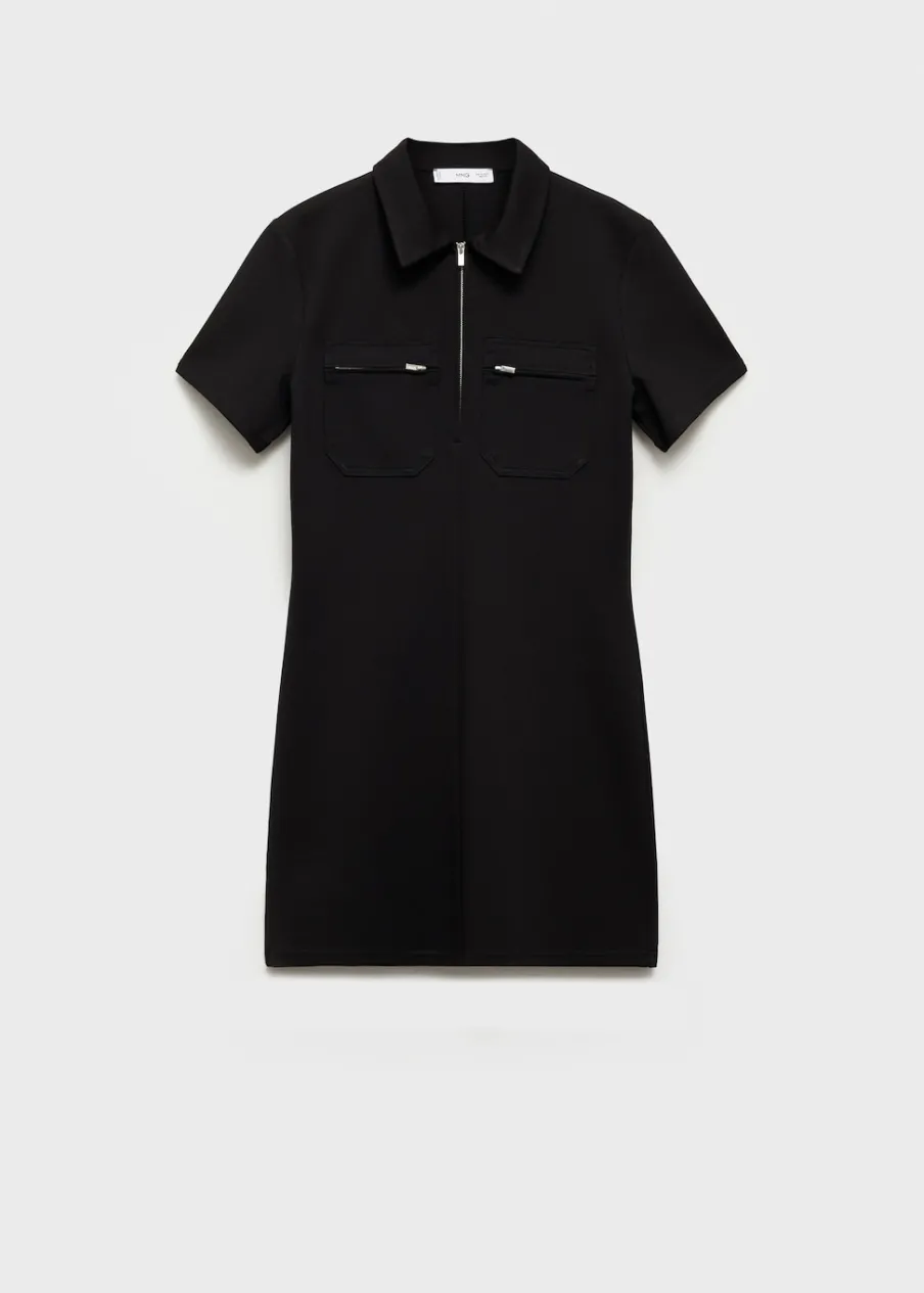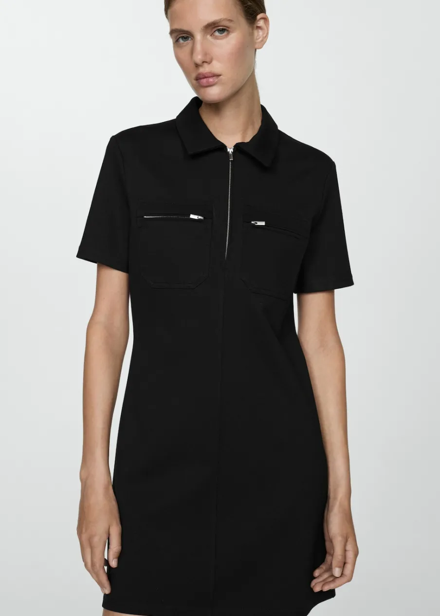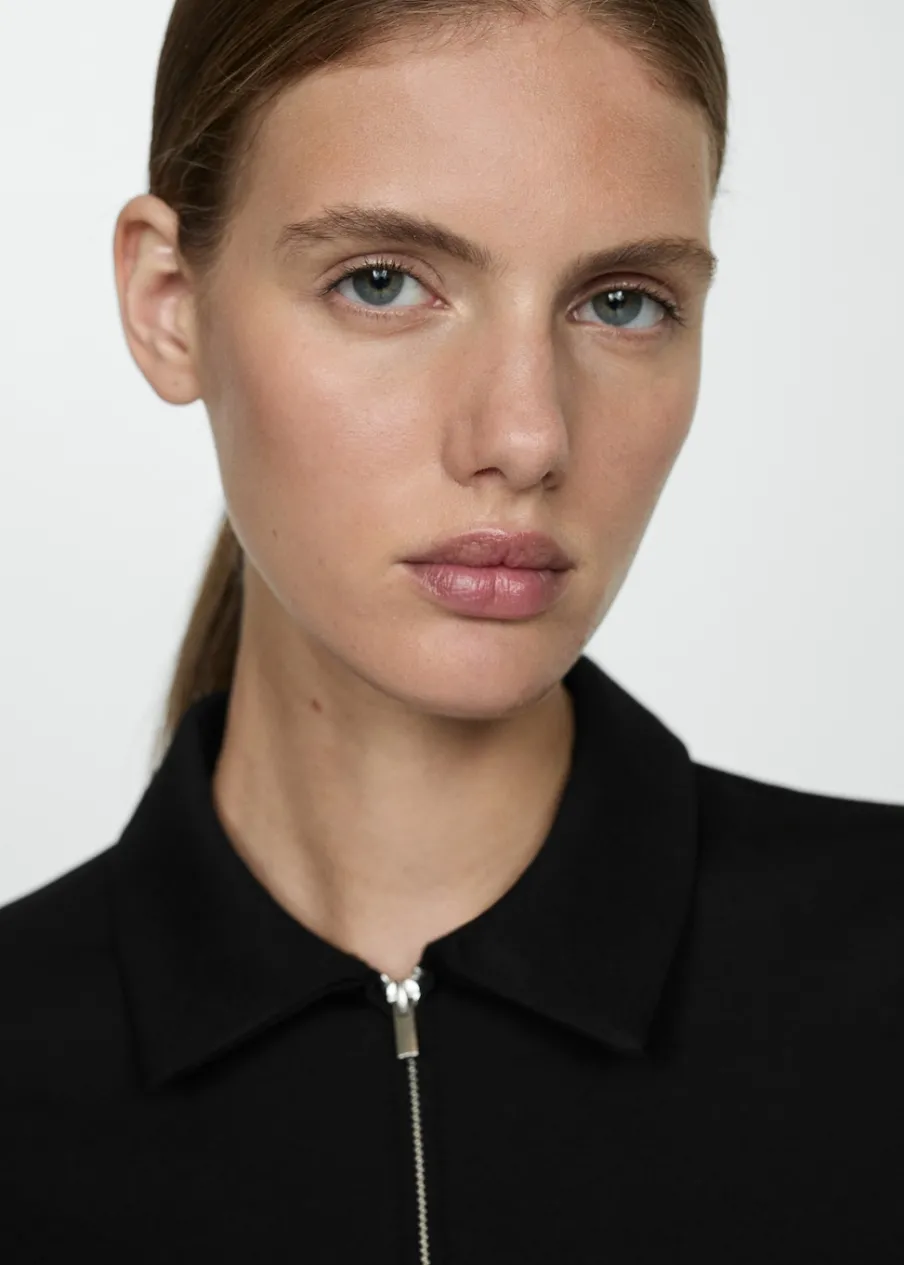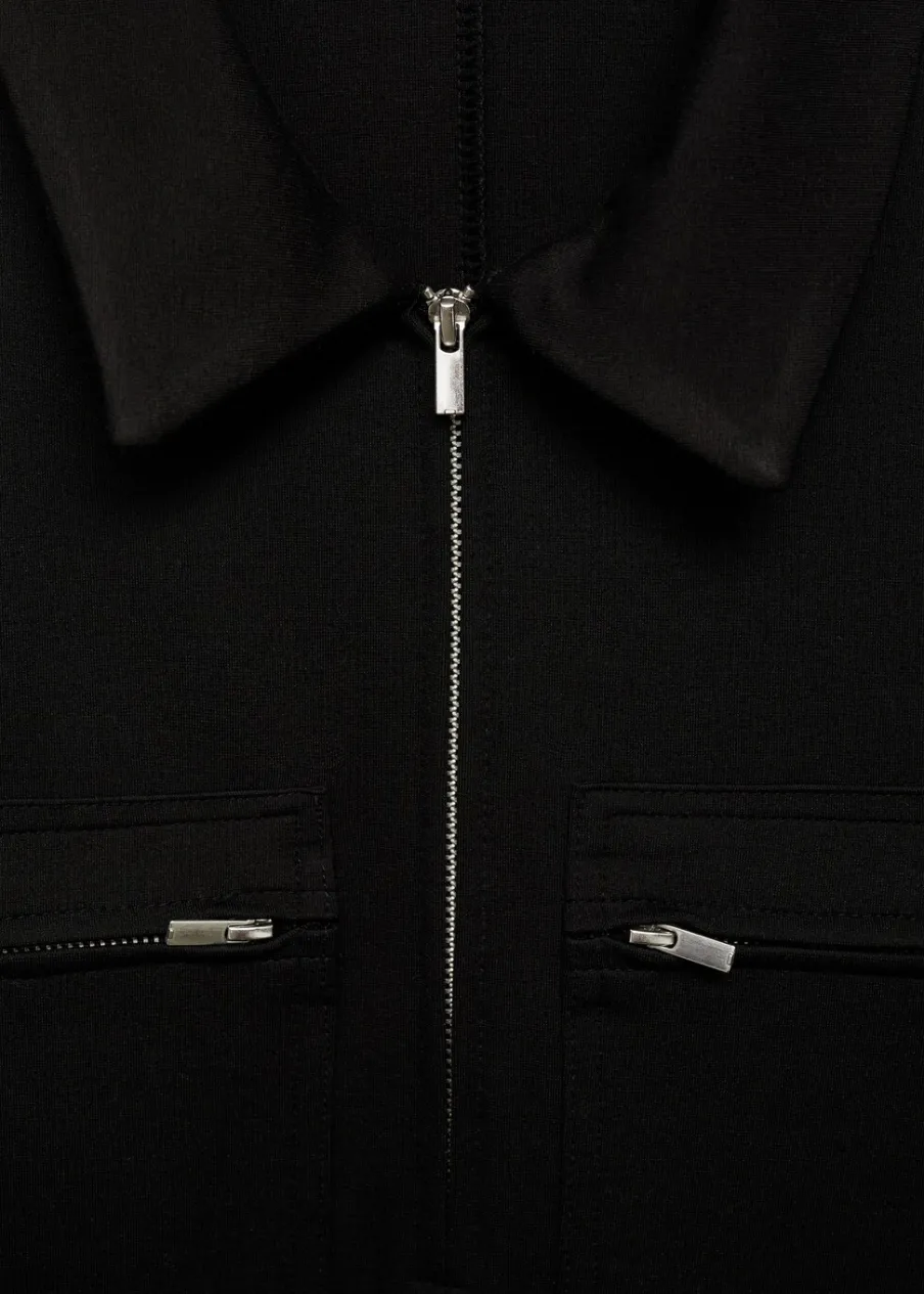 Lejąca tkanina. Krótki krój. Model prosty. Kołnierzyk polo. Krótki rękaw. Dwie zasuwane kieszenie na klatce piersiowej. Zapięcie z przodu na suwak. Modelka ma 180 cm wzrostu i nosi rozmiar S.
