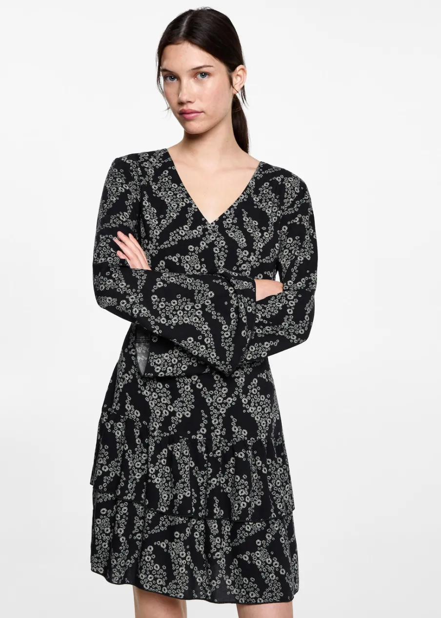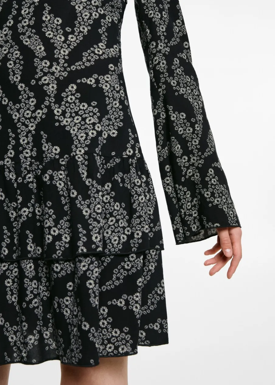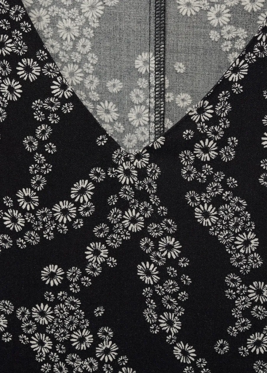 Kwiatowy wzór. Dekolt V. Krótki krój. Długi, rozszerzany rękaw. Bez zapięcia.