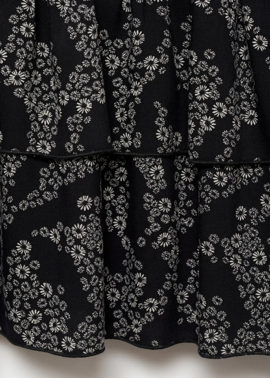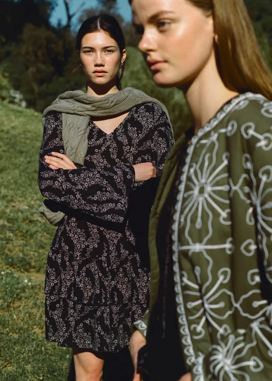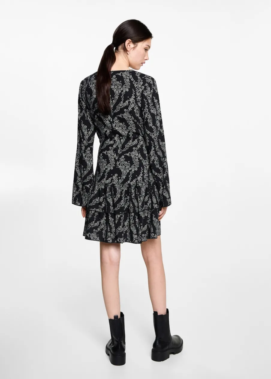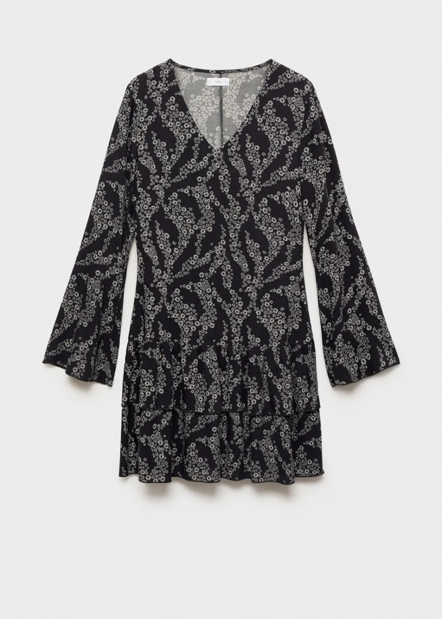 Kwiatowy wzór. Dekolt V. Krótki krój. Długi, rozszerzany rękaw. Bez zapięcia.