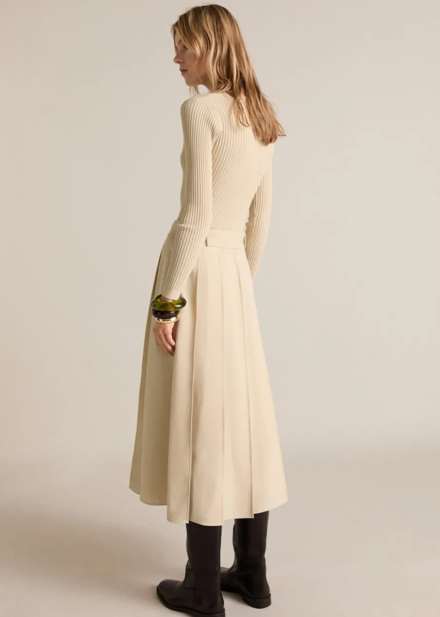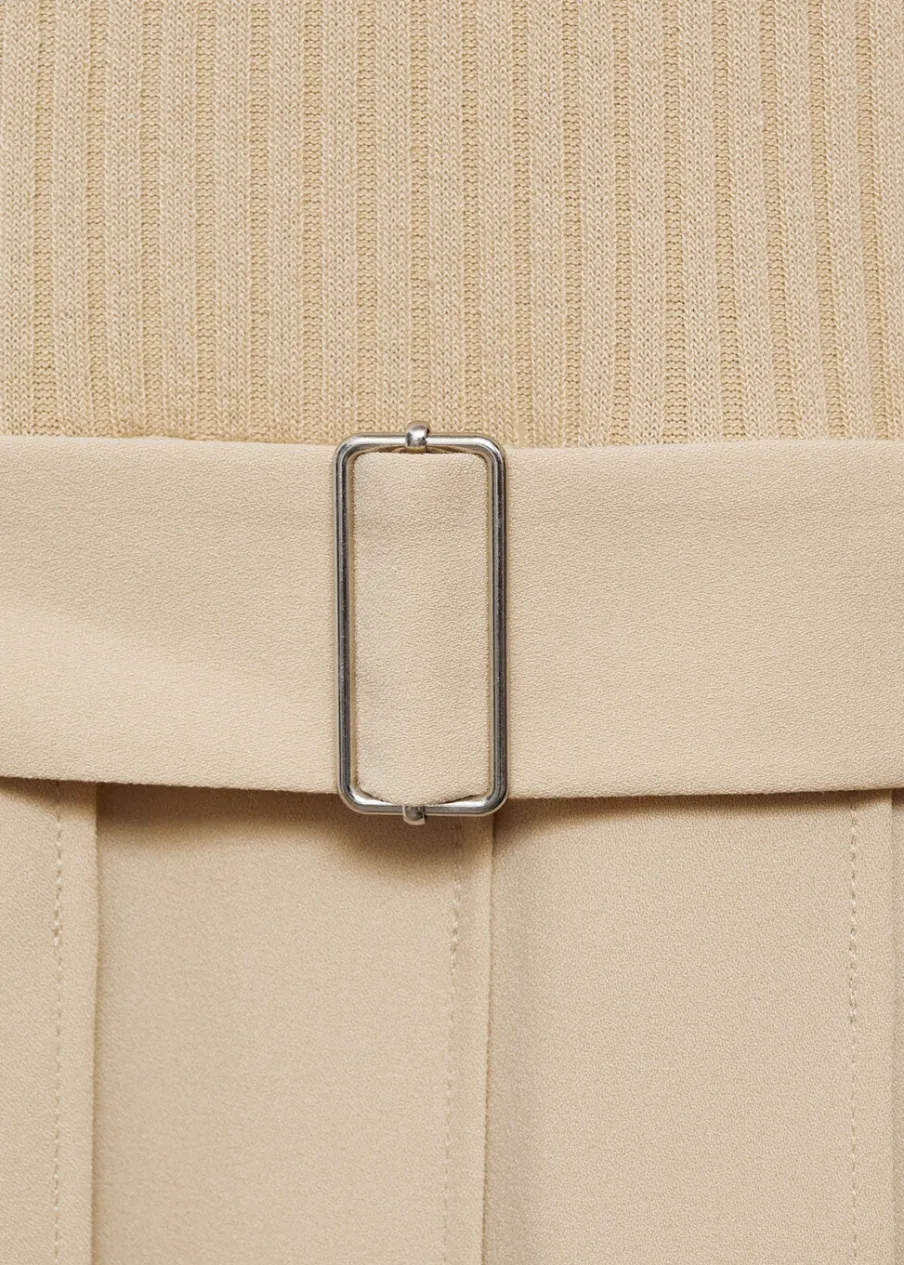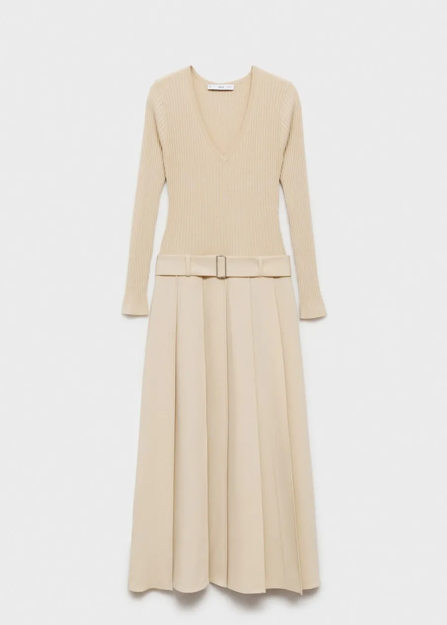 Tkanina ze ściągaczowej dzianiny. Model łączony. Krój do kolan. Model evasé. Dekolt V. Długi rękaw. Szlufki. Odpinany pasek. Fason z zakładkami. Zapięcie na zamek z boku.