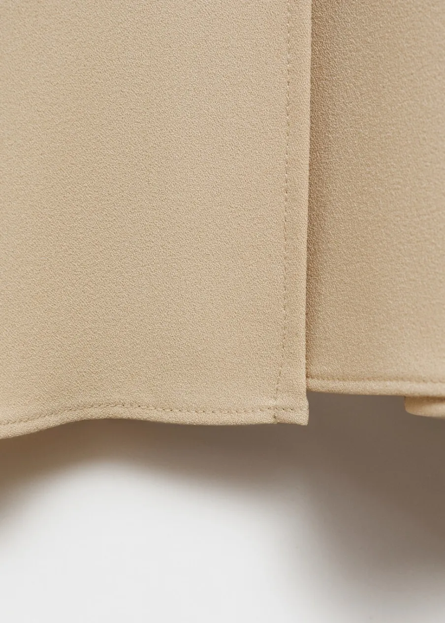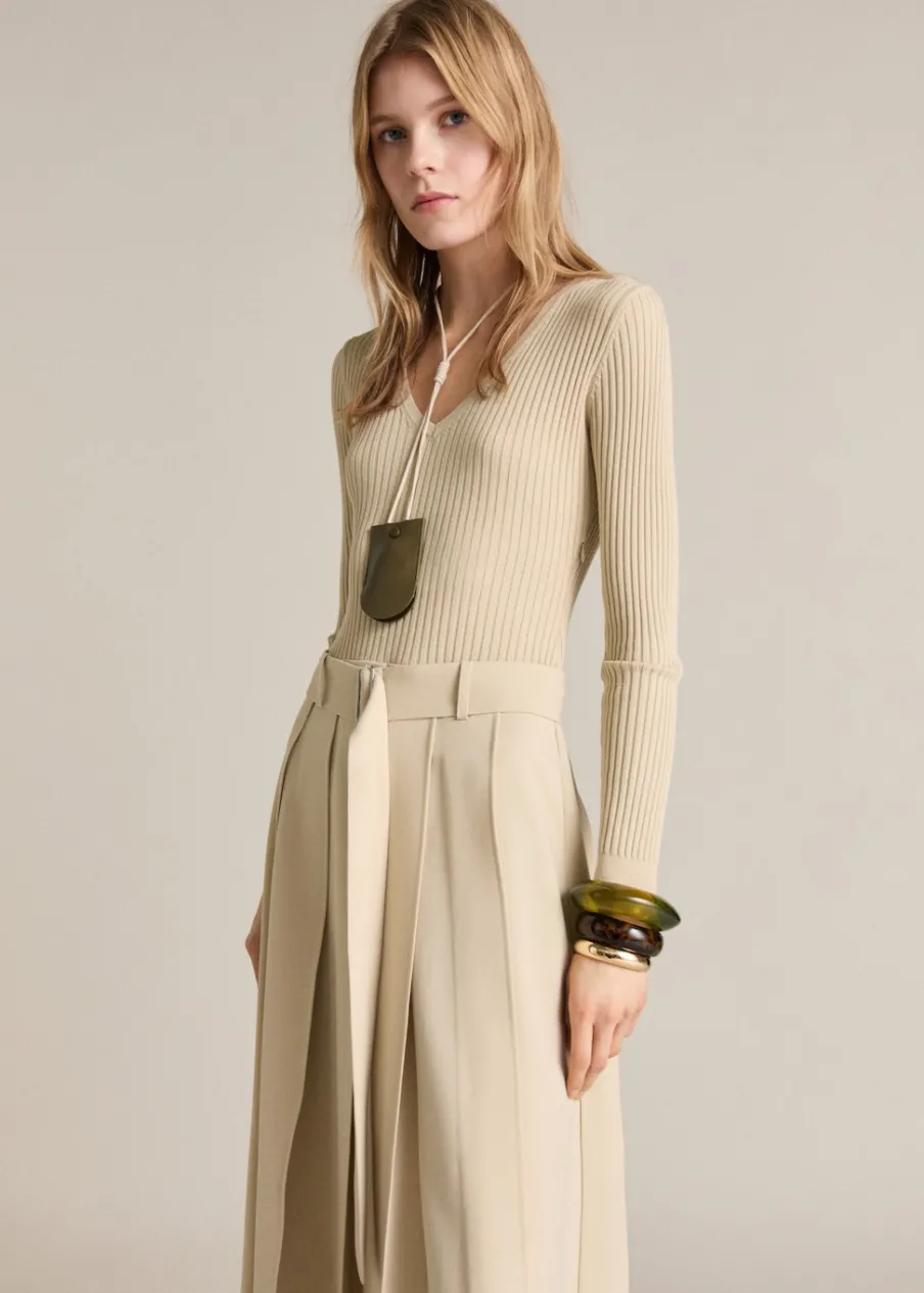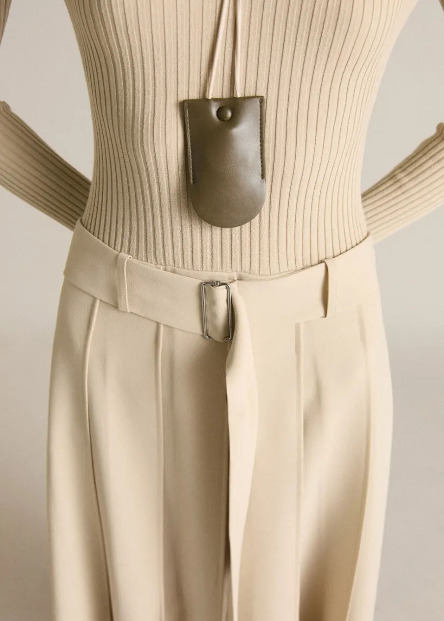 Tkanina ze ściągaczowej dzianiny. Model łączony. Krój do kolan. Model evasé. Dekolt V. Długi rękaw. Szlufki. Odpinany pasek. Fason z zakładkami. Zapięcie na zamek z boku.
