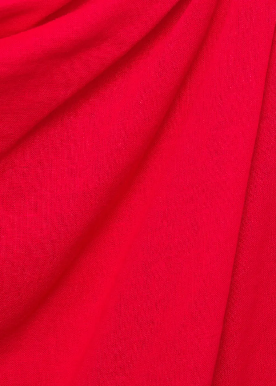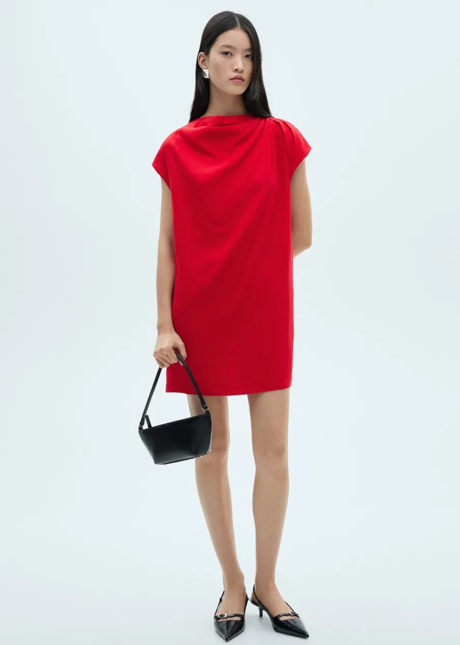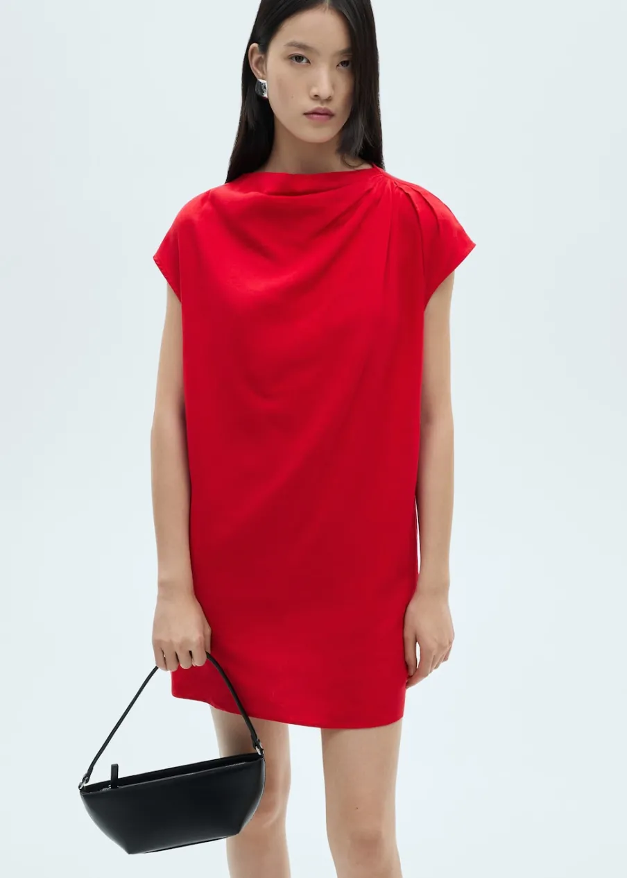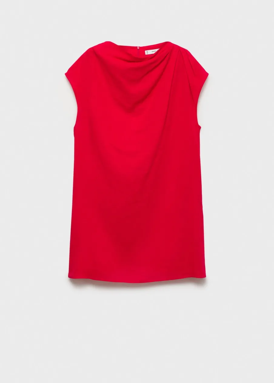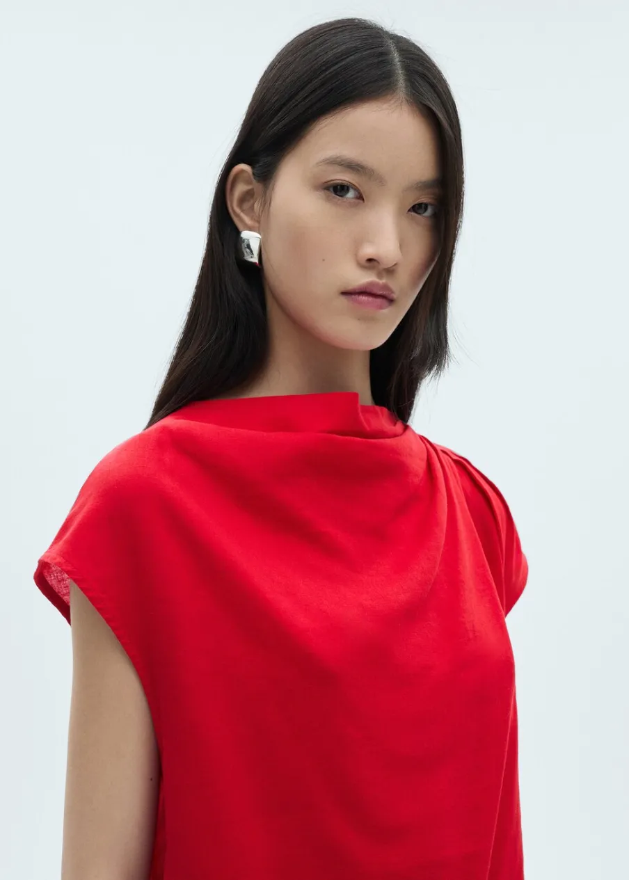 Tkanina z mieszanki lnu. Cienka tkanina. Model prosty. Krótki krój. Okrągły dekolt. Drapowany dekolt. Krótki rękaw. Zapięcie z tyłu. Bez podszewki.