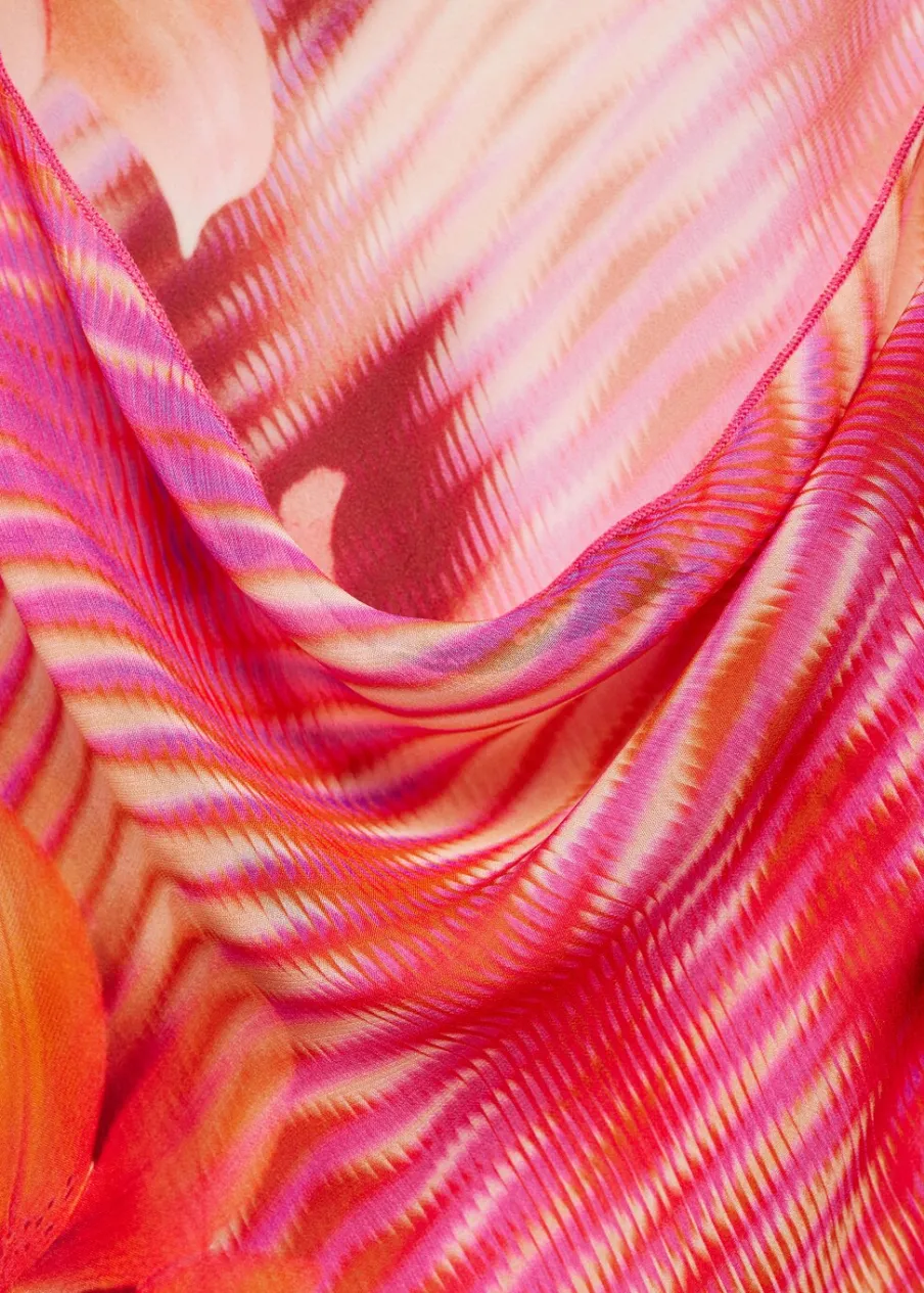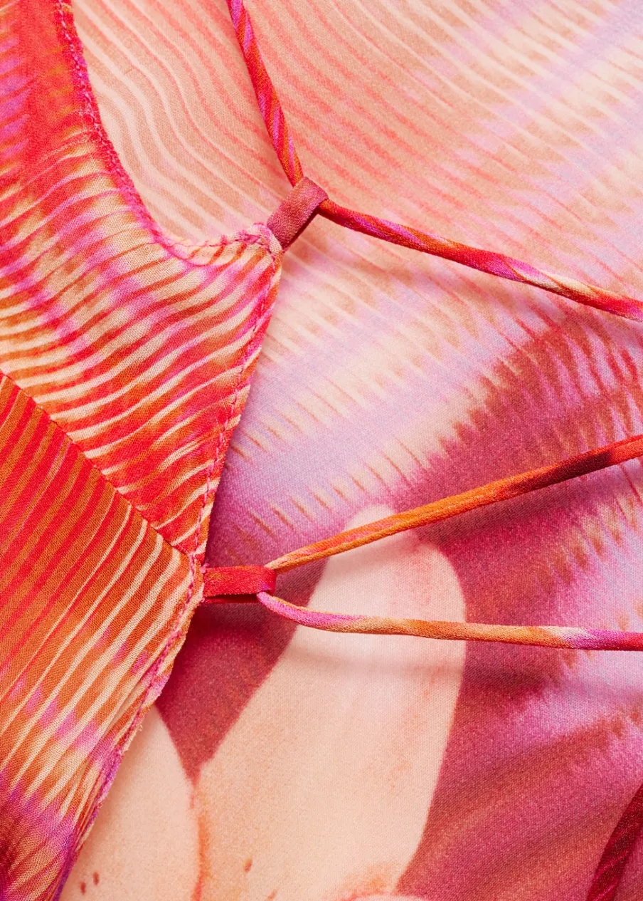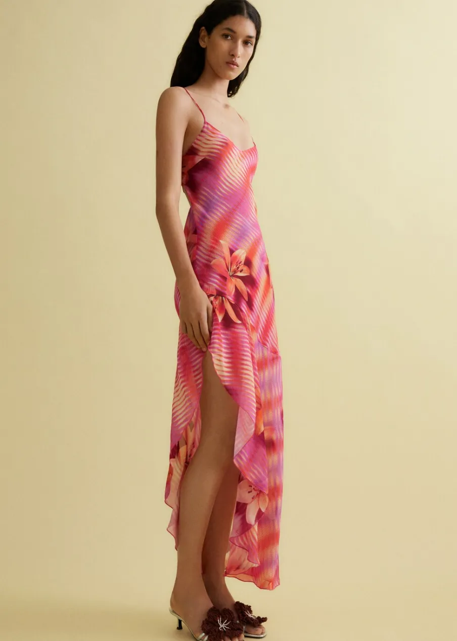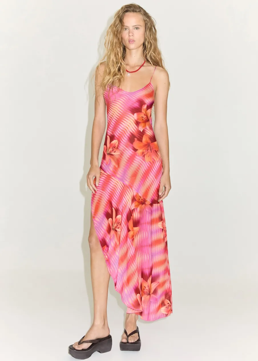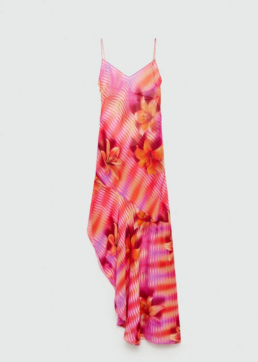 Lejąca tkanina. Półprzezroczysta tkanina. Asymetryczny krój. Model prosty. Model długi. Wzór w kwiaty. Dekolt V. Bez rękawów. Cienkie ramiączka. Wiązanie z tyłu. Asymetryczny dół. Tkanina z nadrukiem włoskiego pochodzenia.