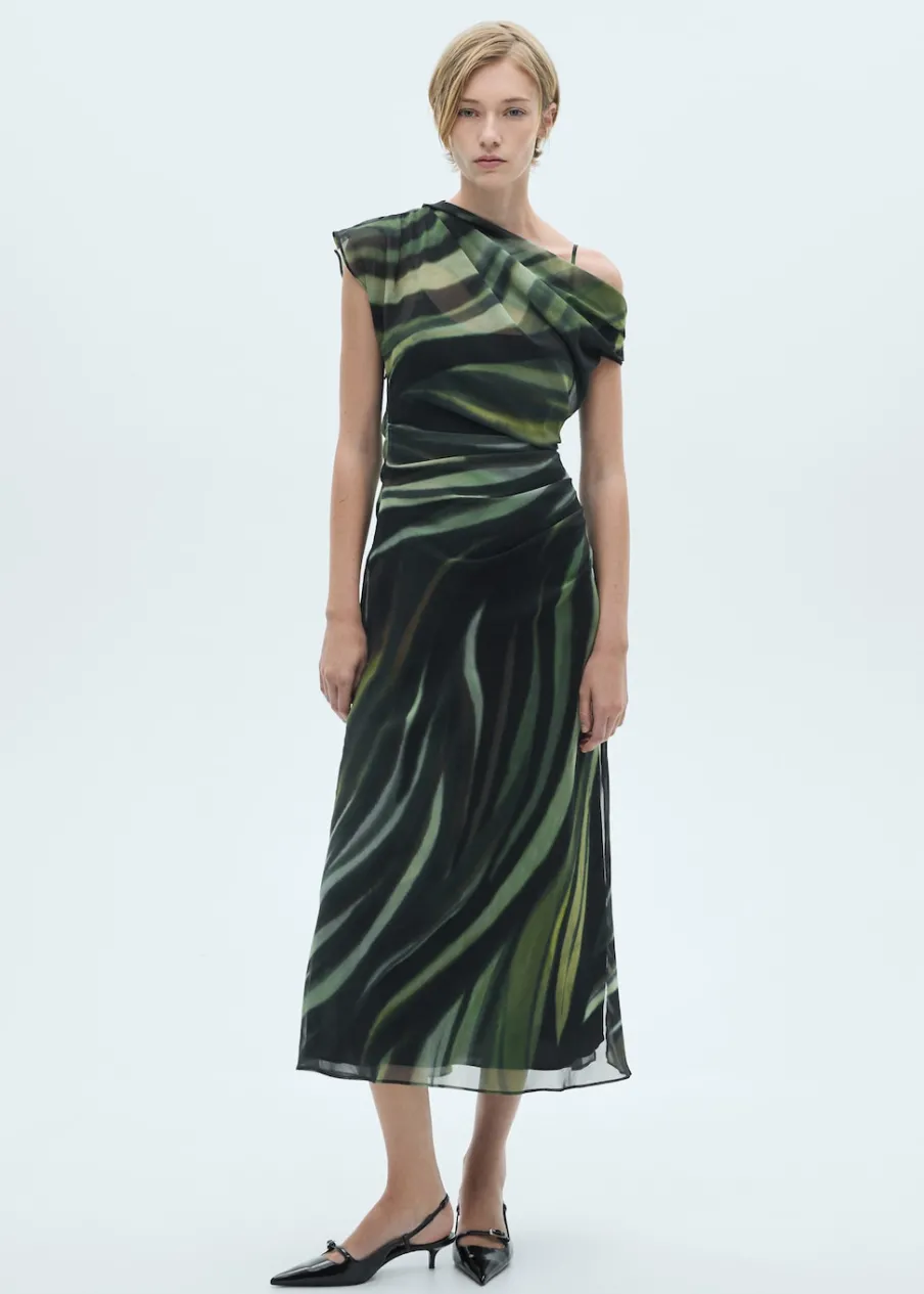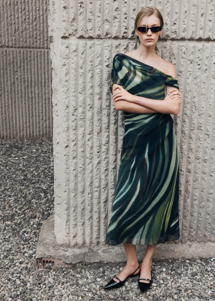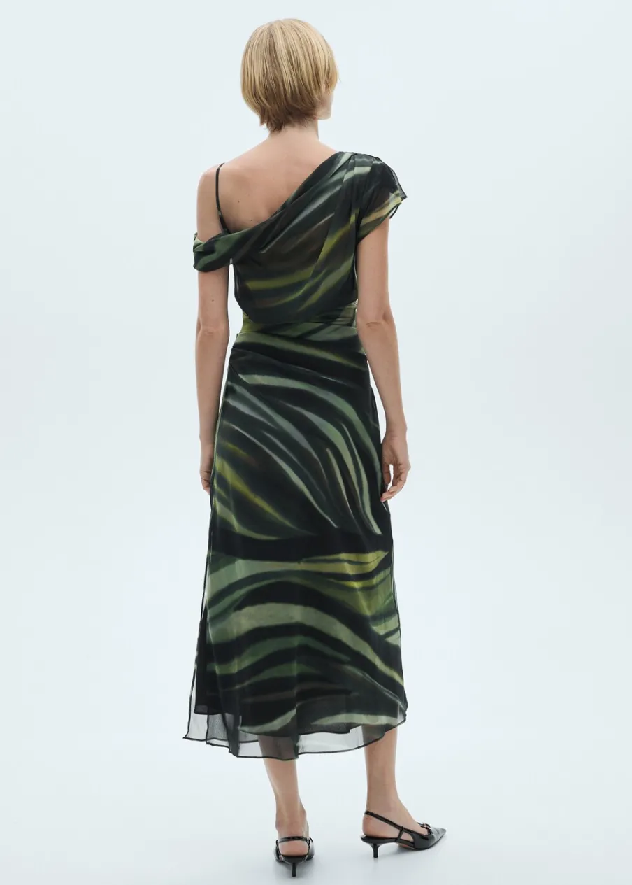 Lejąca tkanina. Model evasé. Model długi. Nadruk. Fason z odkrytymi ramionami. Asymetryczny dekolt. Krótki rękaw. Kryte zapięcie na zamek z boku. Wewnętrzna podszewka. Modelka ma 181 cm wzrostu i nosi rozmiar S/36.