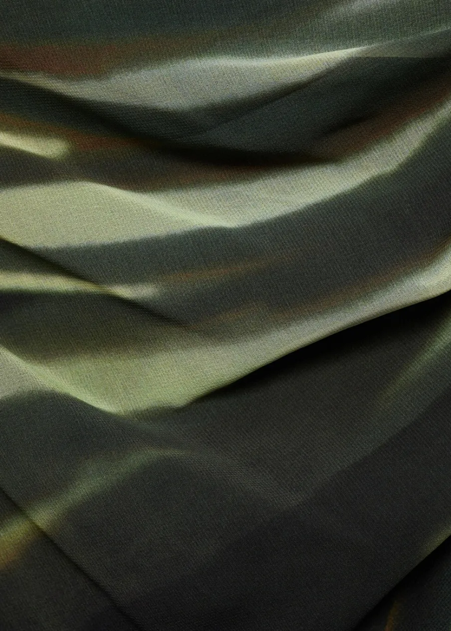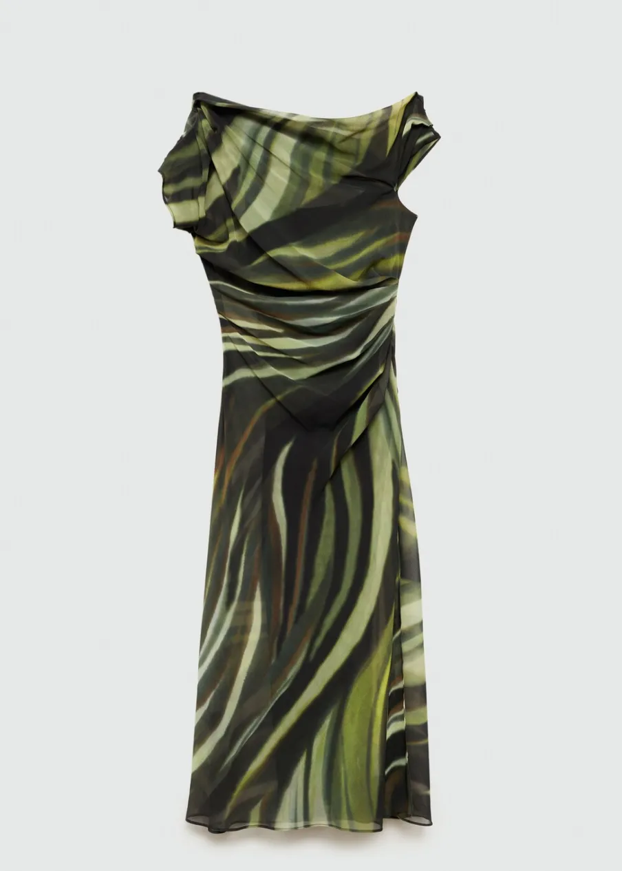 OpisLejąca tkanina. Model evasé. Model długi. Nadruk. Fason z odkrytymi ramionami. Asymetryczny dekolt. Krótki ręka…