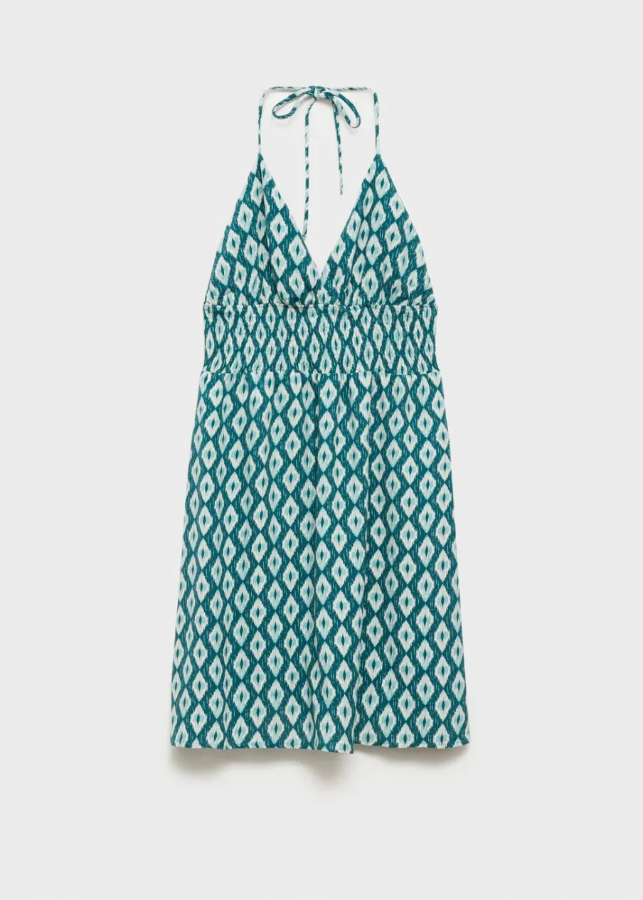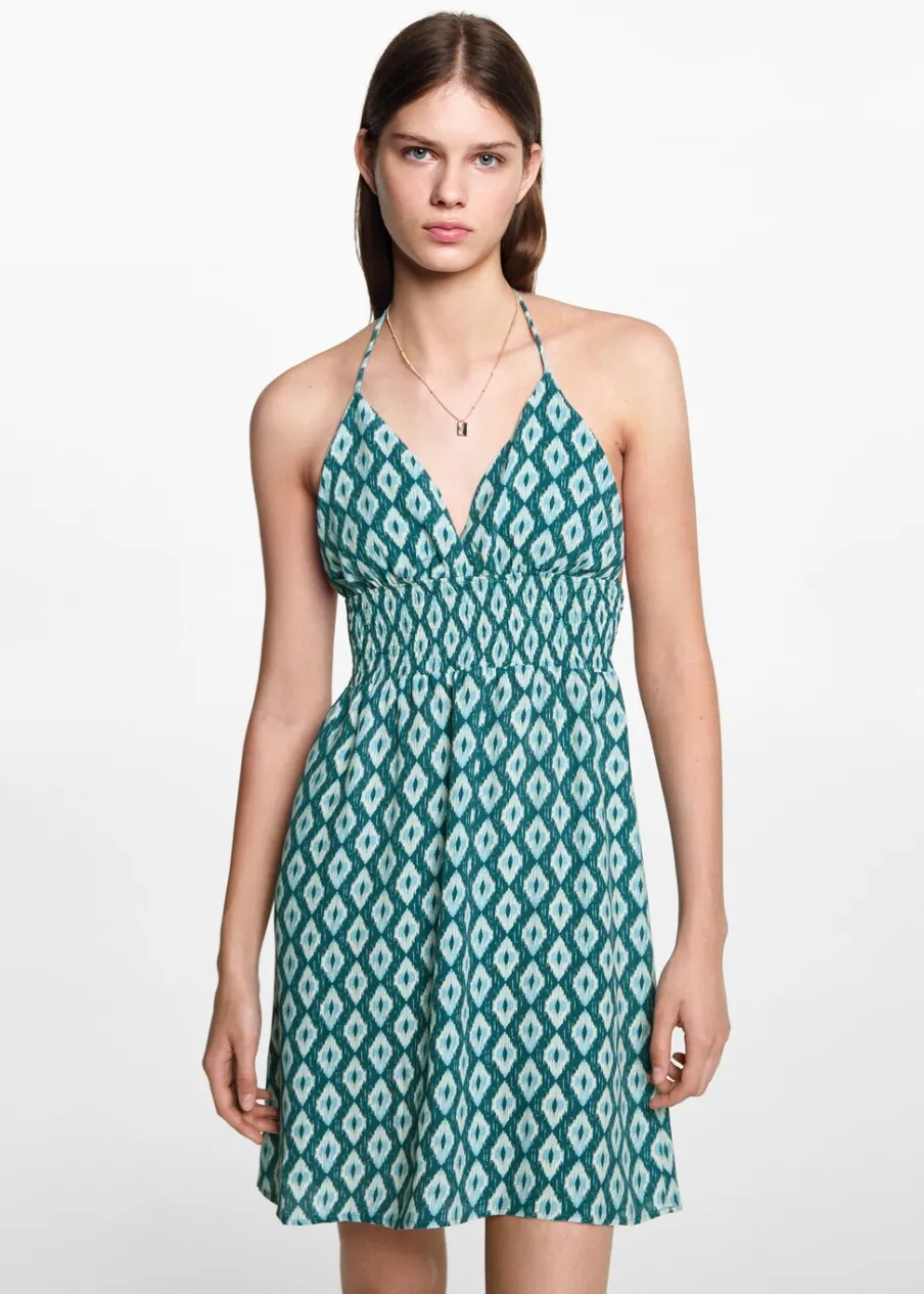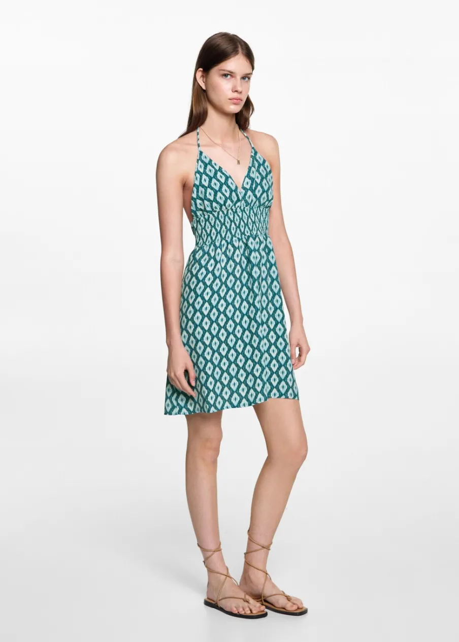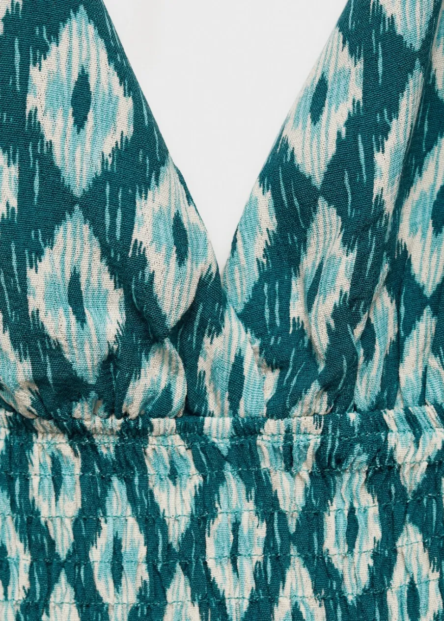 Model prosty. Krótki krój. Marszczony detal. Dekolt V. Wiązane zapięcie. Plecy z wycięciem. Nadruk. Tkanina z wiskozy.