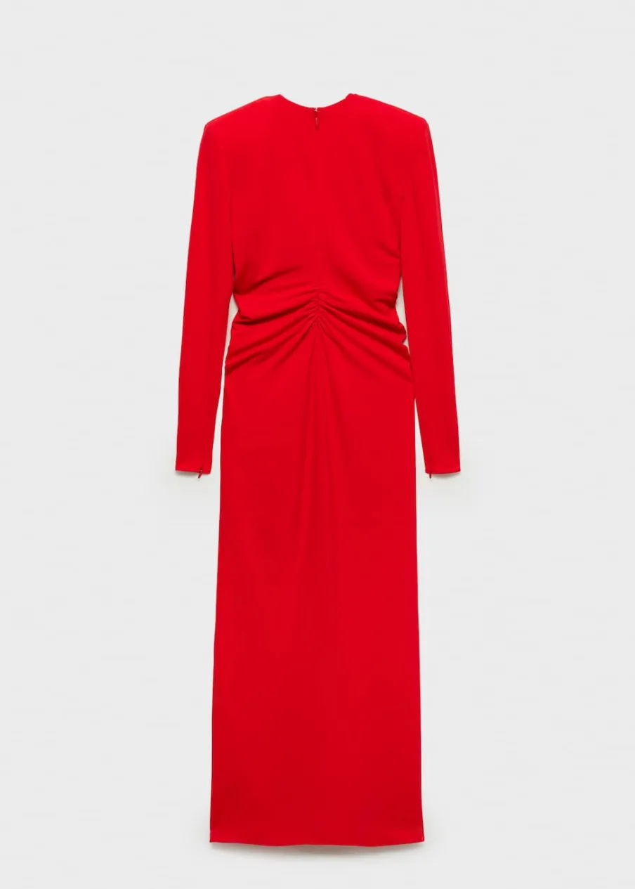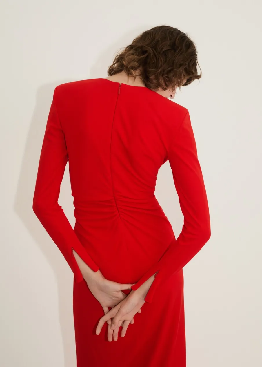 Elegancka, wyrafinowana i twarzowa – ta sukienka będzie trafionym wyborem na każdą imprezę w tym sezonie. Ma poduszki w ramionach i okrągłe wycięcie z marszczeniem. Lejąca tkanina. Model prosty. Model długi. Dekolt V. Długi rękaw. Zapięcie z tyłu na kryty suwak. Ozdobne kółko. Marszczona tekstura. Rozcięcie z przodu u dołu. Wyprodukowano w Portugalii. Kolekcja wizytowa. Artykuły z kolekcji CAPSULE można wymienić lub zwrócić w ciągu 14 dni od daty wysyłki.