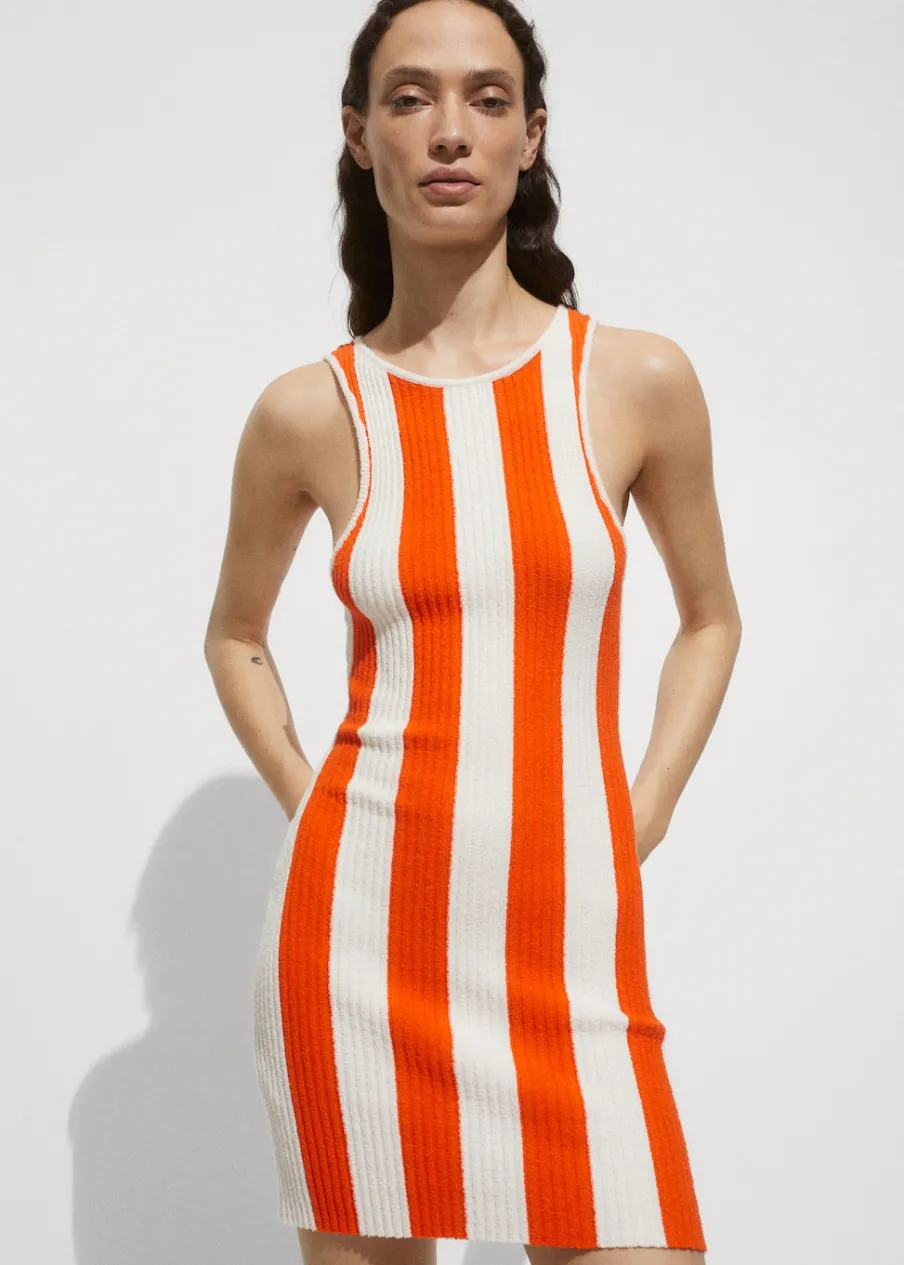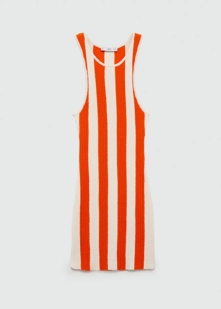Tkanina mieszanka bawełny. Tkanina z grubej dzianiny. Ściągaczowa tkanina. Pętelkowa dzianina. Krótki krój. Okrągły dekolt. Bez rękawów. Szerokie ramiączka. Bez zapięcia. Model wcięty. Wzór w paski.