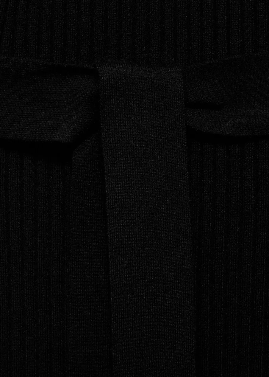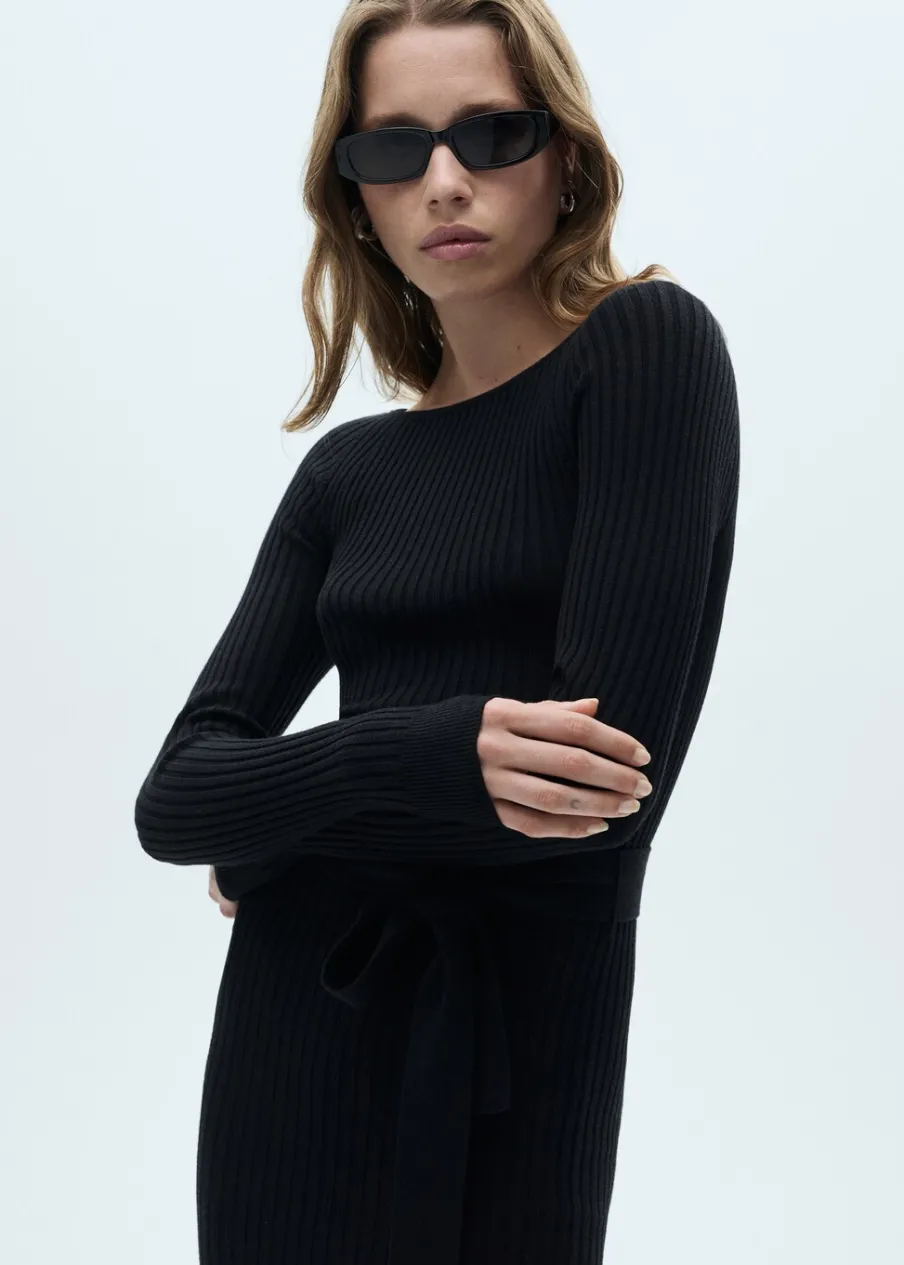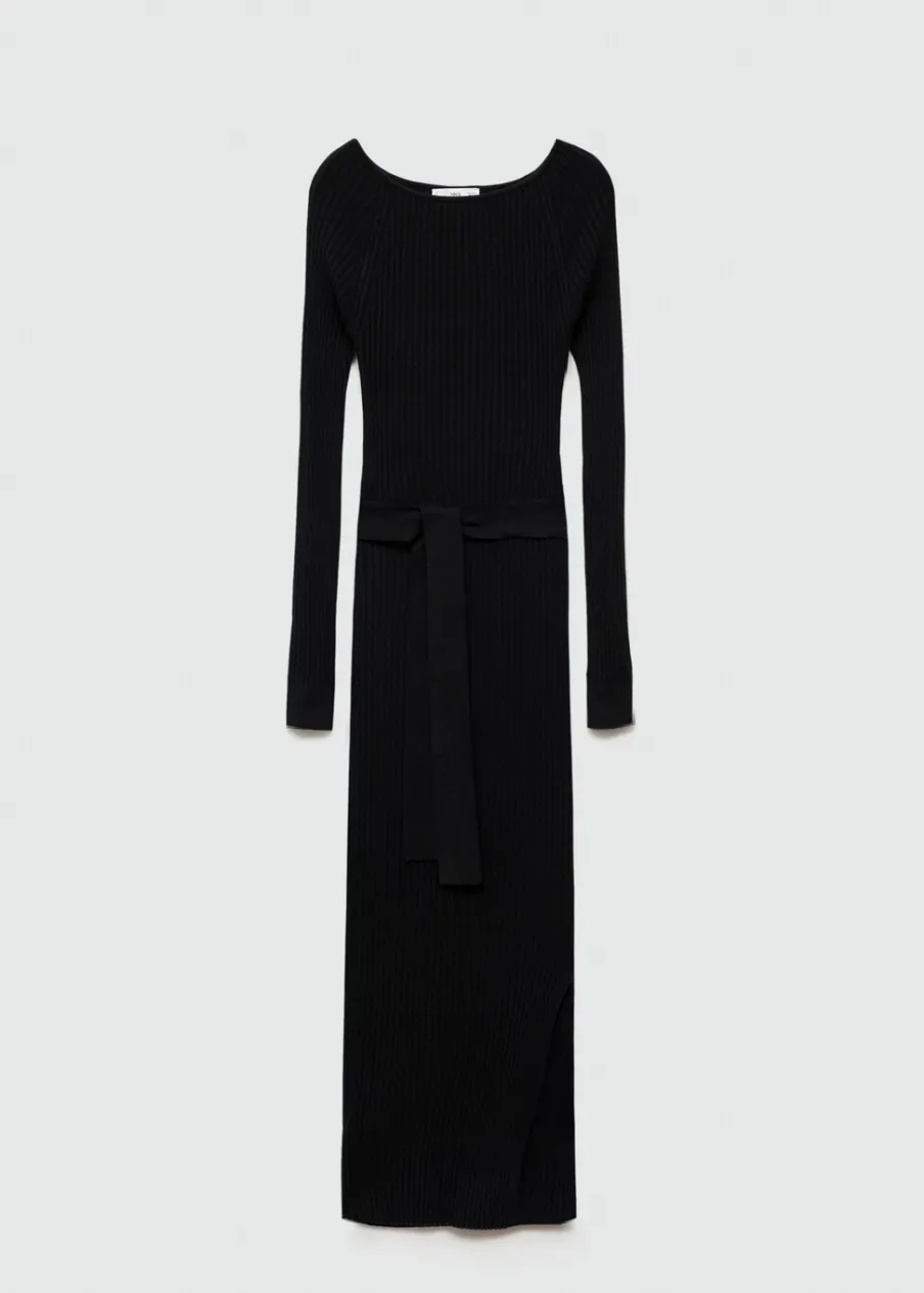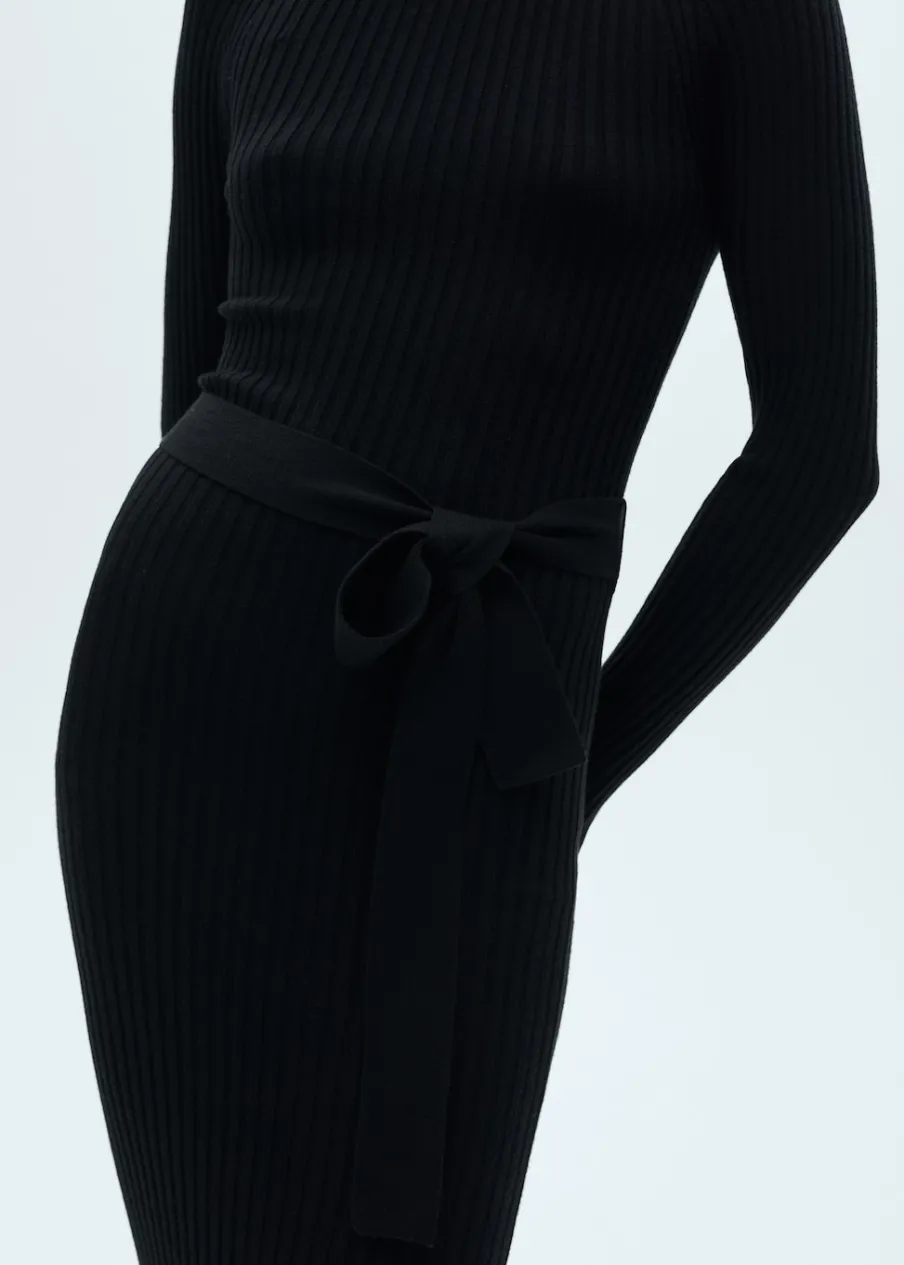 Tkanina ze ściągaczowej dzianiny. Krój do kolan. Dekolt w kształcie łódki. Długi rękaw. Szlufki. Odpinany pasek. Rozcięcie boczne. Modelka ma 175 cm wzrostu i nosi rozmiar S/36. Model wcięty.