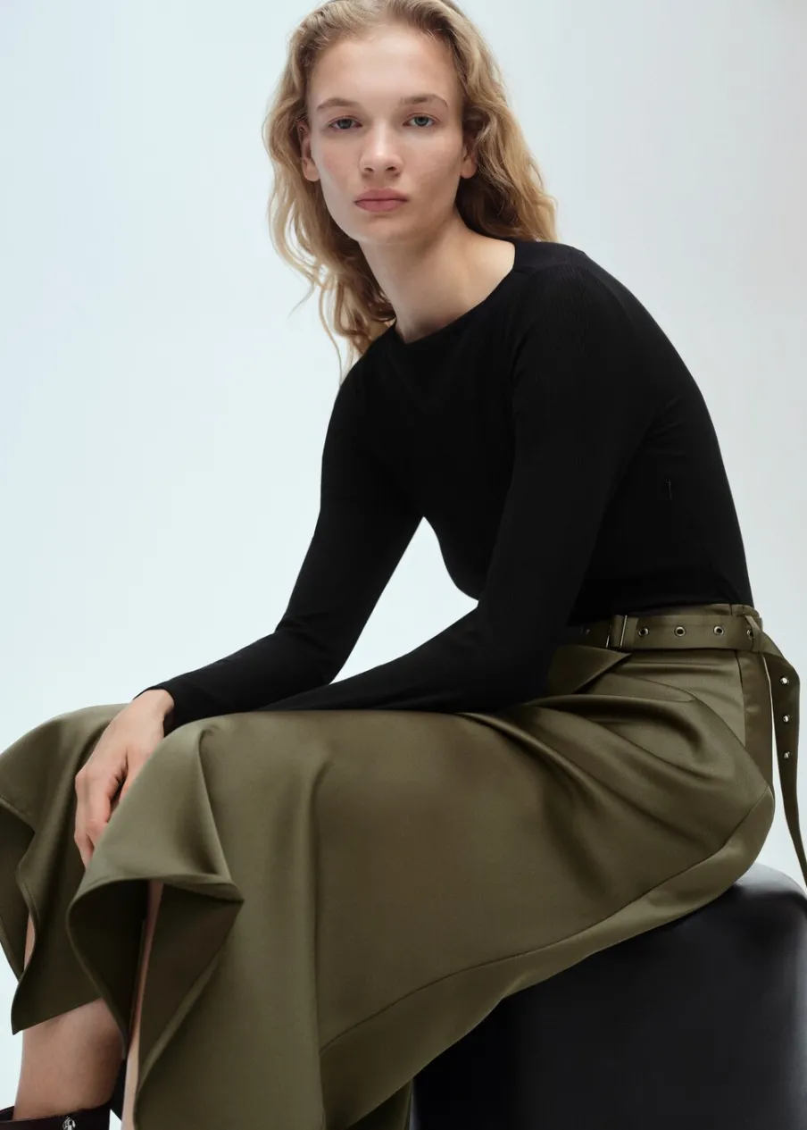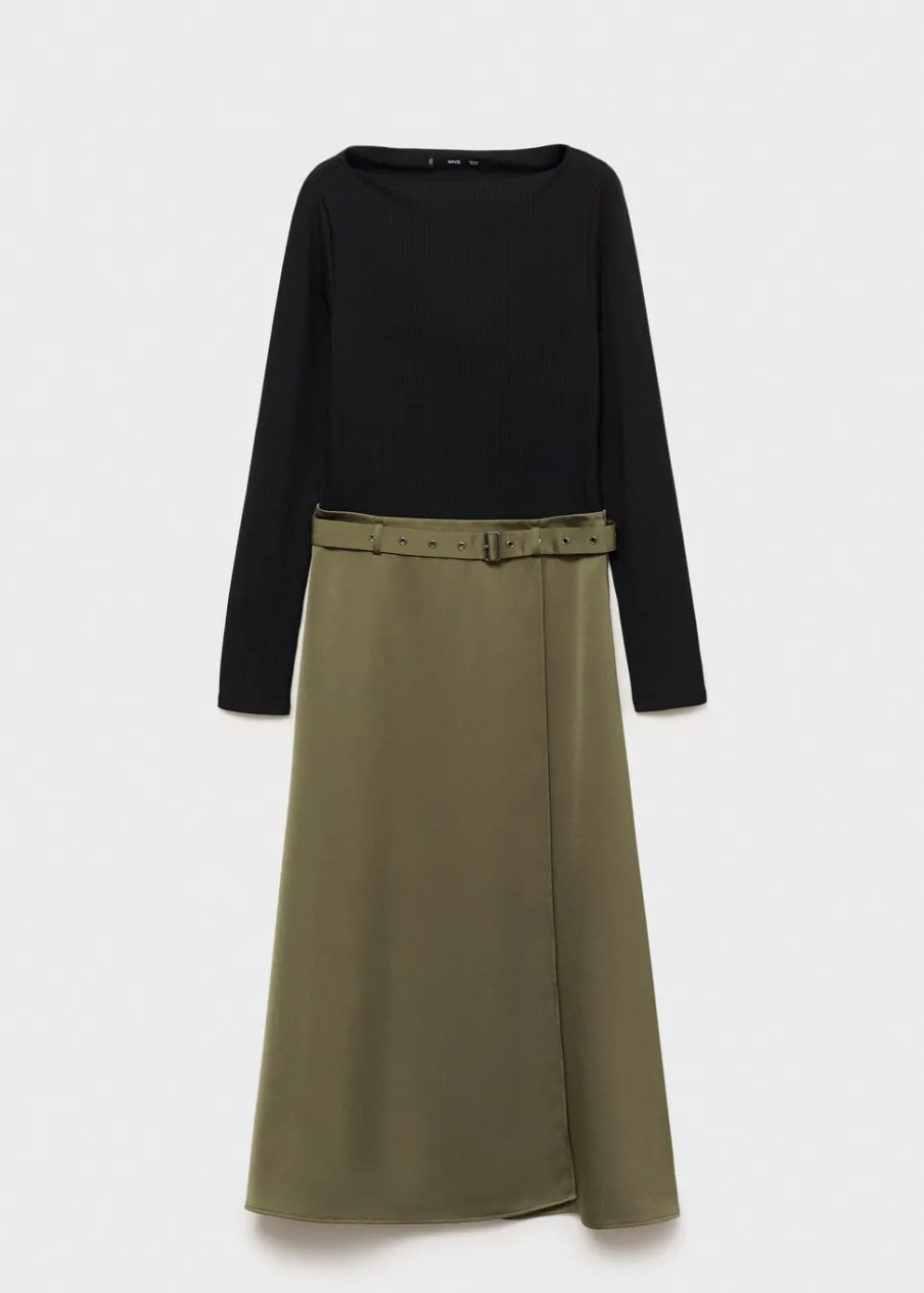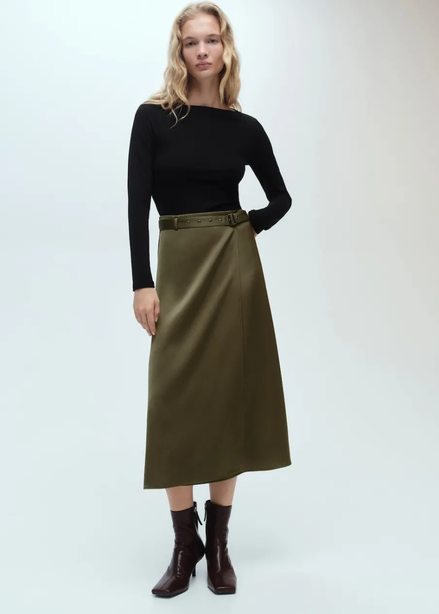 Tkanina lyocell. Cienka tkanina. Satynowy efekt. Zapięcie na zamek z boku. Model evasé. Krój do kolan. Dekolt w kształcie łódki. Długi rękaw. Dekoracyjny pasek. Bez podszewki.