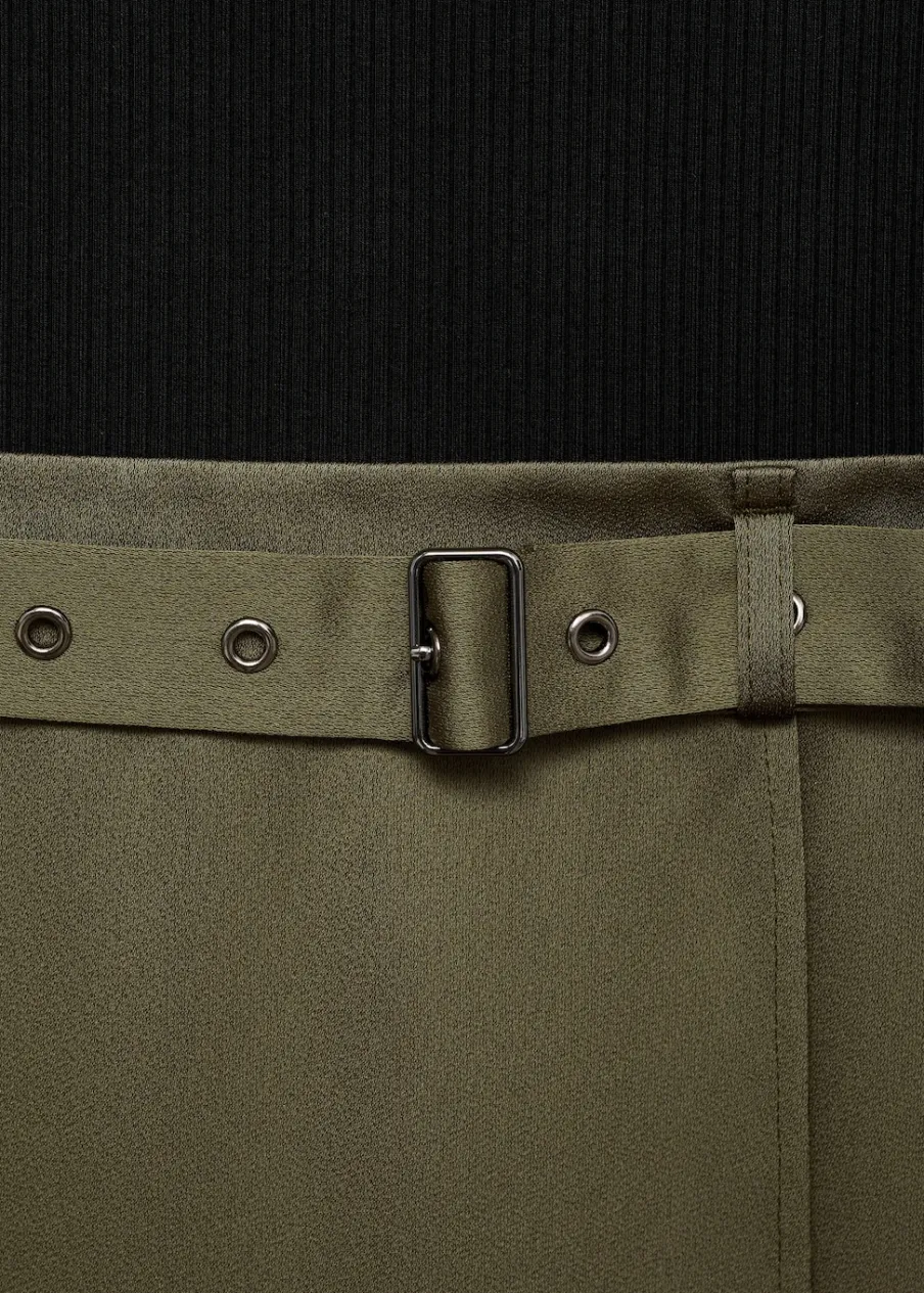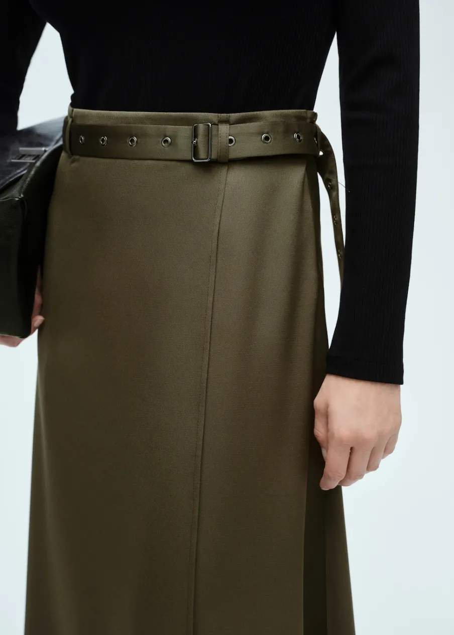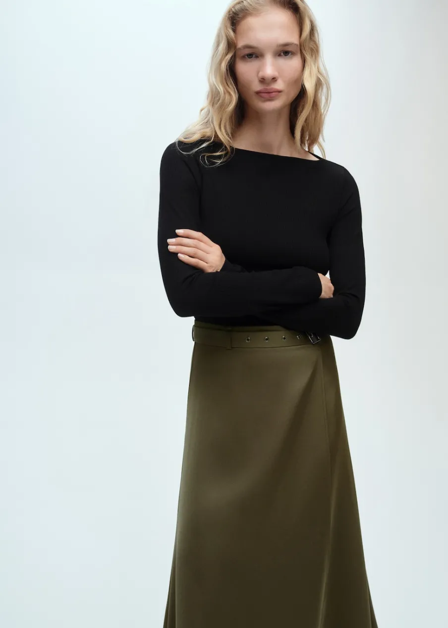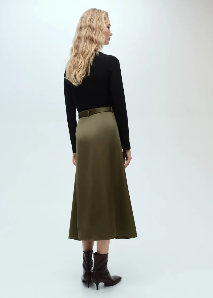 Tkanina lyocell. Cienka tkanina. Satynowy efekt. Zapięcie na zamek z boku. Model evasé. Krój do kolan. Dekolt w kształcie łódki. Długi rękaw. Dekoracyjny pasek. Bez podszewki.