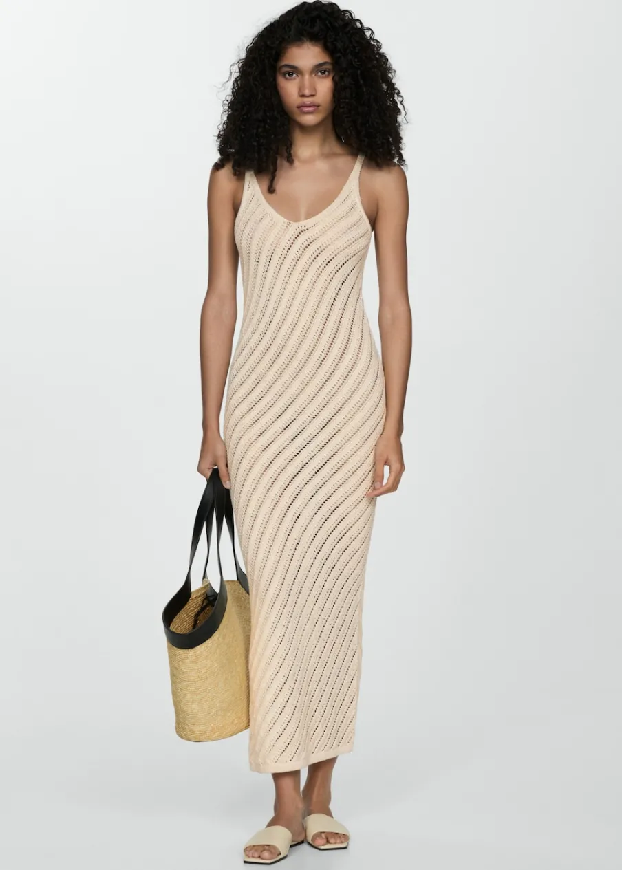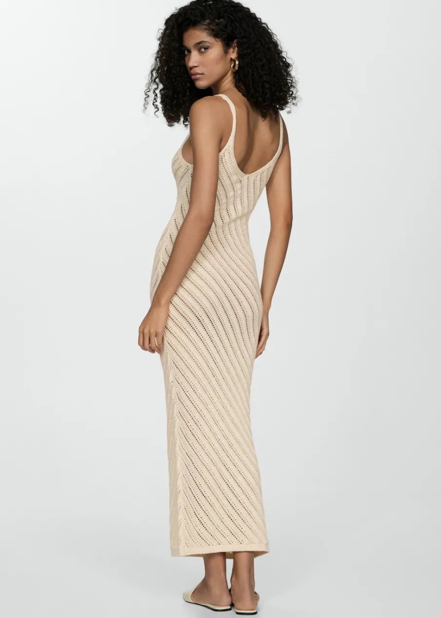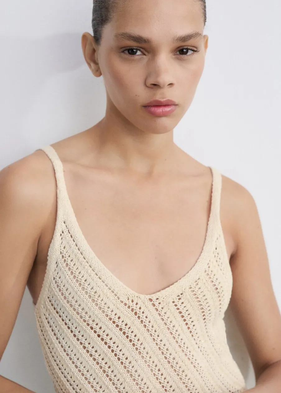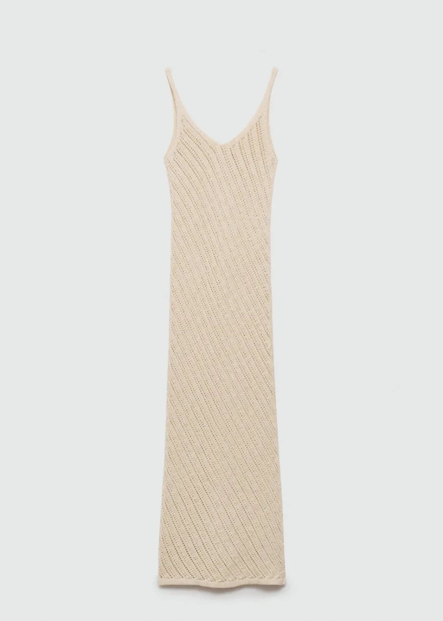 Tkanina z grubej dzianiny. Tkanina mieszanka bawełny. Model długi. Dekolt V. Bez rękawów. Cienkie ramiączka. Bez zapięcia. Szydełkowa tkanina. Model wcięty.