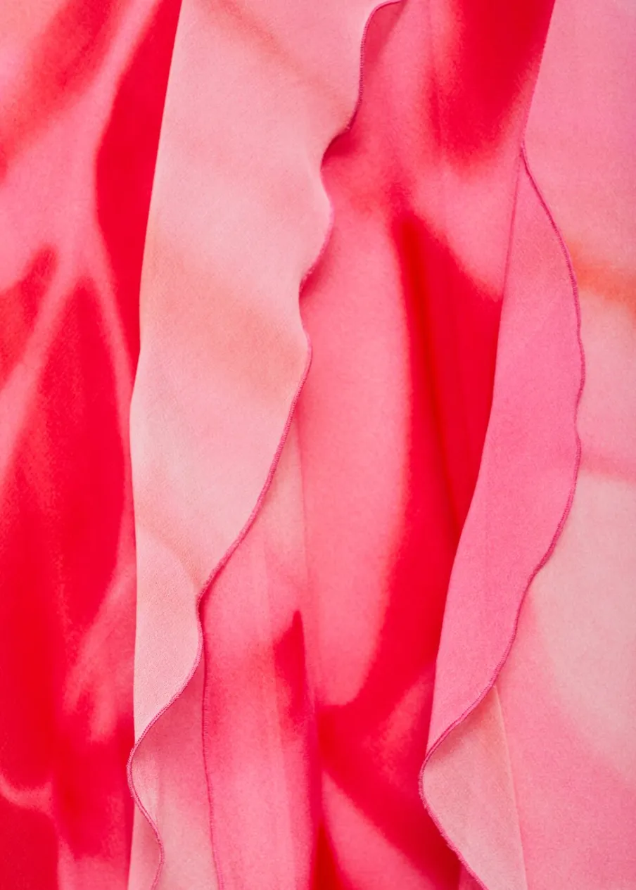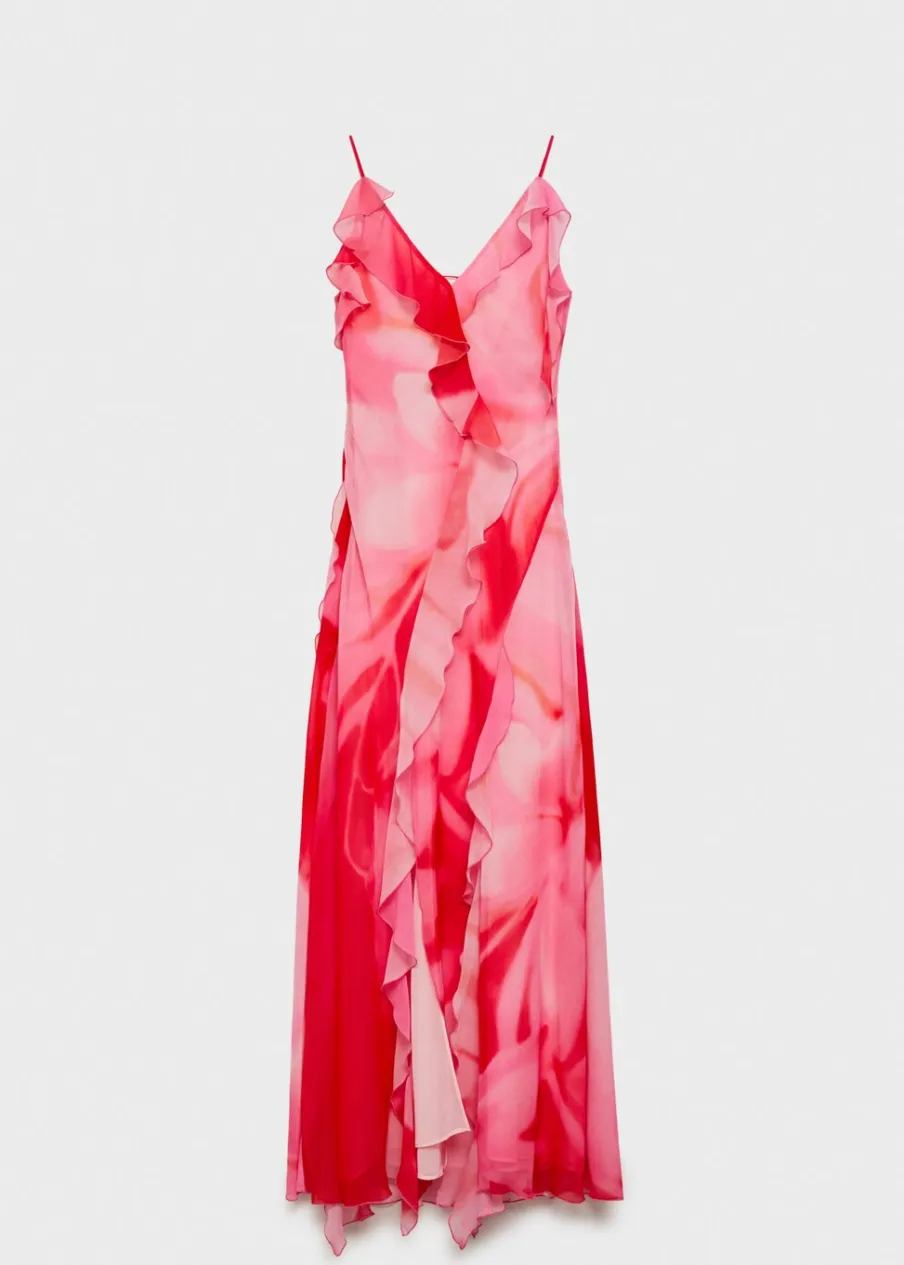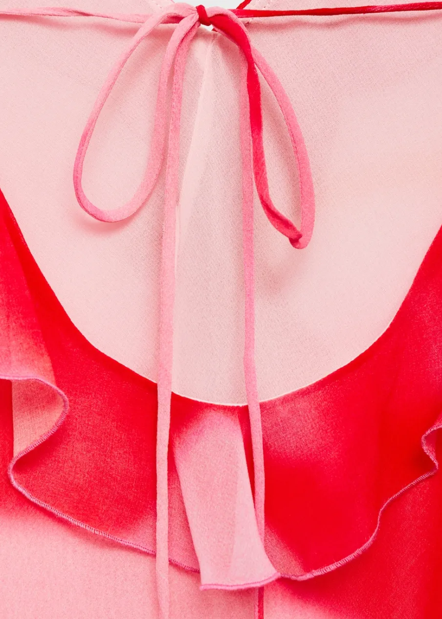 Lejąca tkanina. Model długi. Model z falbankami. Cieniowany deseń. Dekolt. Cienkie ramiączka. Plecy z wycięciem. Wiązanie na plecach. Wewnętrzna podszewka. Kolekcja wizytowa. Model wcięty.