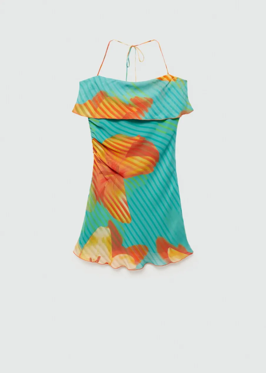 Lejąca tkanina. Krótki krój. Dekolt bez ramiączek. Bez rękawów. Cienkie ramiączka. Wiązanie na szyi. Wewnętrzna podszewka. Wielopozycyjne ramiączka. Tkanina z nadrukiem włoskiego pochodzenia. Wywijany dekolt. Model wcięty.