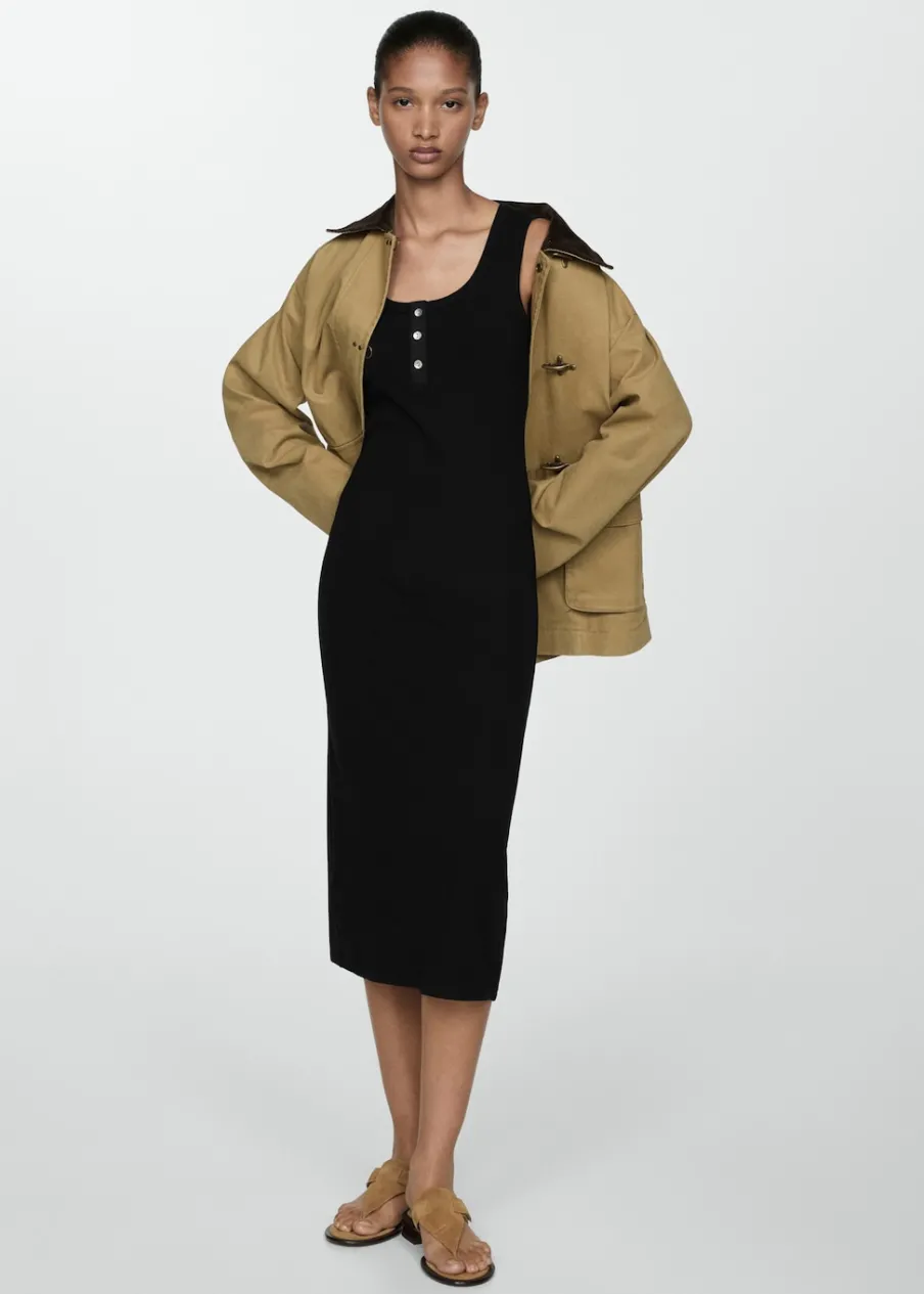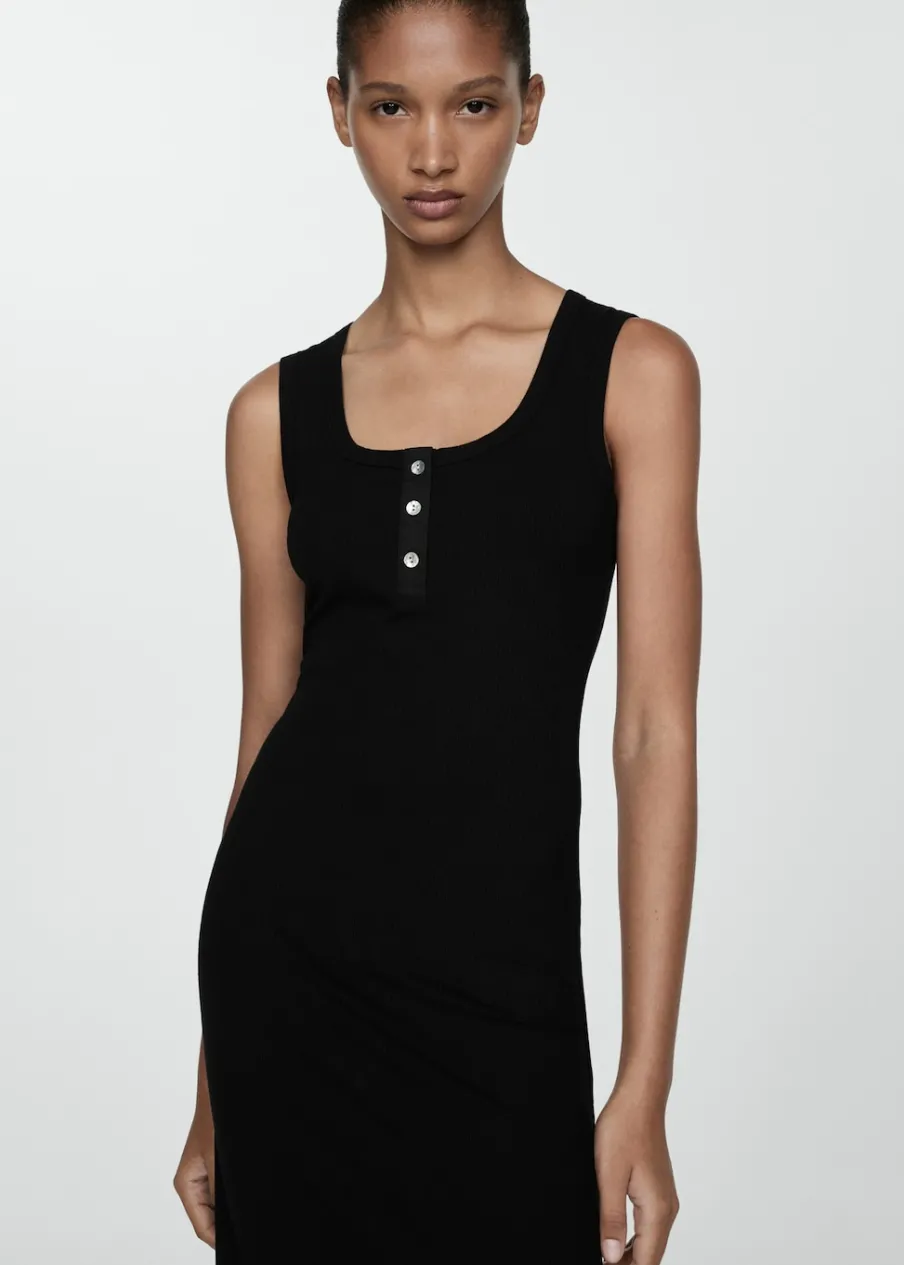 Tkanina ze ściągaczowej dzianiny. Krój do kolan. Model evasé. Okrągły dekolt. Bez rękawów. Szerokie ramiączka. Zapięcie z przodu na guziki. Satynowe wykończenia.