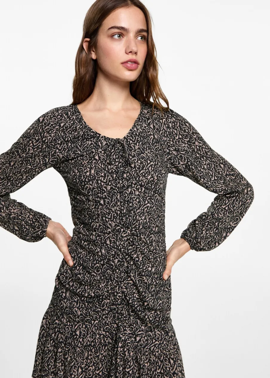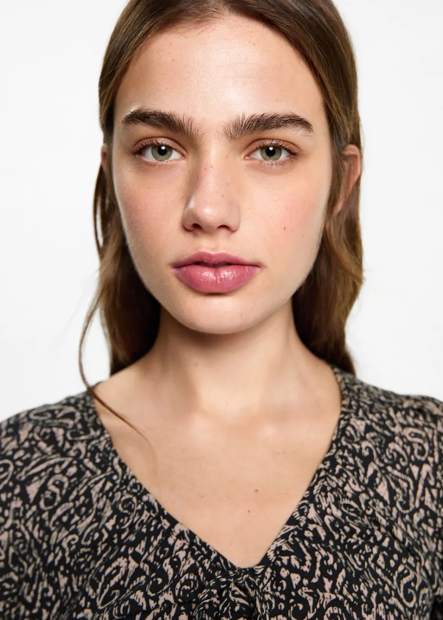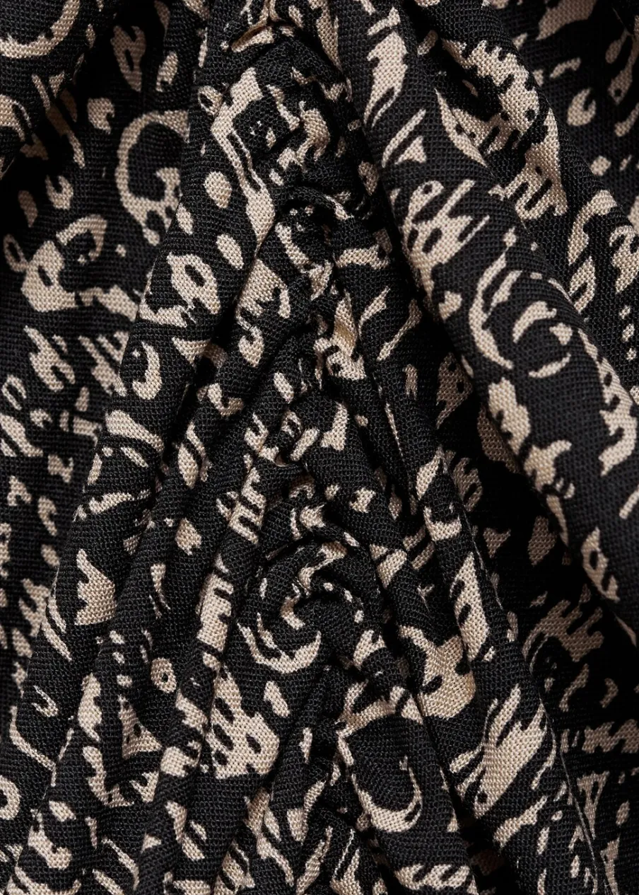 Lejąca tkanina. Nadruk. Krótki krój. Model evasé. Marszczony detal na środku. Modelka ma 172 cm wzrostu i nosi rozmiar M.