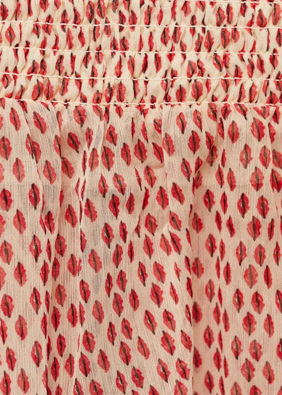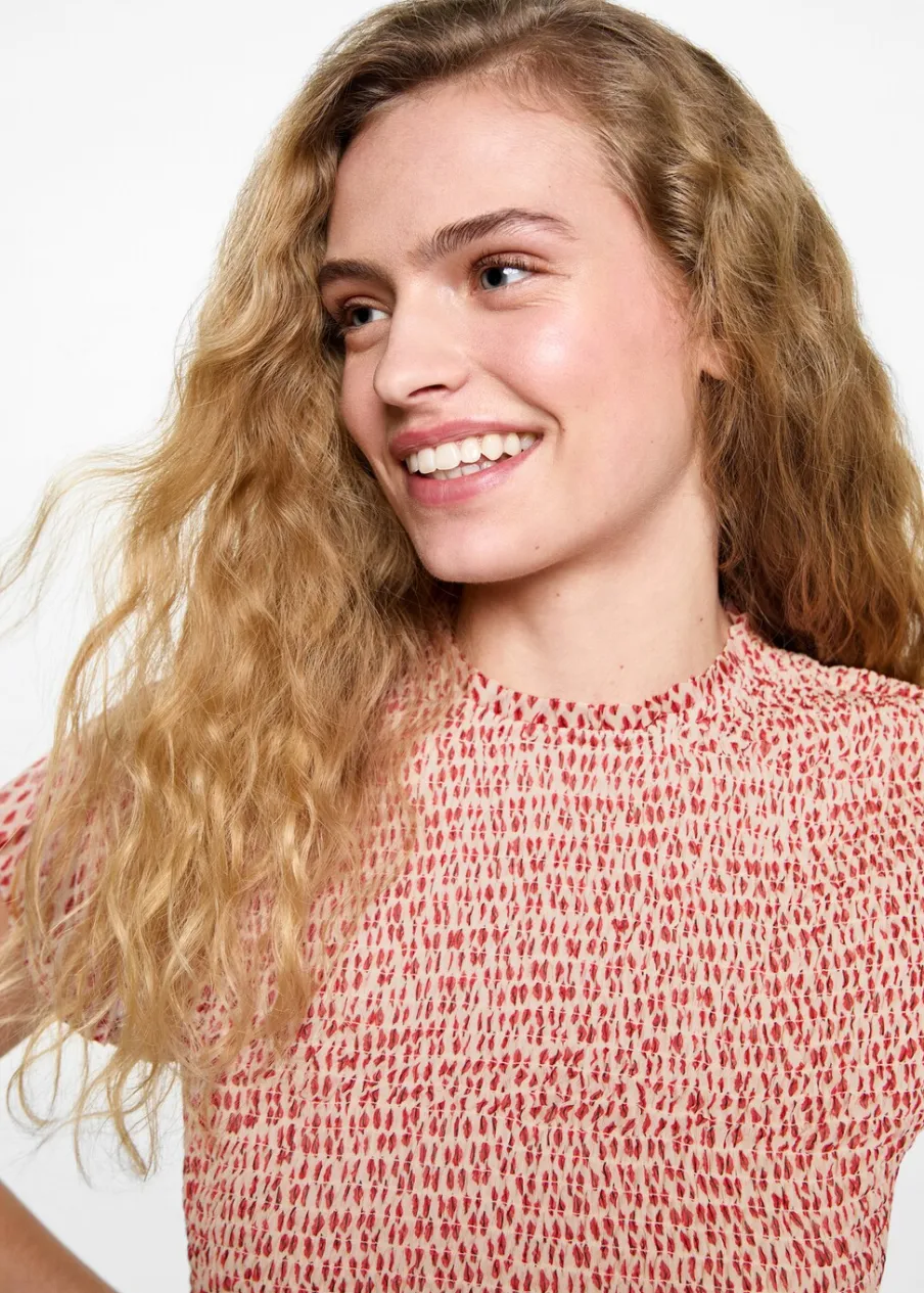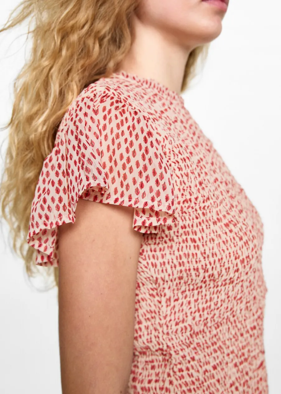 Krótki krój. Marszczona tkanina. Okrągły dekolt z marszczeniem. Krótki rękaw z falbanką.