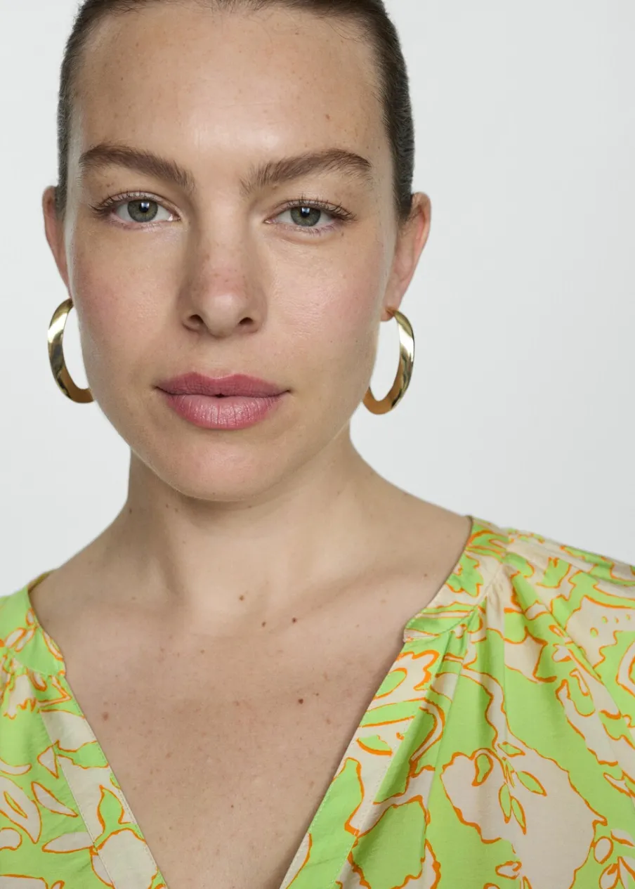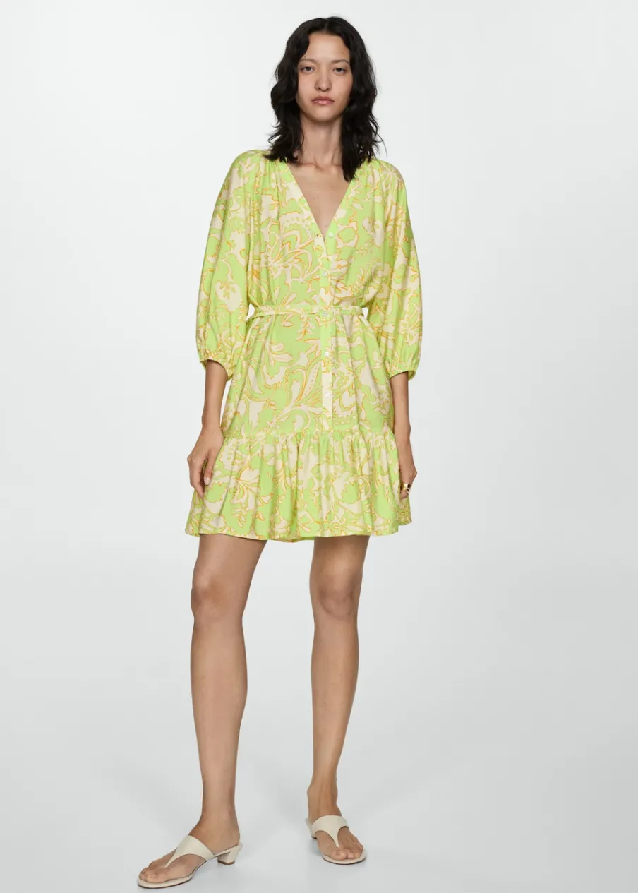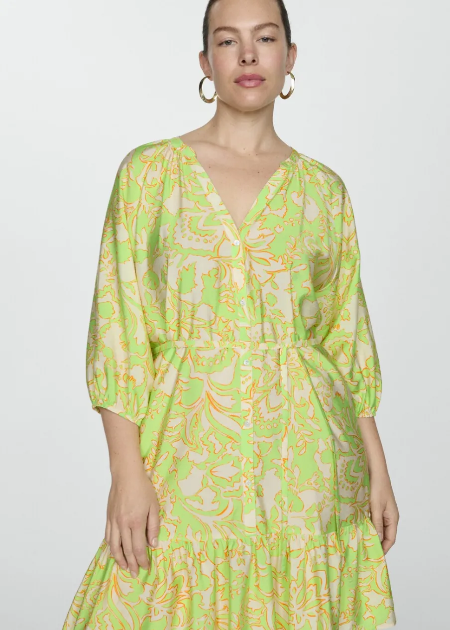 Lejąca tkanina. Model evasé. Krótki krój. Dekolt V. Rękaw trzy czwarte wykończony elastycznym mankietem. Wiązane zapięcie. Detal z falbaną. Dostępne w Plus Size. Nadruk. Zapięcie na guziki z przodu.