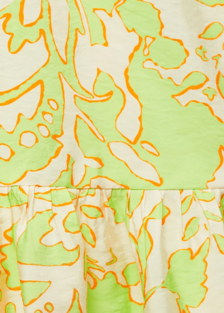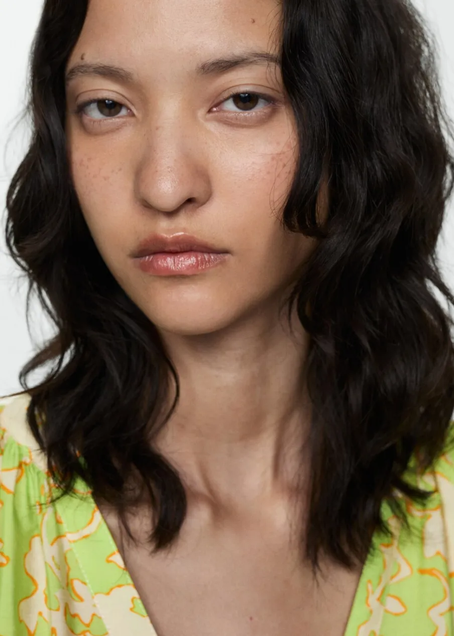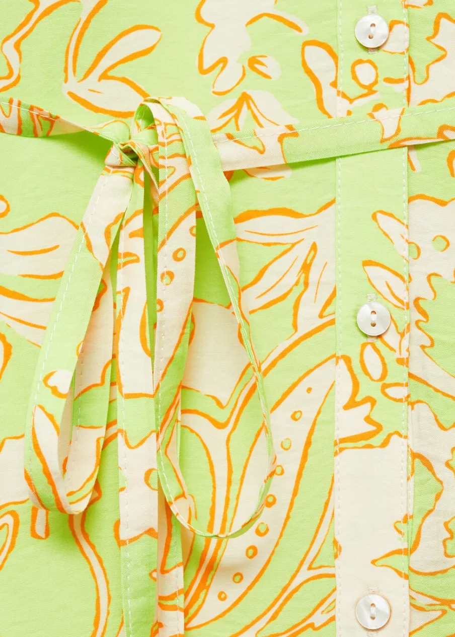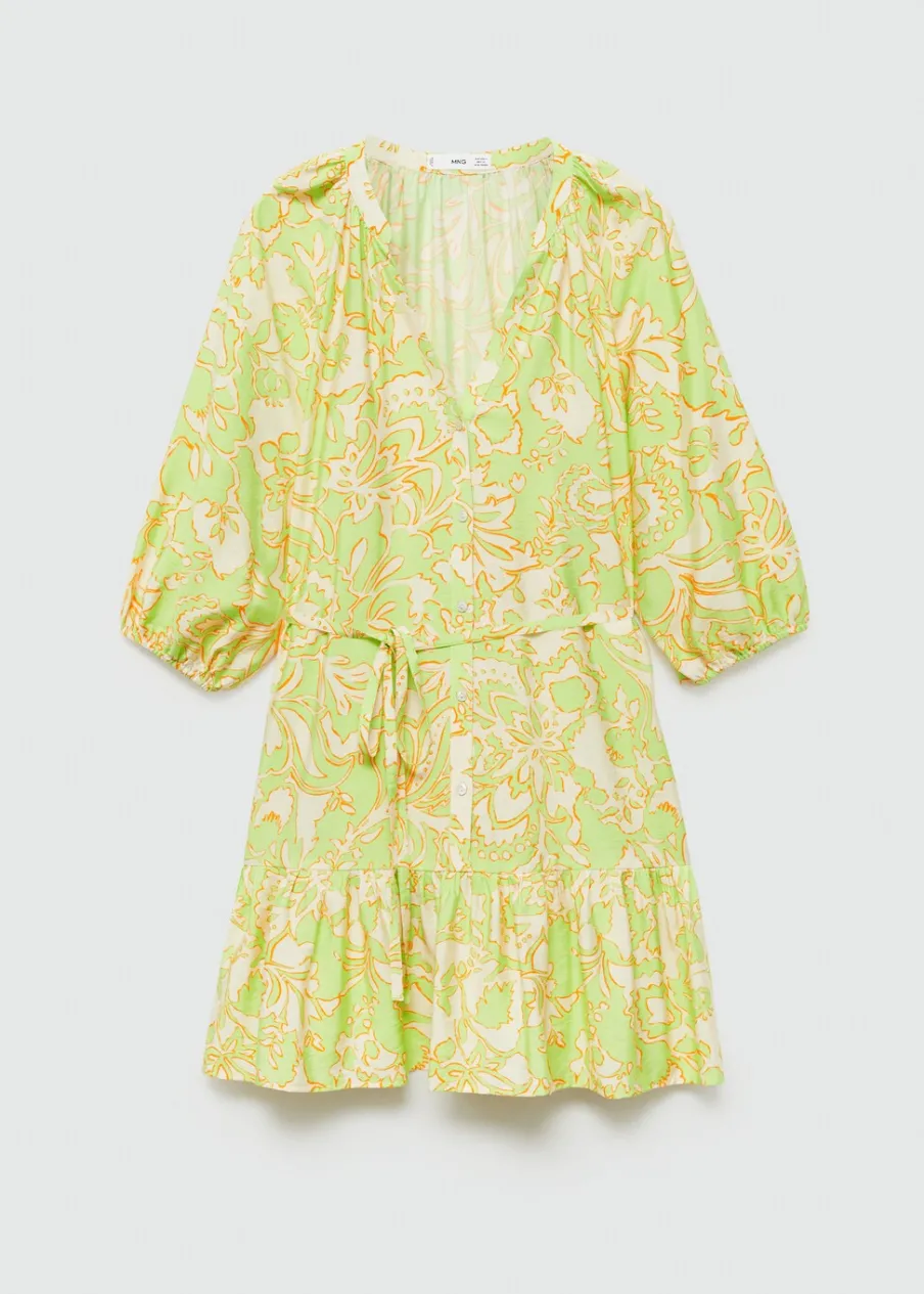 Lejąca tkanina. Model evasé. Krótki krój. Dekolt V. Rękaw trzy czwarte wykończony elastycznym mankietem. Wiązane zapięcie. Detal z falbaną. Dostępne w Plus Size. Nadruk. Zapięcie na guziki z przodu.