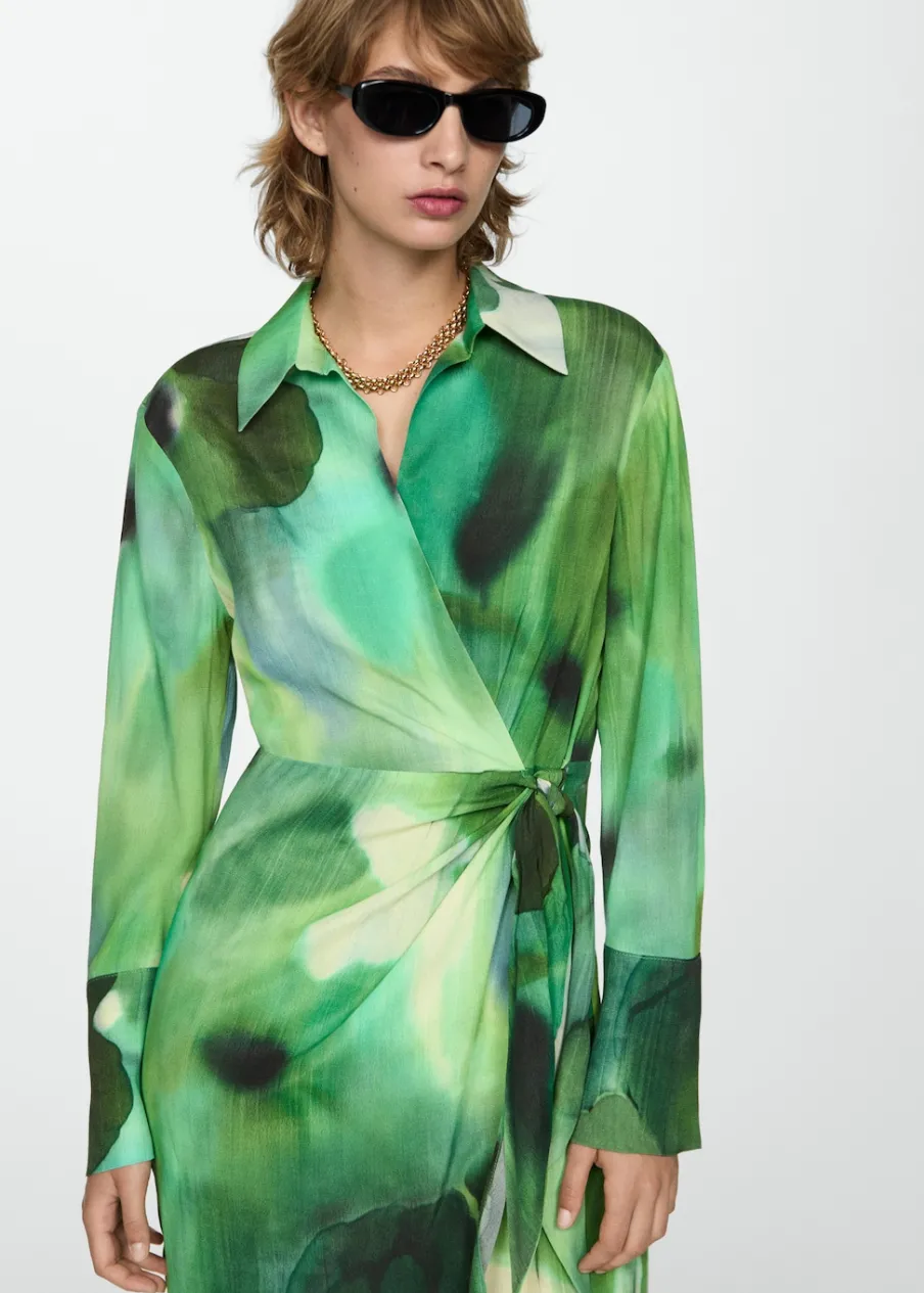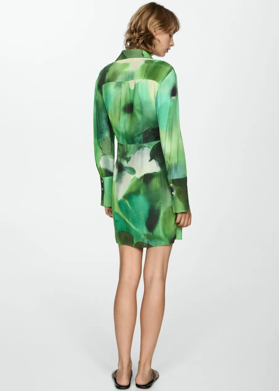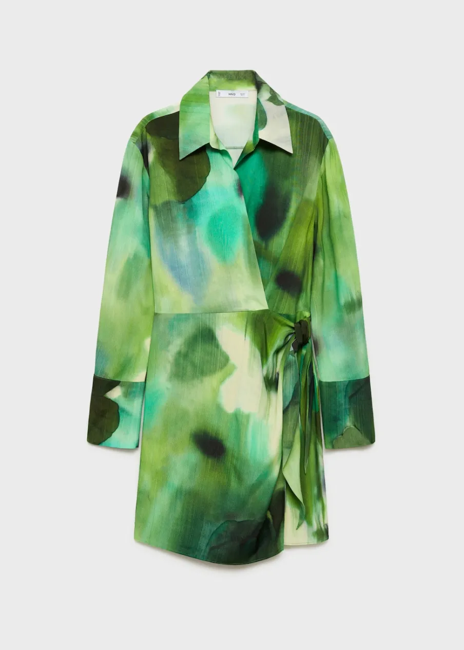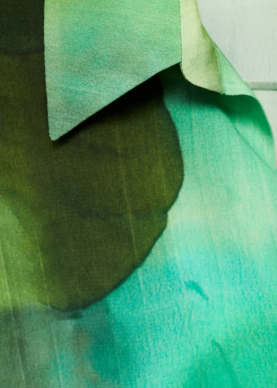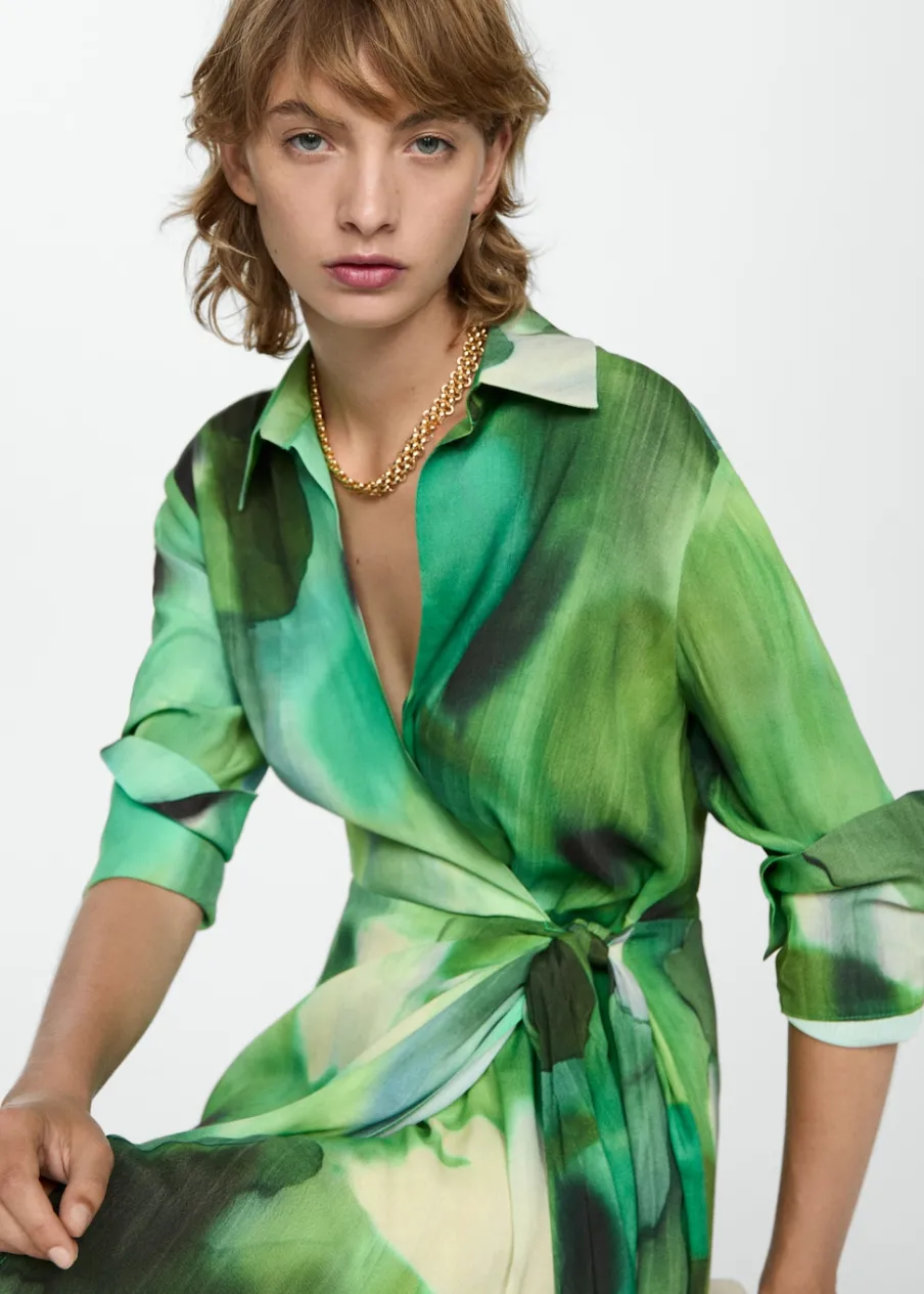 Lejąca tkanina. Krótki krój. Model prosty. Koszulowy kołnierz. Długi rękaw z guzikami na mankietach. Wiązanie z boku. Wewnętrzna podszewka. Nadruk.