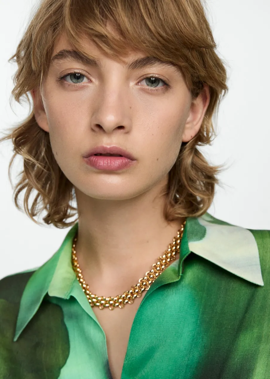 OpisLejąca tkanina. Krótki krój. Model prosty. Koszulowy kołnierz. Długi rękaw z guzikami na mankietach. Wiązanie…