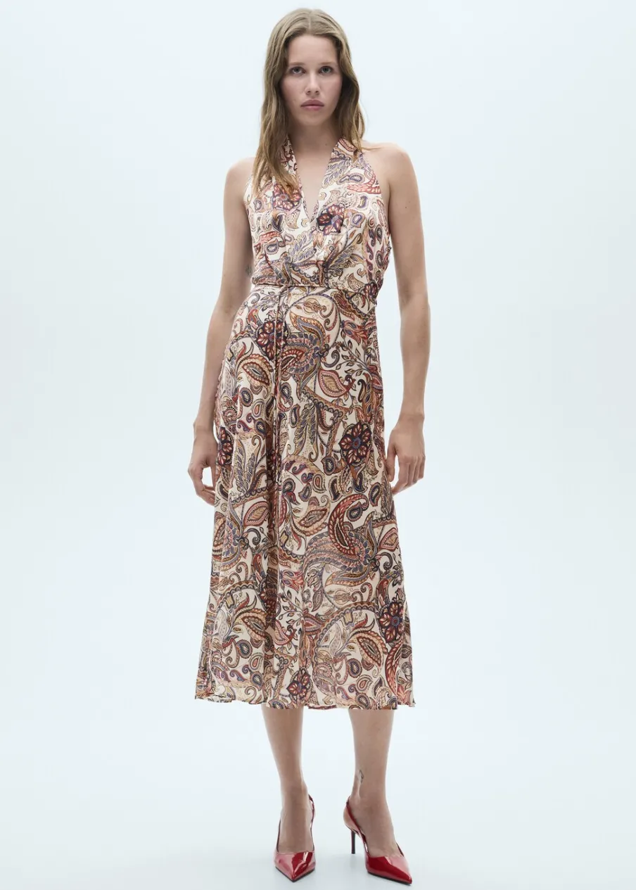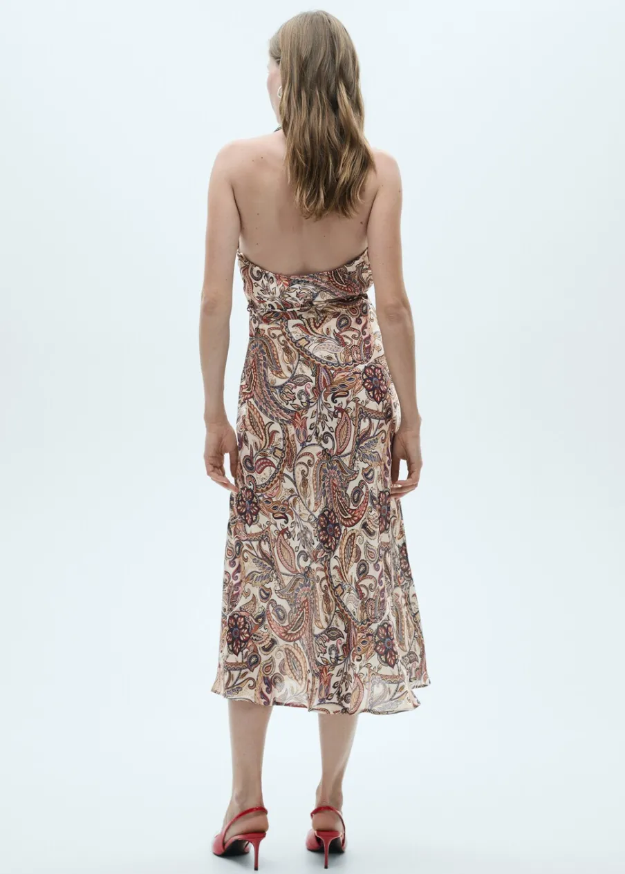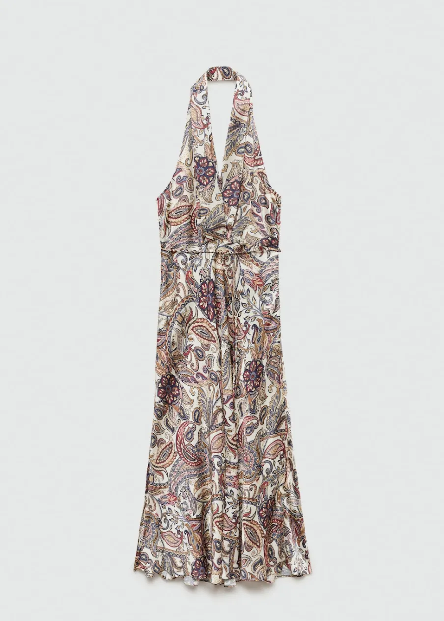 OpisLejąca tkanina. Model prosty. Krój do kolan. Kwiatowy wzór. Dekolt w stylu halter. Bez rękawów. Kryte zapięcie…