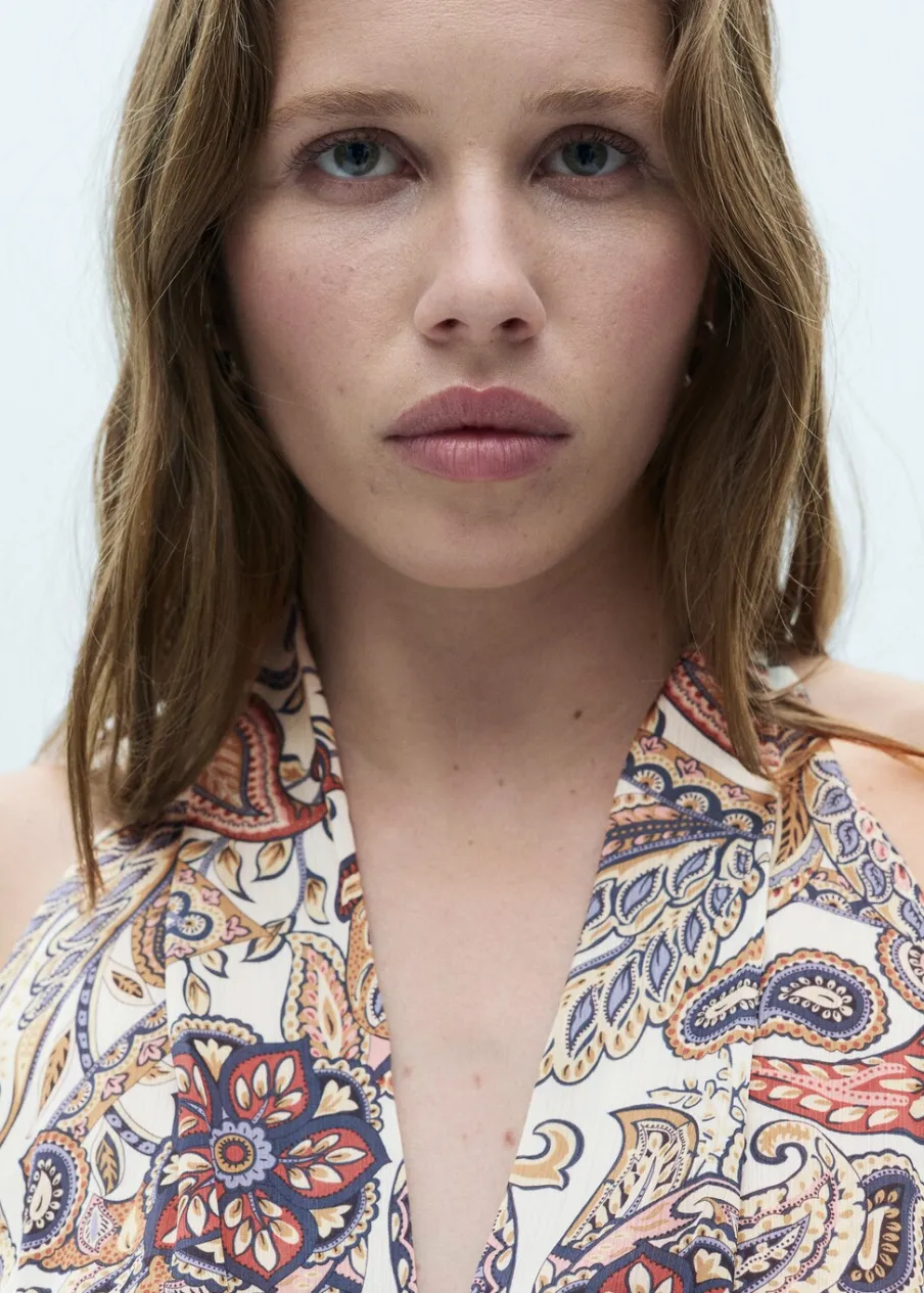 Lejąca tkanina. Model prosty. Krój do kolan. Kwiatowy wzór. Dekolt w stylu halter. Bez rękawów. Kryte zapięcie na zamek z boku. Regulowane wiązanie w talii. Modelka ma 175 cm wzrostu i nosi rozmiar S/36.