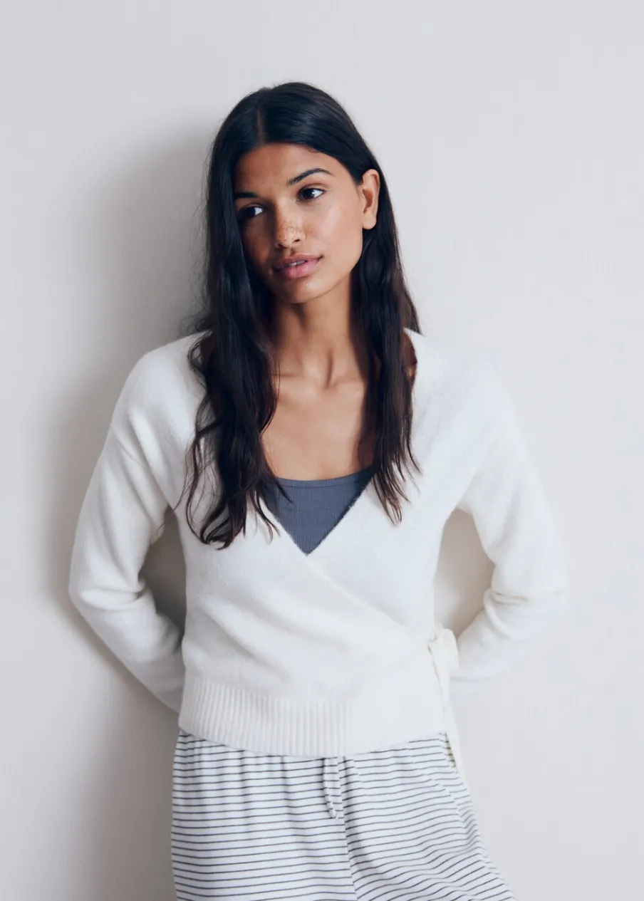 Dekolt V. Model zakładany. Modelka ma 172 cm wzrostu i nosi rozmiar M. Długi rękaw. Model prosty. Powrót do szkoły. Sznurek wiązany na krzyż.