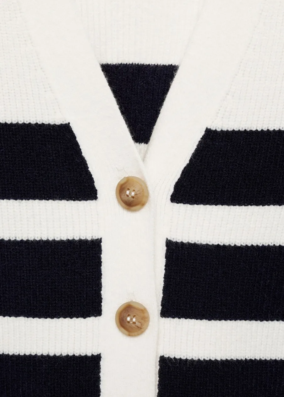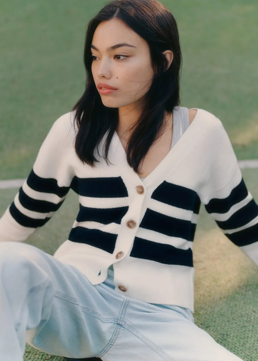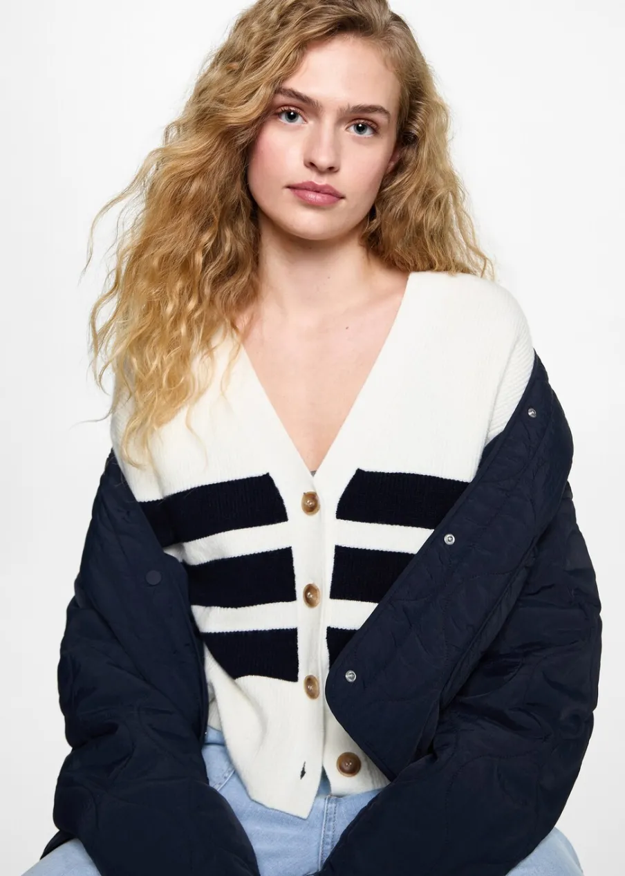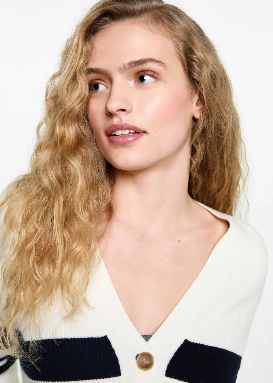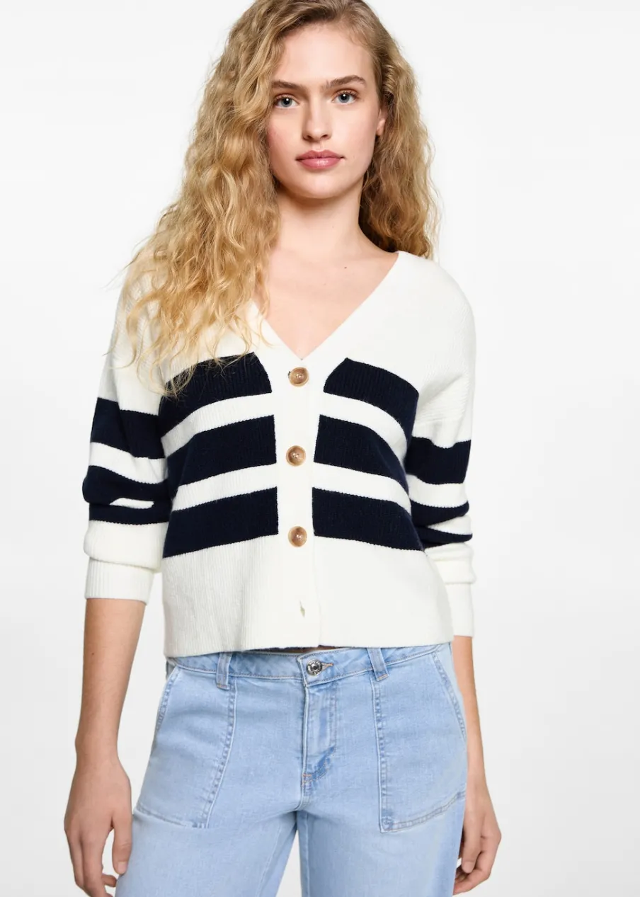 Tkanina z cienkiej dzianiny. Model prosty. Dekolt V. Zapięcie na guziki z przodu.