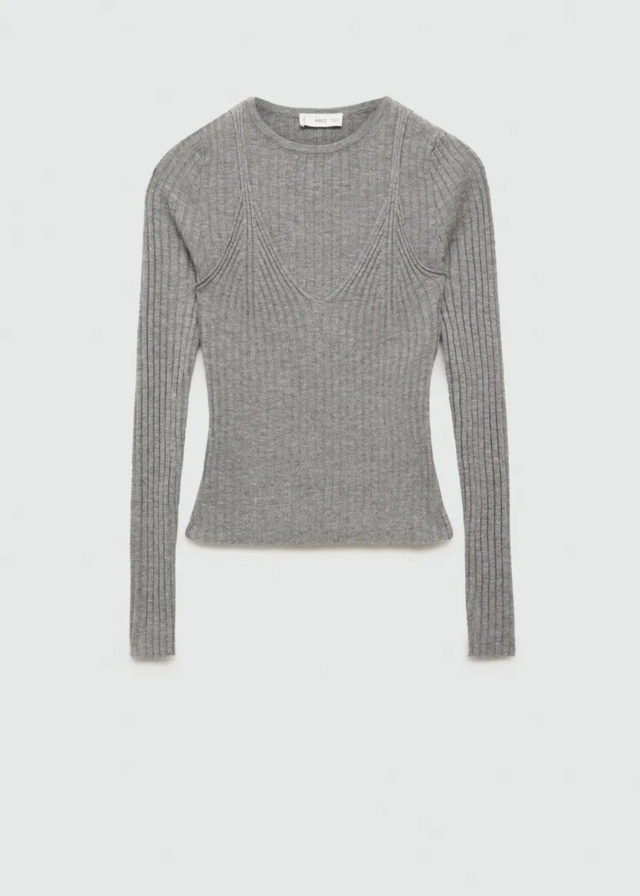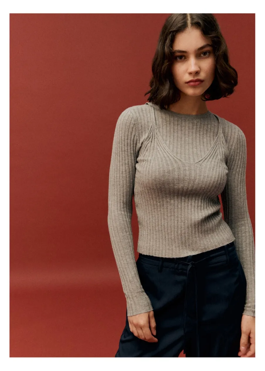 Tkanina z cienkiej dzianiny. Ściągaczowa dzianina. Slim-fit. Okrągły dekolt. Długi rękaw. Powrót do szkoły. Warstwowy fason. Imitacja topu.